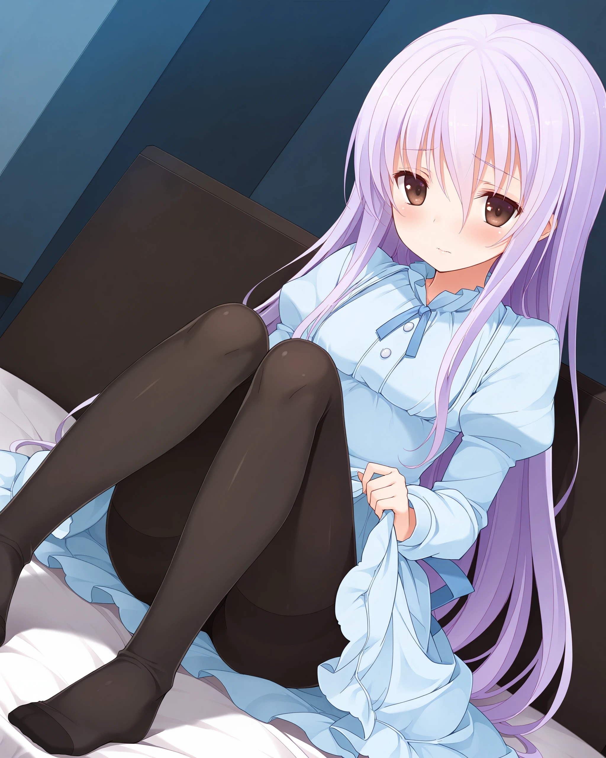 light blue long_dress, blue lace-up, blue shoes, black_pantyhose,