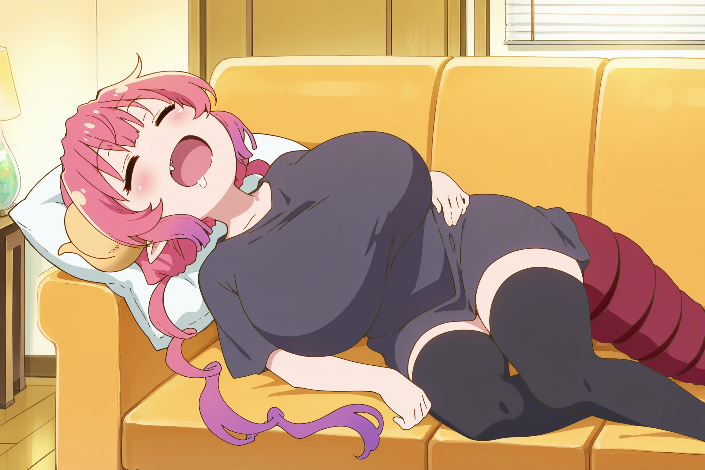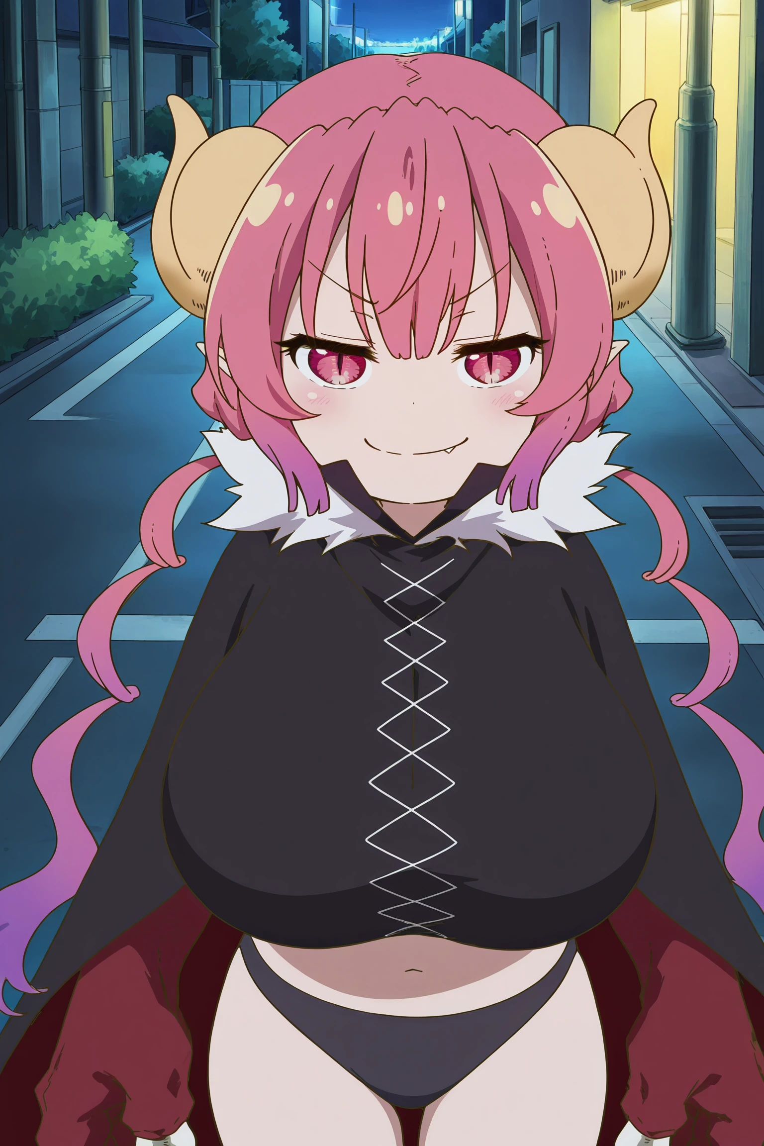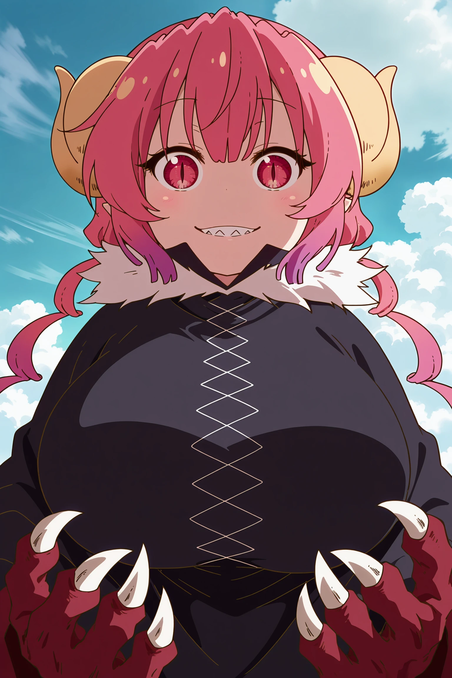 Essential keywords: ilulu (maidragon), long hair, pink hair (or red hair), purple hair, gradiant hair, twintails, dragon girl, dragon horns, huge breasts, red eyes, slit pupils, pointy ears