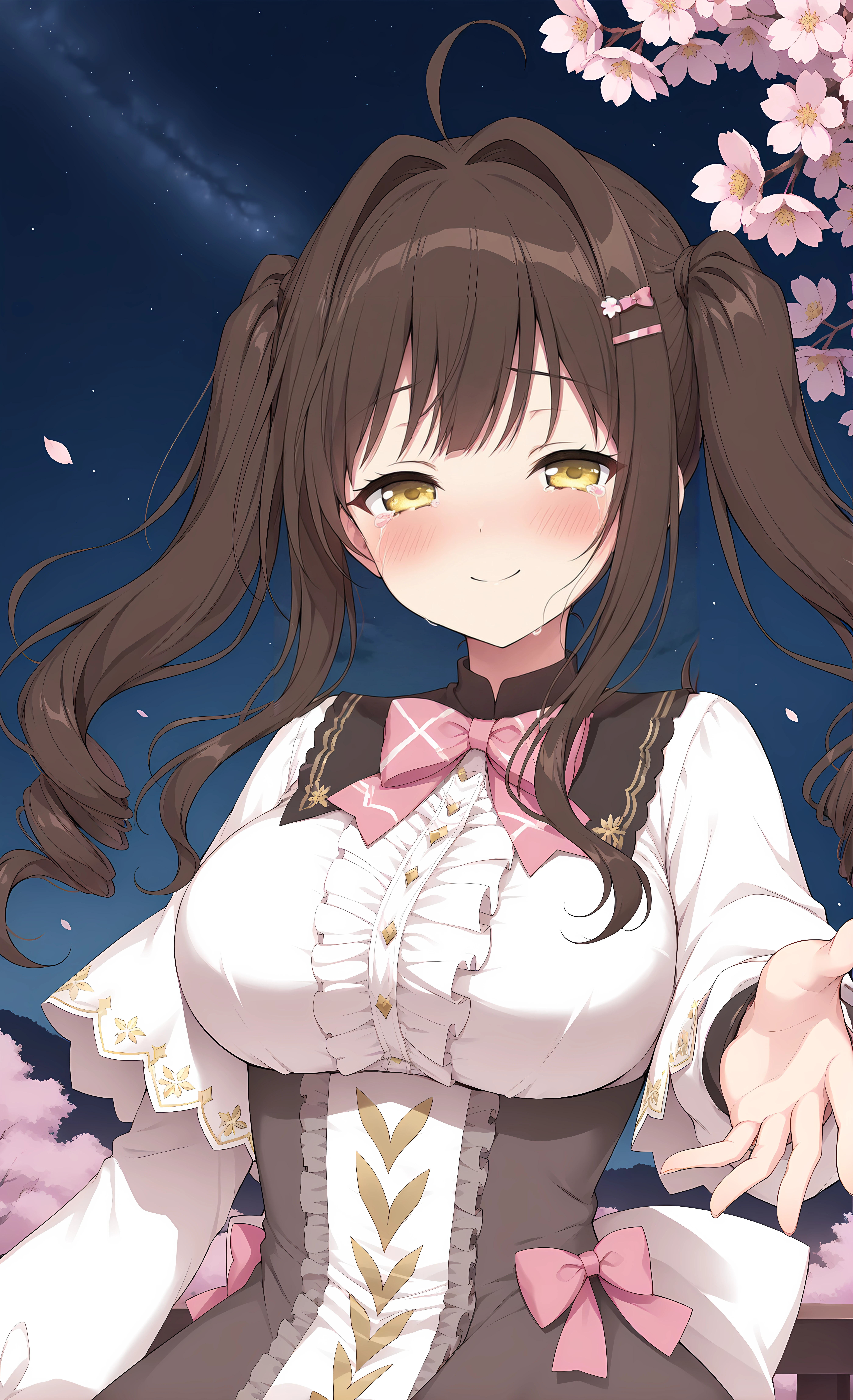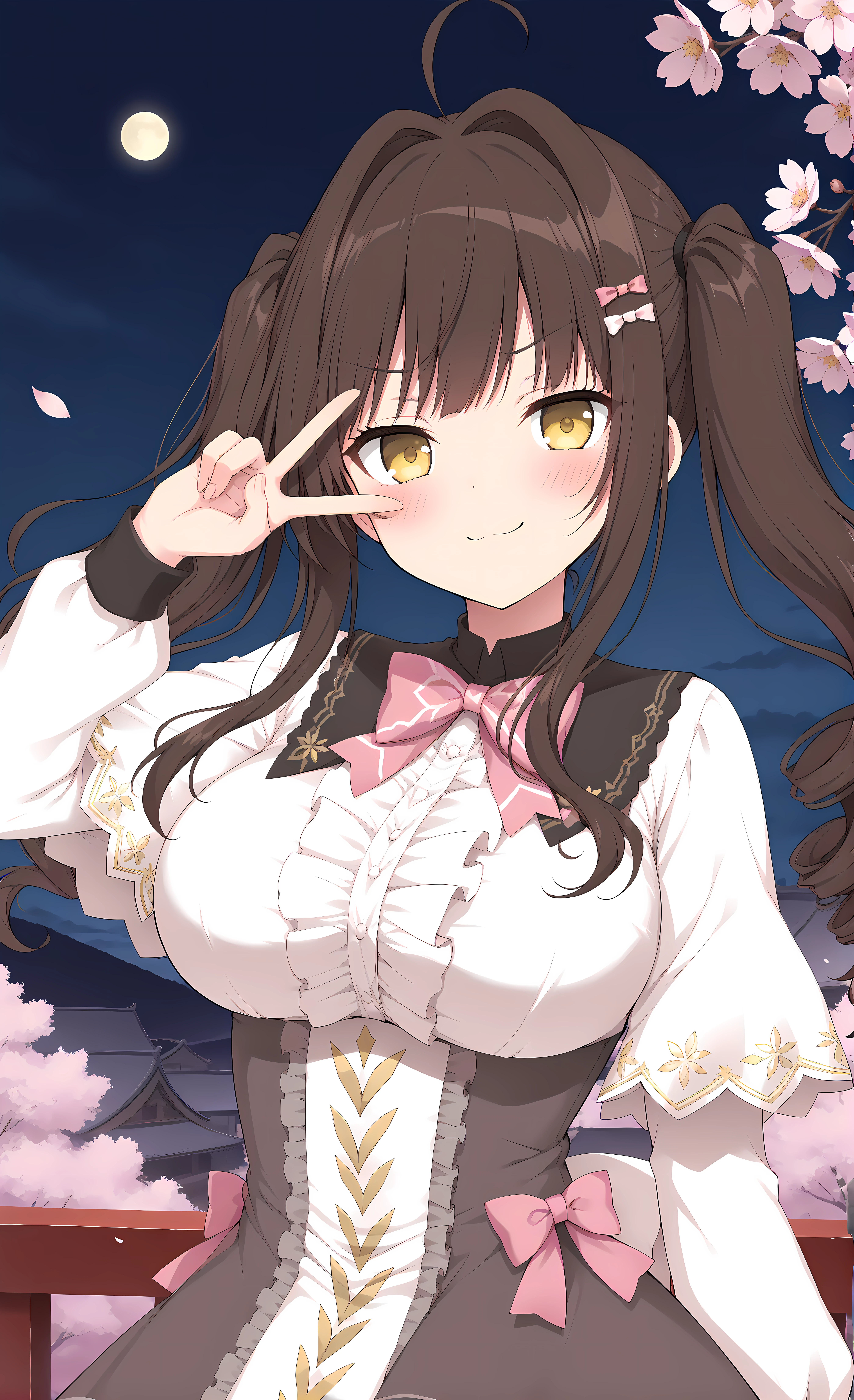 Basic: riko,yellow eyes,long hair,brown hair,ahoge,hair intakes,twintails,bangs,hair ornament,large breasts,