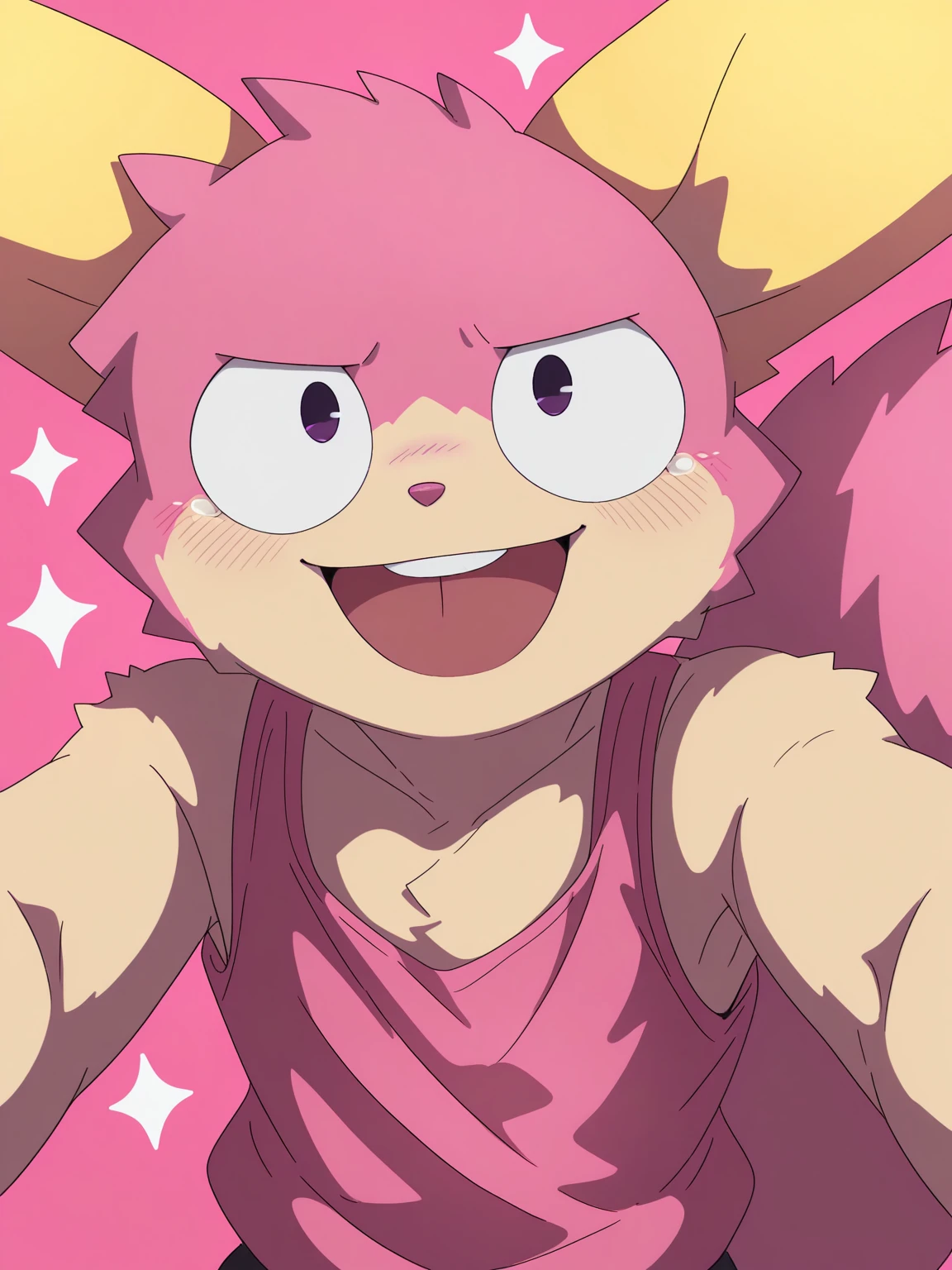 hoshino_uyu, furry, furry male, yellow ear, big tail, pink and beige fur, sanpaku, purple eyes, pink tanktop, purple bottoms, brown shoes,