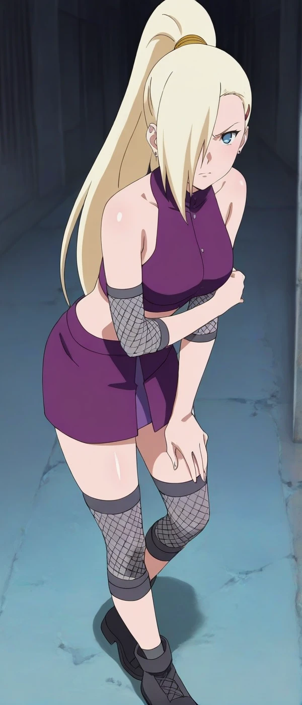 purple crop top, fishnets, elbow pads fishnets, knee fishnets, purple skirt, earrings, black shoes,