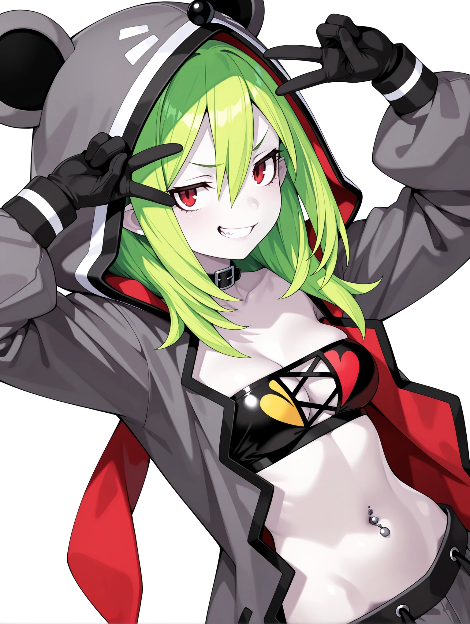 l_clothes,choker,animal hood,grey hoodie,black gloves,navel piercing,baggy grey pants,lace-up boots,black footwear,