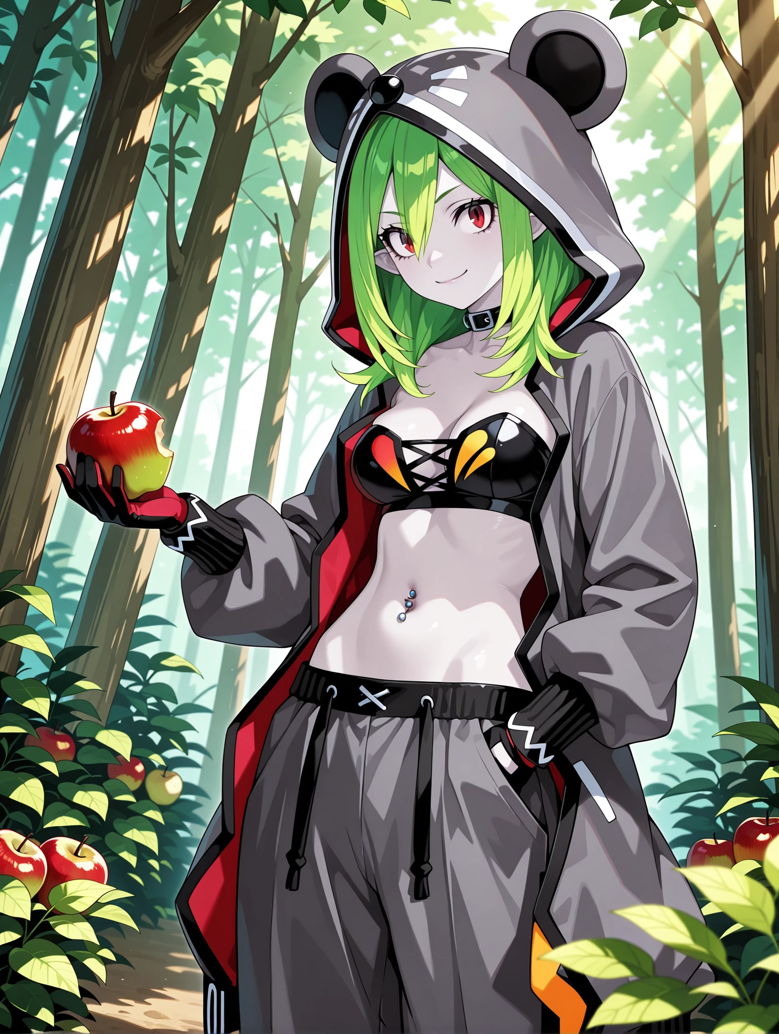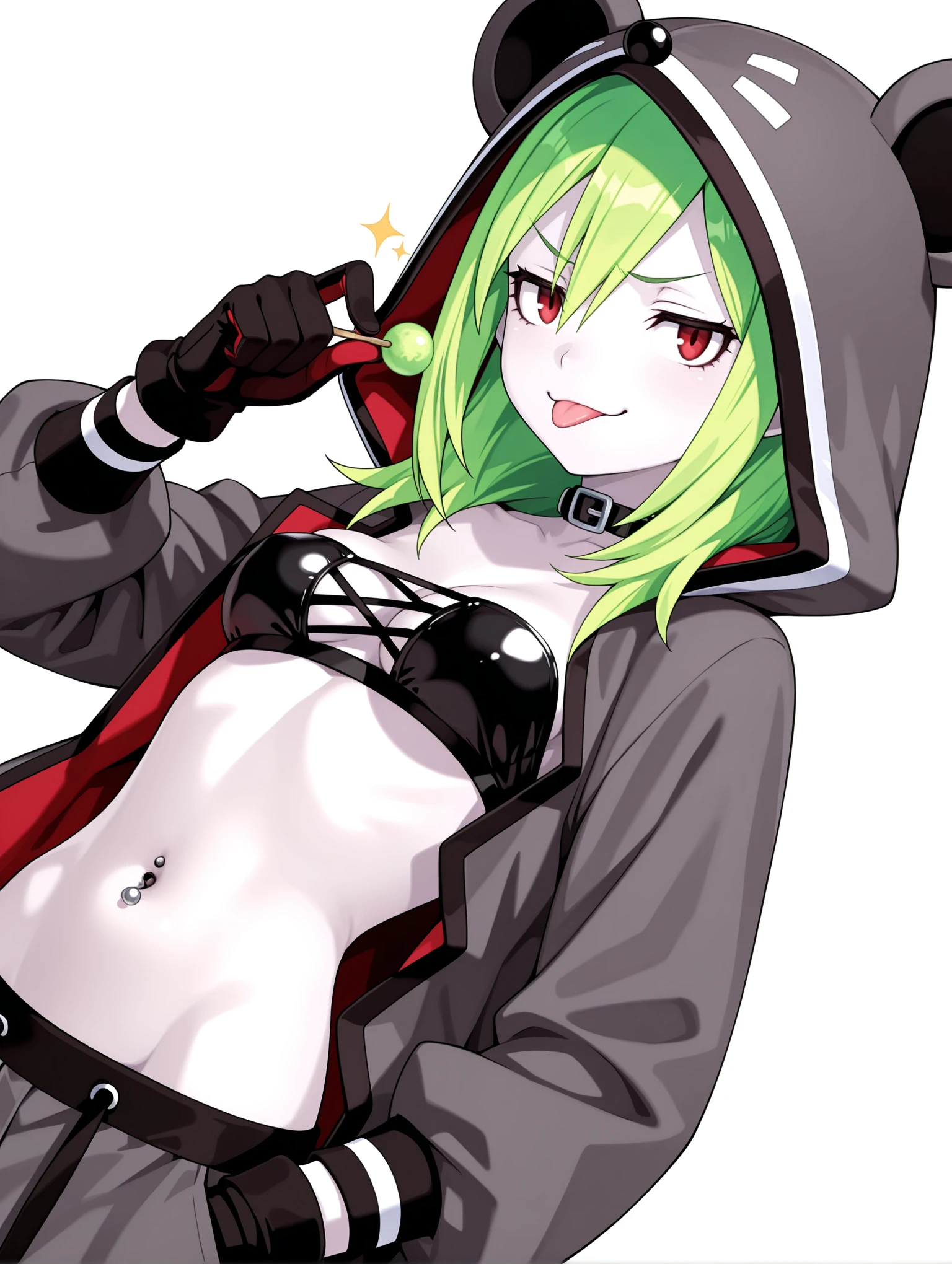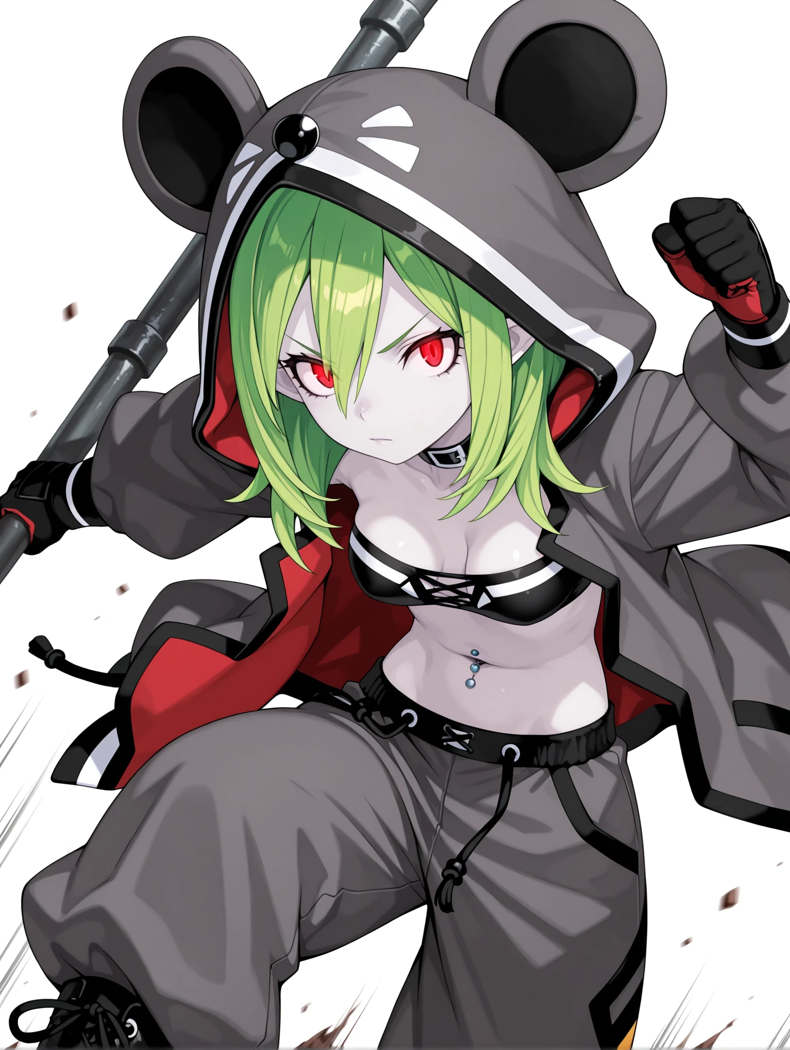 衣装 ・l_clothes,choker,animal hood,grey hoodie,black gloves,navel piercing,baggy grey pants,lace-up boots,black footwear,