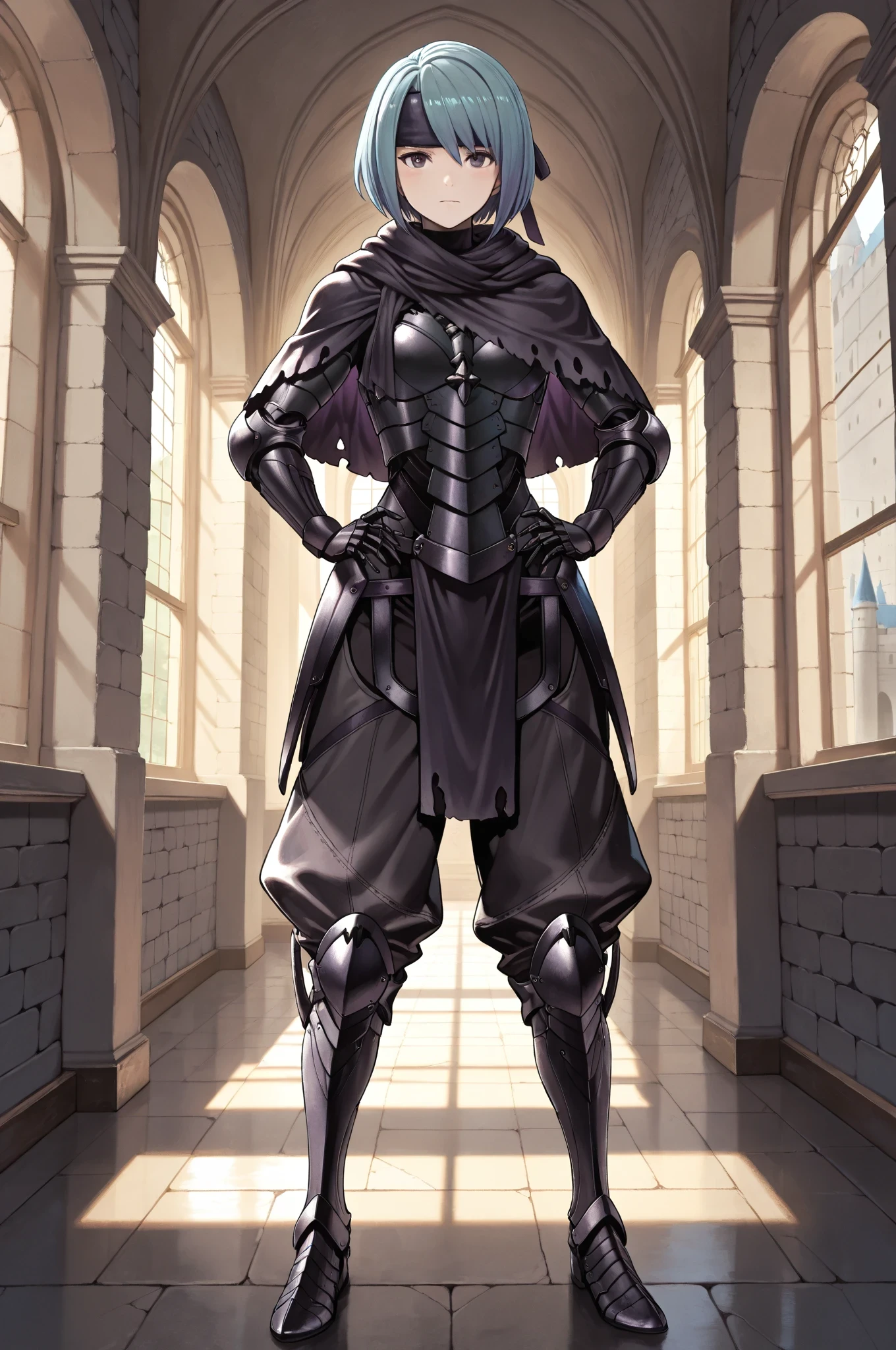 capelet, armor, gauntlets, baggy pants, armored boots,
