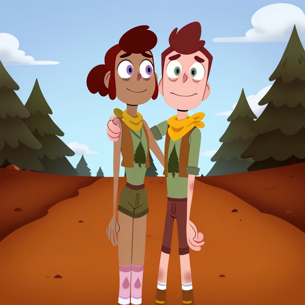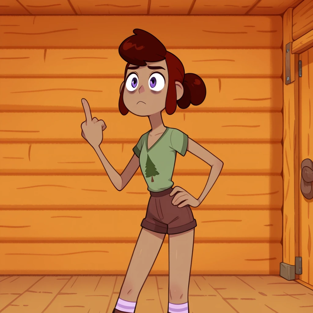 green t-shirt,v-neck,pine tree print t-shirt,brown shorts,pink thighhighs,brown knee boots