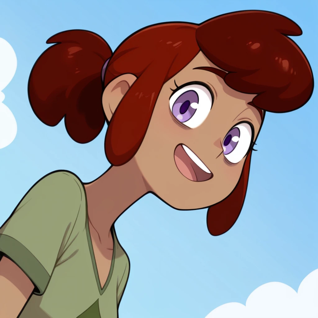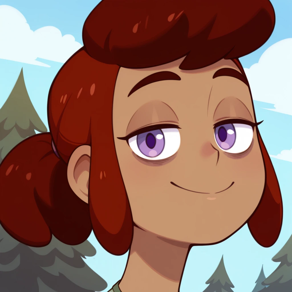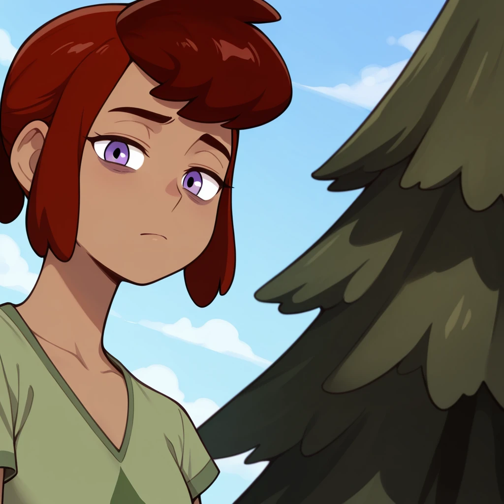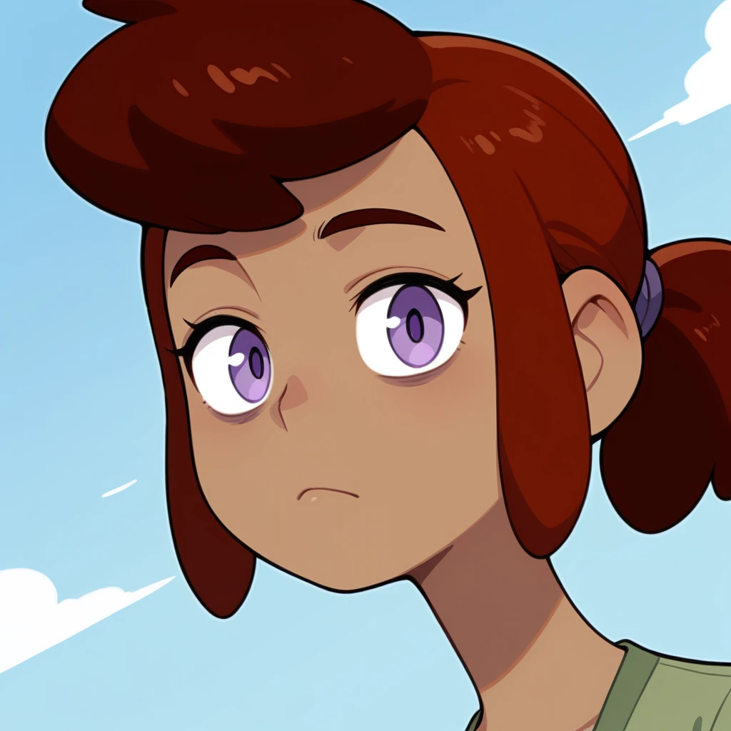 dark skin,purple eyes,two-toned hair,ponytail,red hair,brown hair