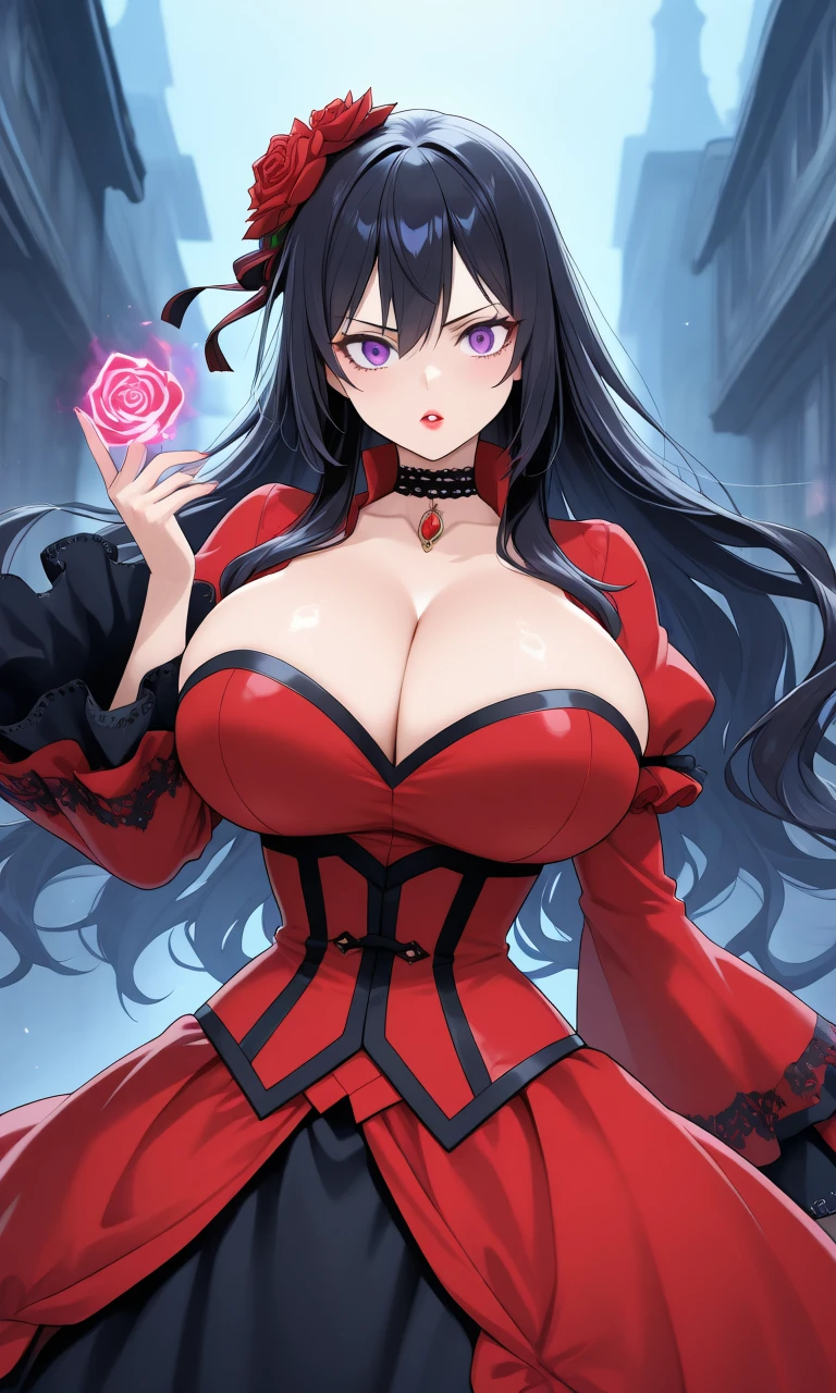 (dumb_ScarletHGOE,1girl,black hair,long hair,purple eyes,headwear,ribbon,red rose,red lipstick),