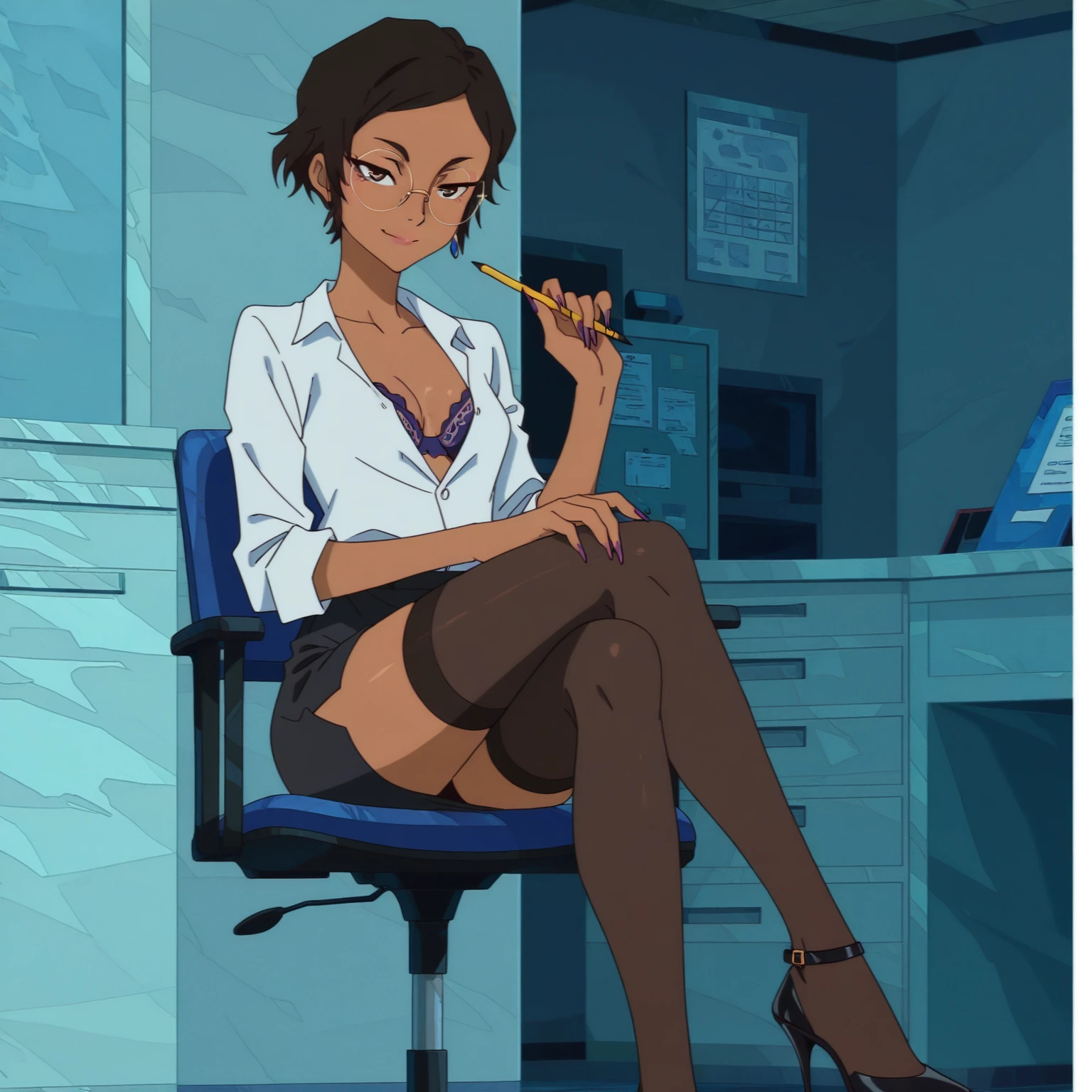 brown hair, short hair, brown eyes, slender body, small breasts, nose, lips, dark-skinned woman, anime screencap, original style