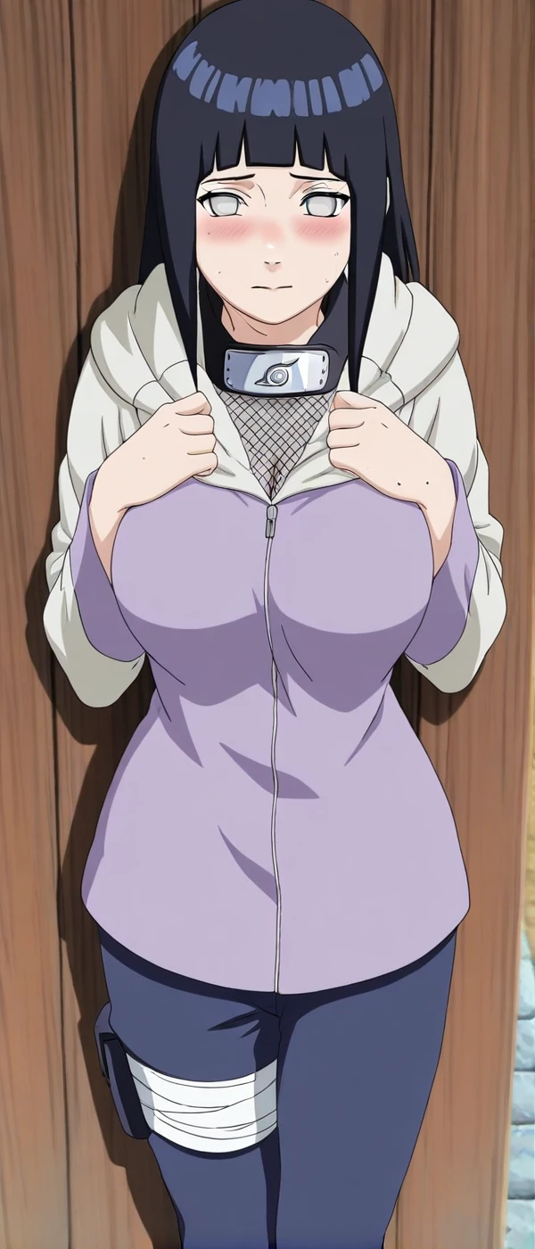 long sleeves, hood, jacket, blue pants, pants, sandals, black sandals, forehead protector, konohagakure symbol, fishnets,