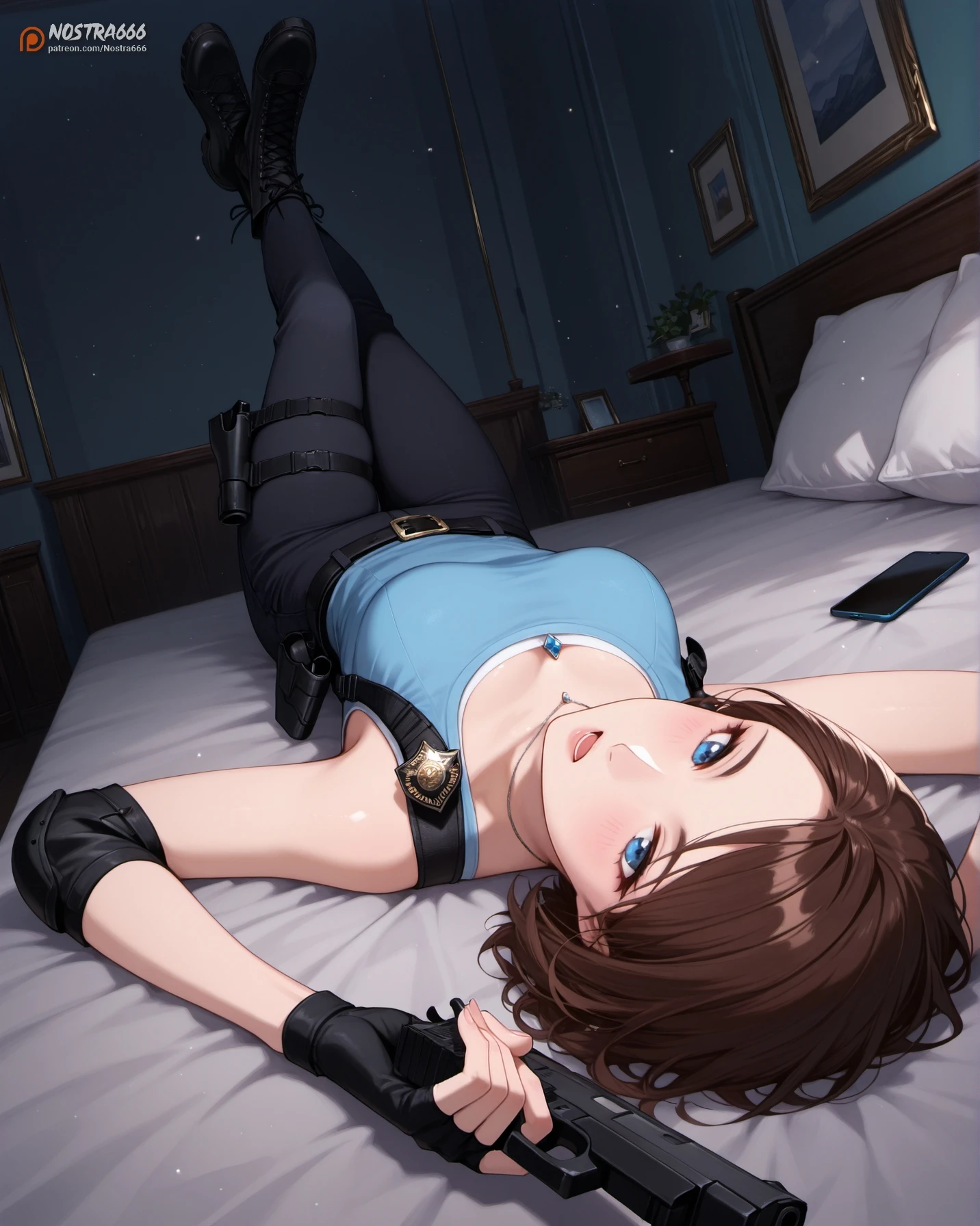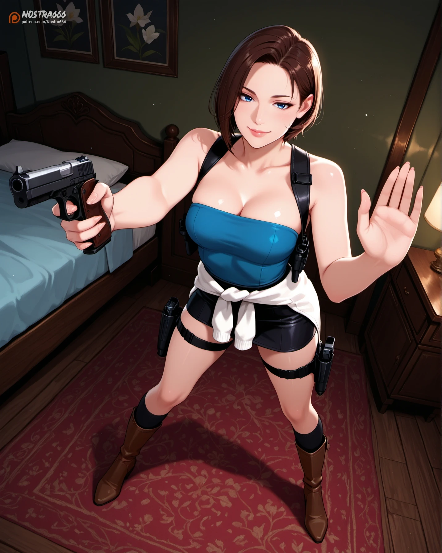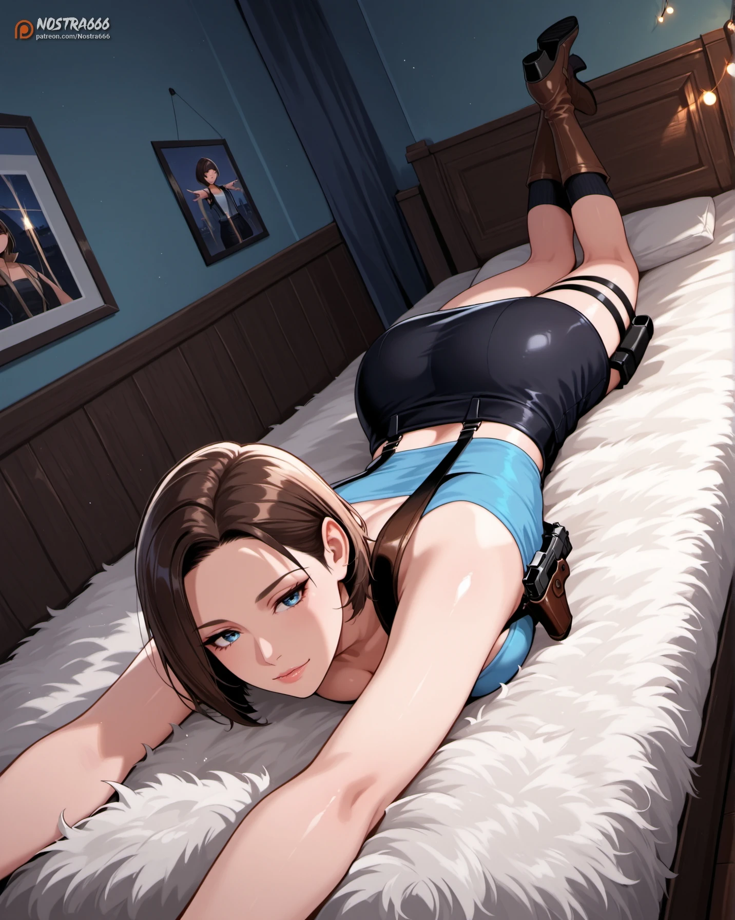 (NostraJillValentine, brown hair, bob cut, asymmetrical hair, short hair, blue eyes, swept bangs, medium breasts:1.1),
