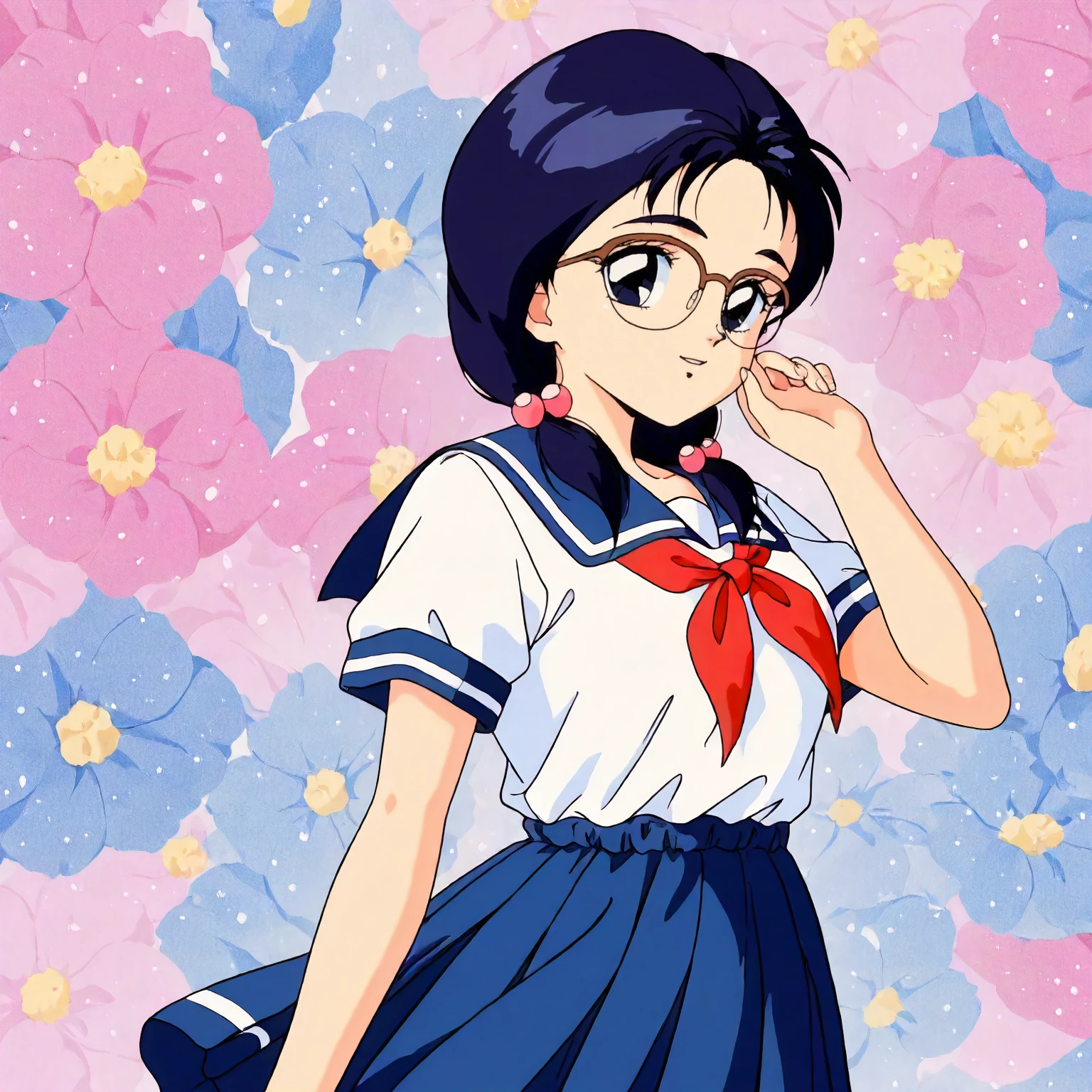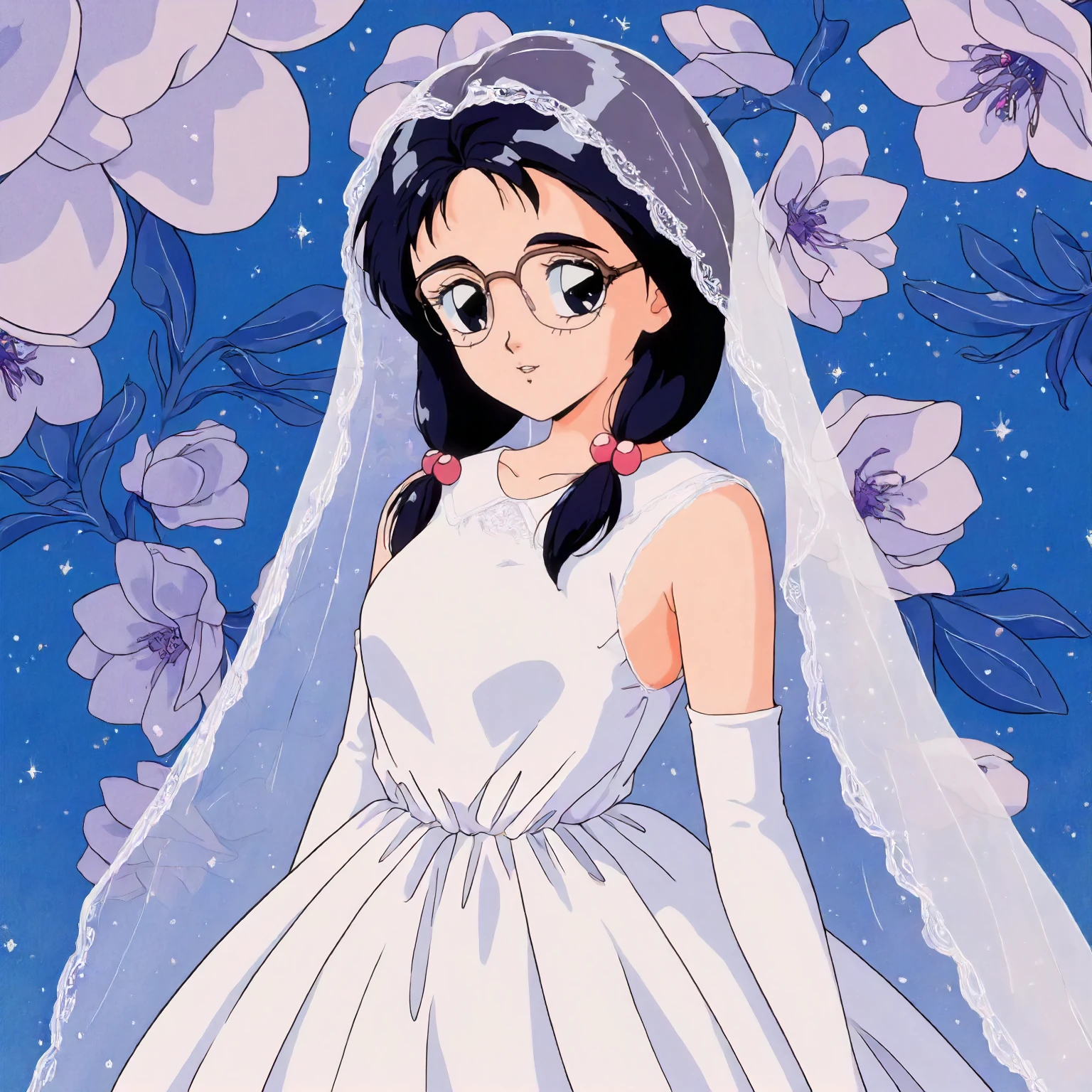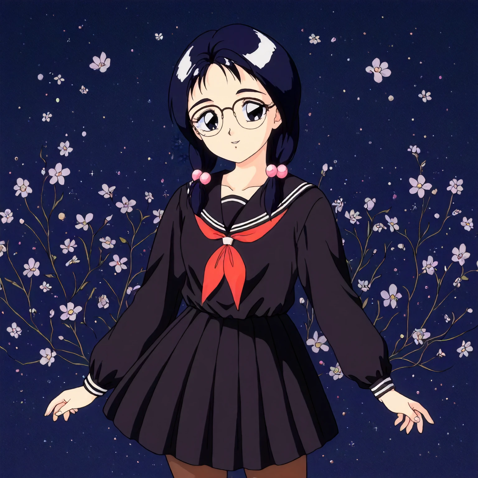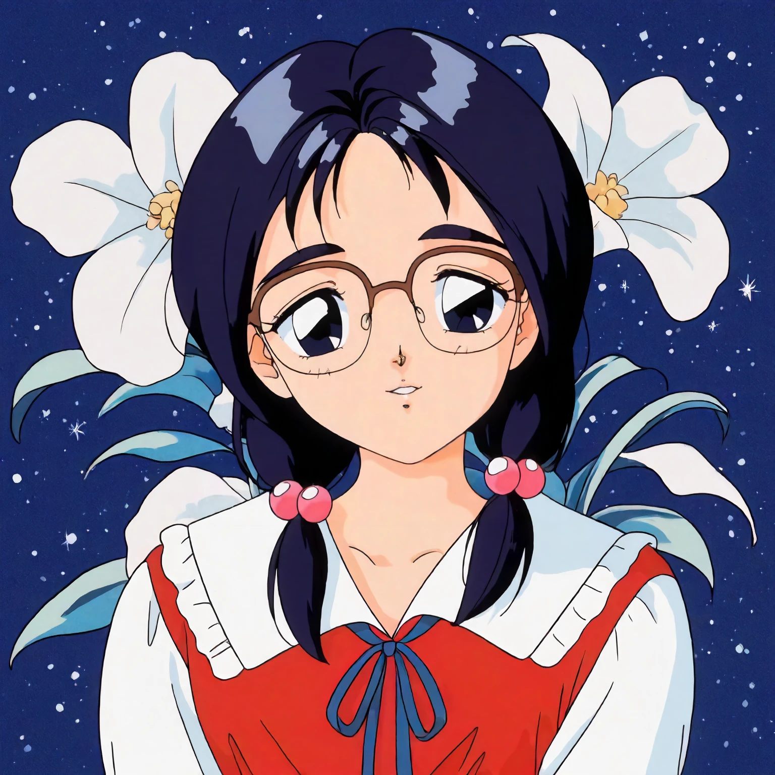 anime coloring,retro artstyle,1990s \(style\), matsubara_hazuki\(zoku_hatsukoi_monogatari\),1girl,black blue hair,low twintails,hair bobbles,black blue eyes, glasses,