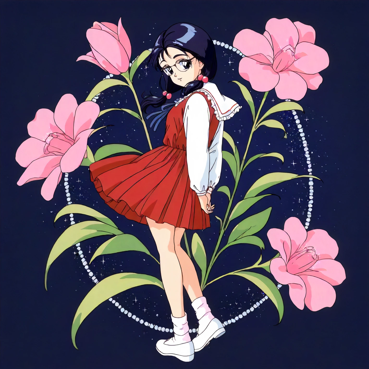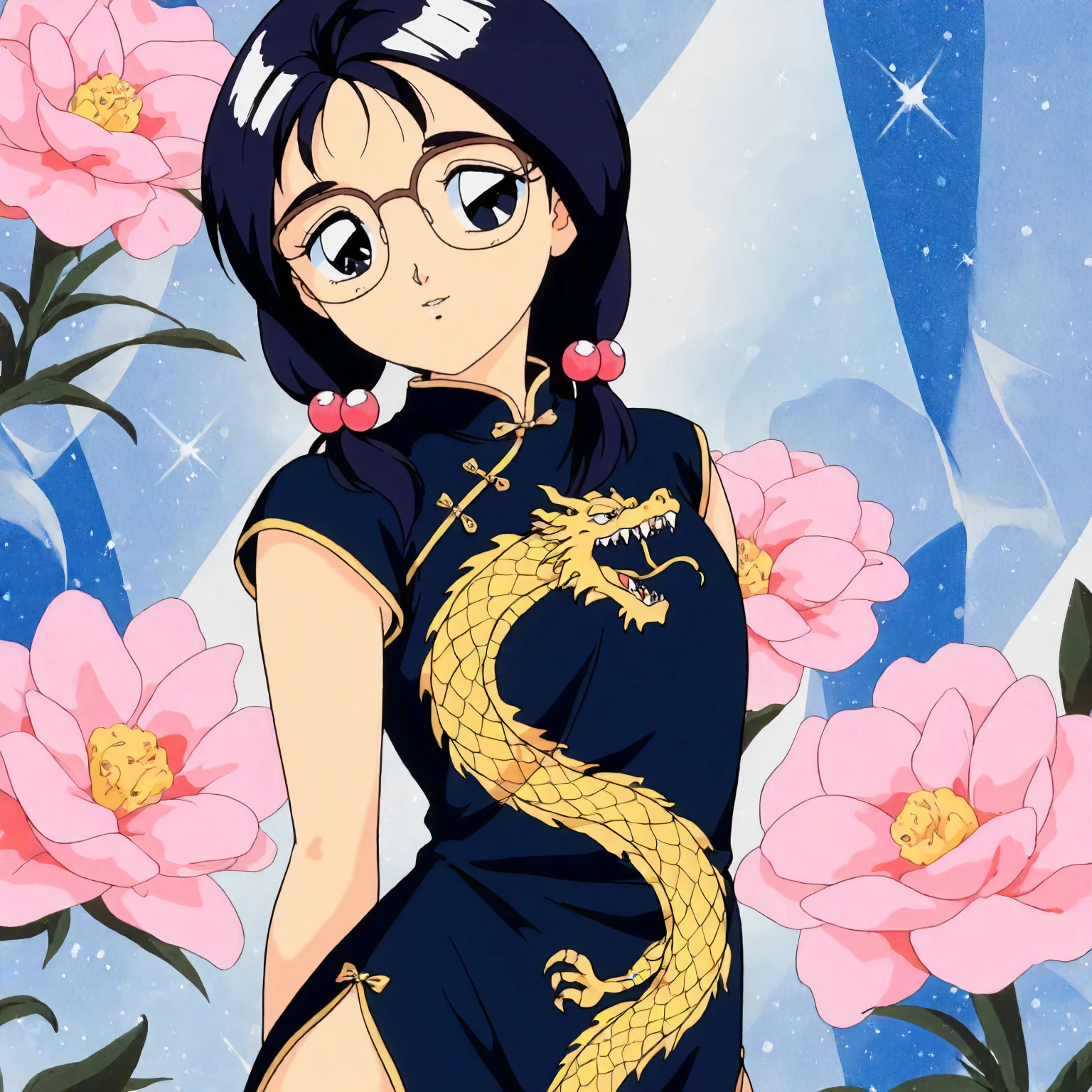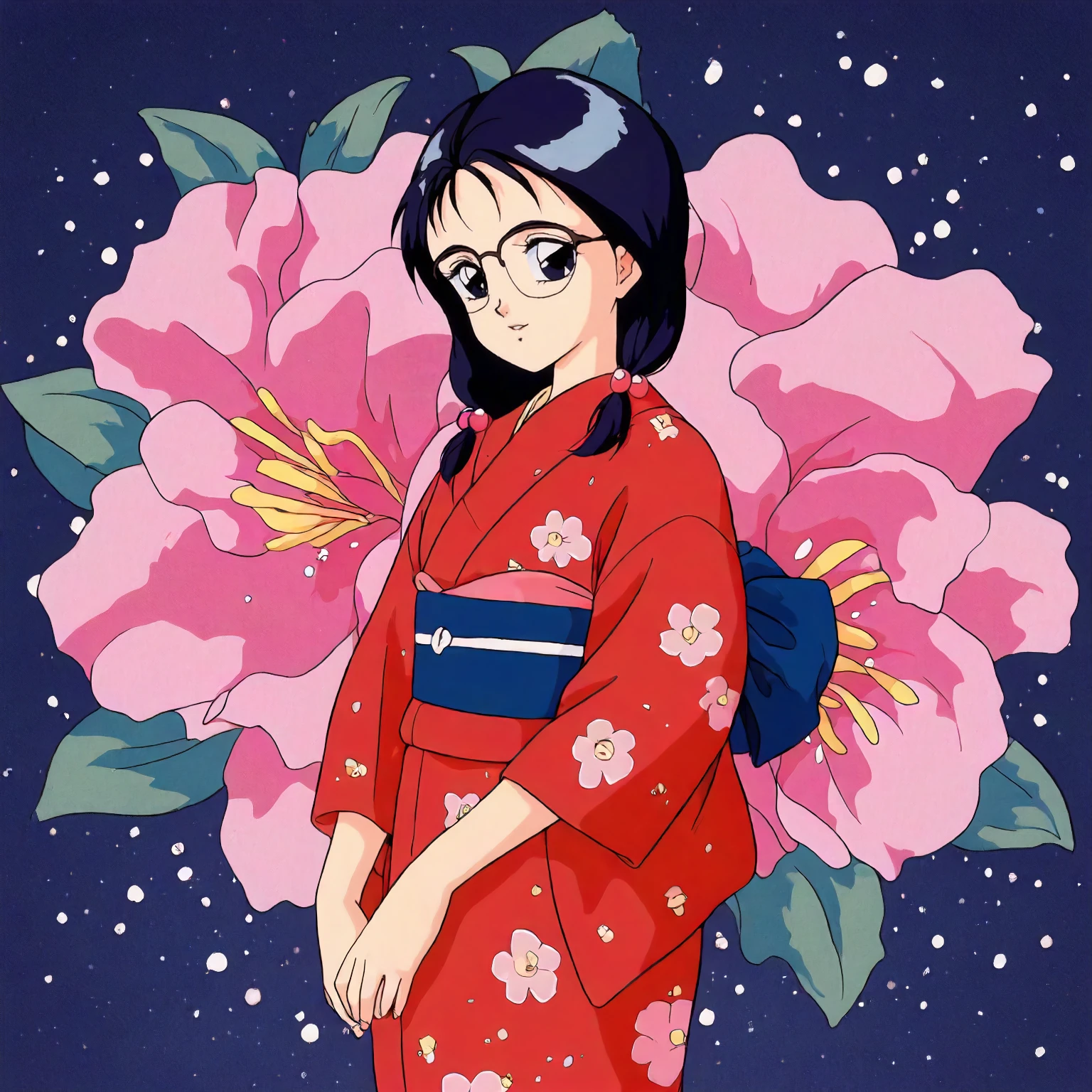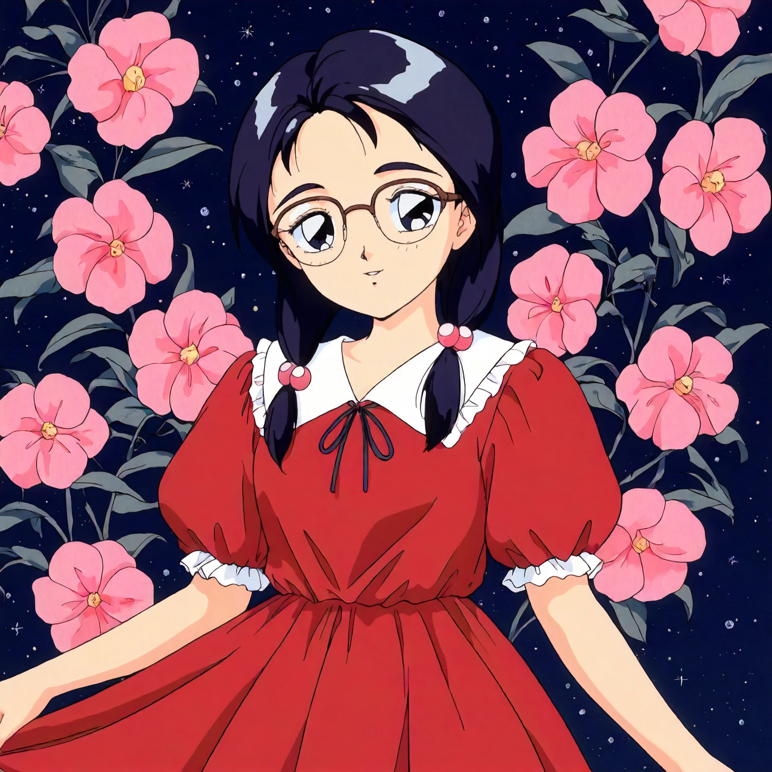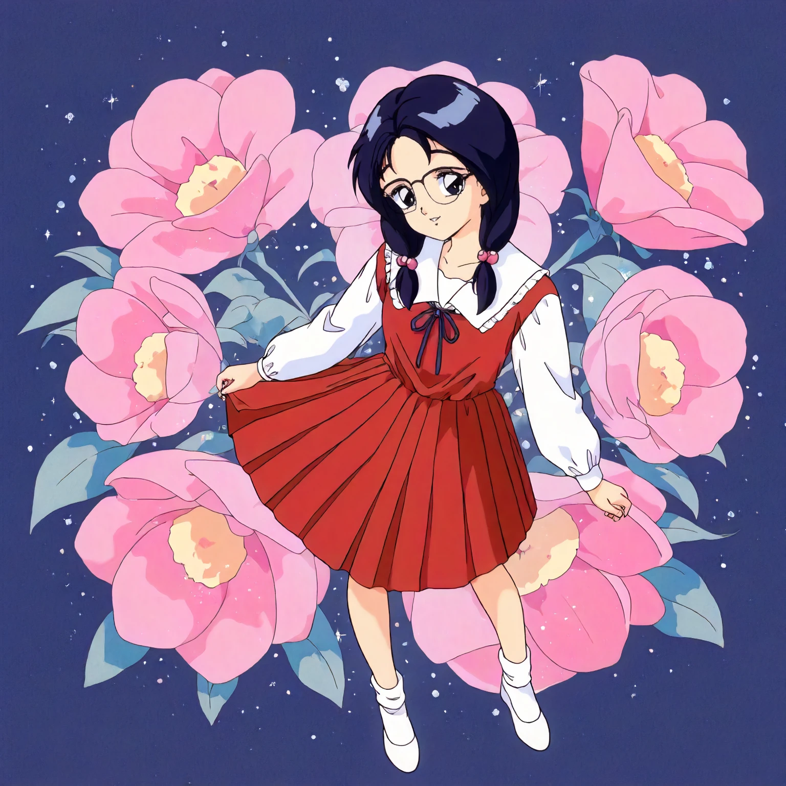anime coloring,retro artstyle,1990s \(style\), matsubara_hazuki\(zoku_hatsukoi_monogatari\),1girl,black blue hair,low twintails,hair bobbles,black blue eyes, glasses,