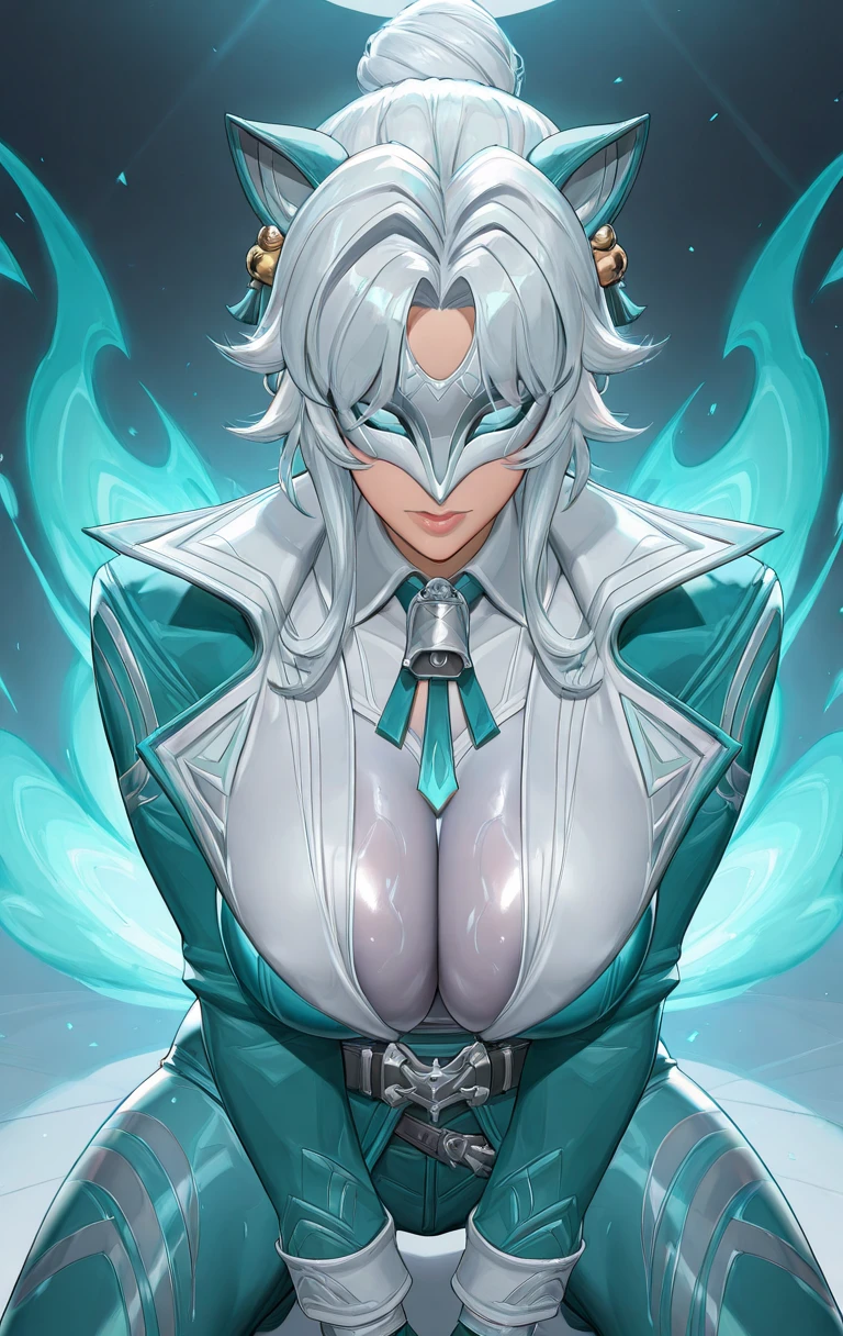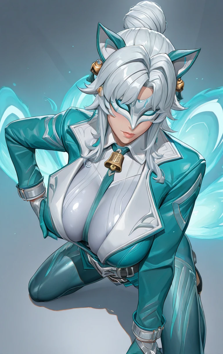 wh1t3f0x, 1girl, solo, mask, breasts, official alternate costume, jacket, gloves, bangs, belt, hair bun, bell, white hair, long sleeves,