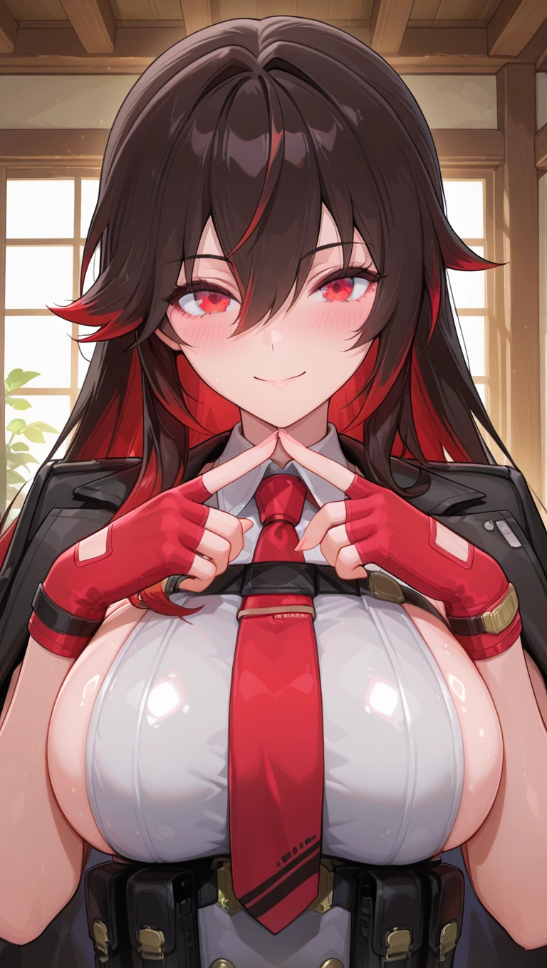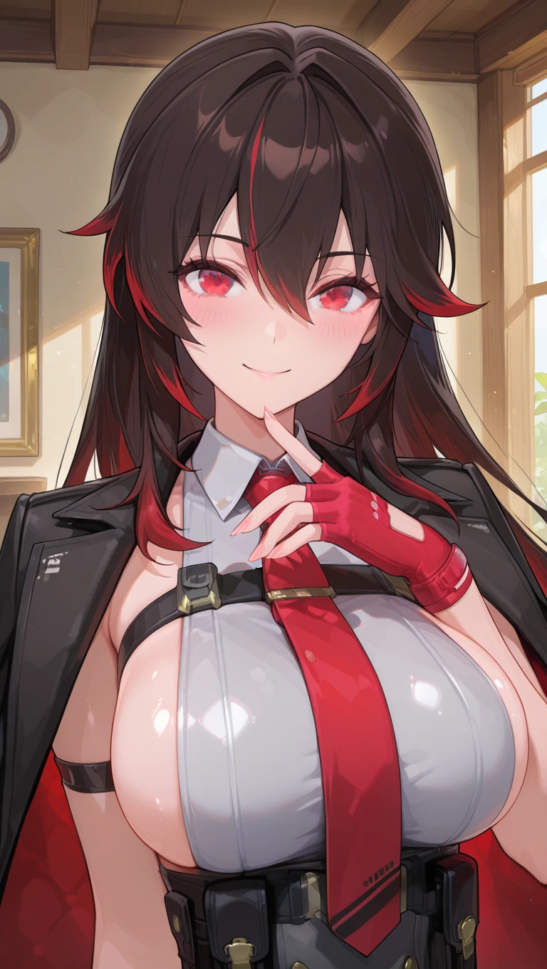 black jacket,jacket on shoulders,sleeveless dress,collared dress,red necktie,fingerless gloves,red gloves,large breasts,sideboob,pouch,belt,black thighhighs,thigh boots,high heel boots,black footwear
