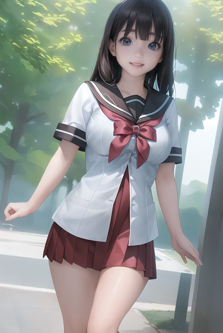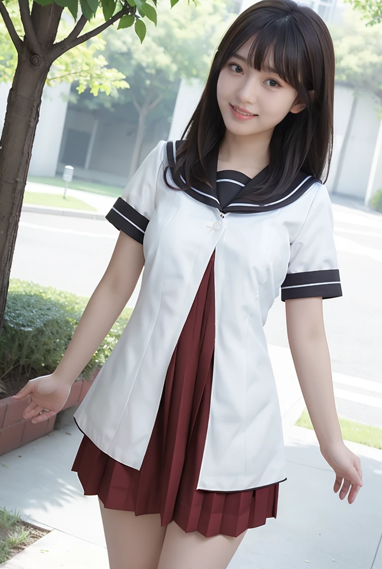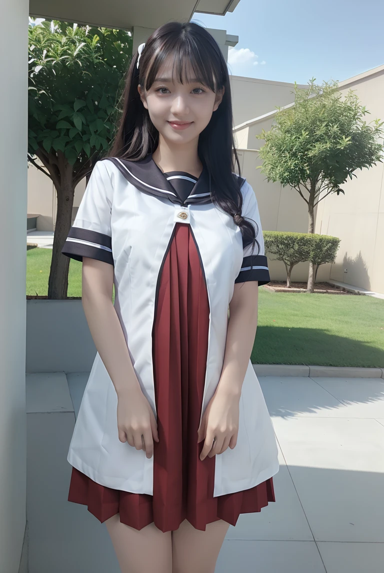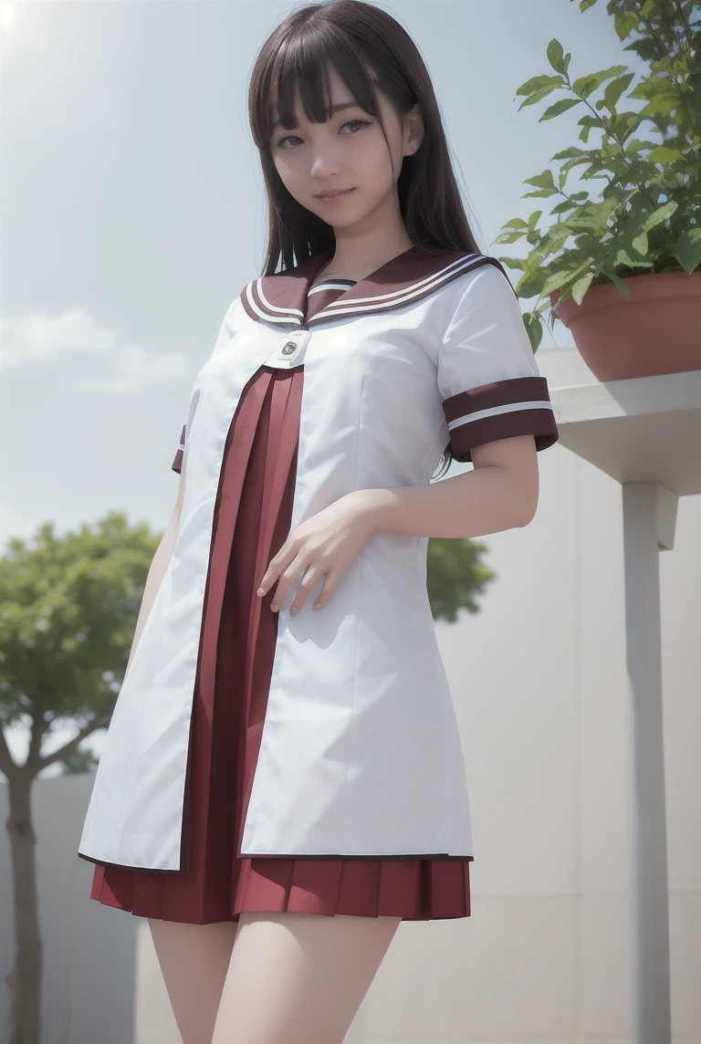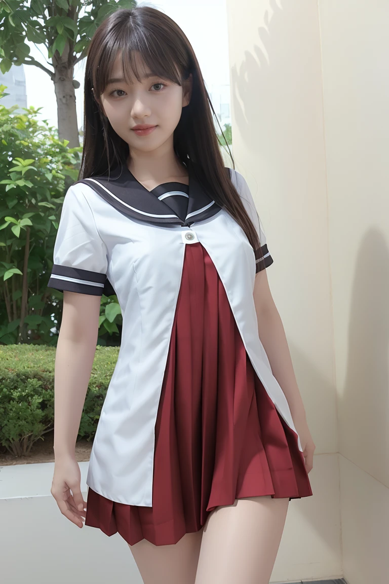 nanamori school uniform, white shirt over red pleated dress,