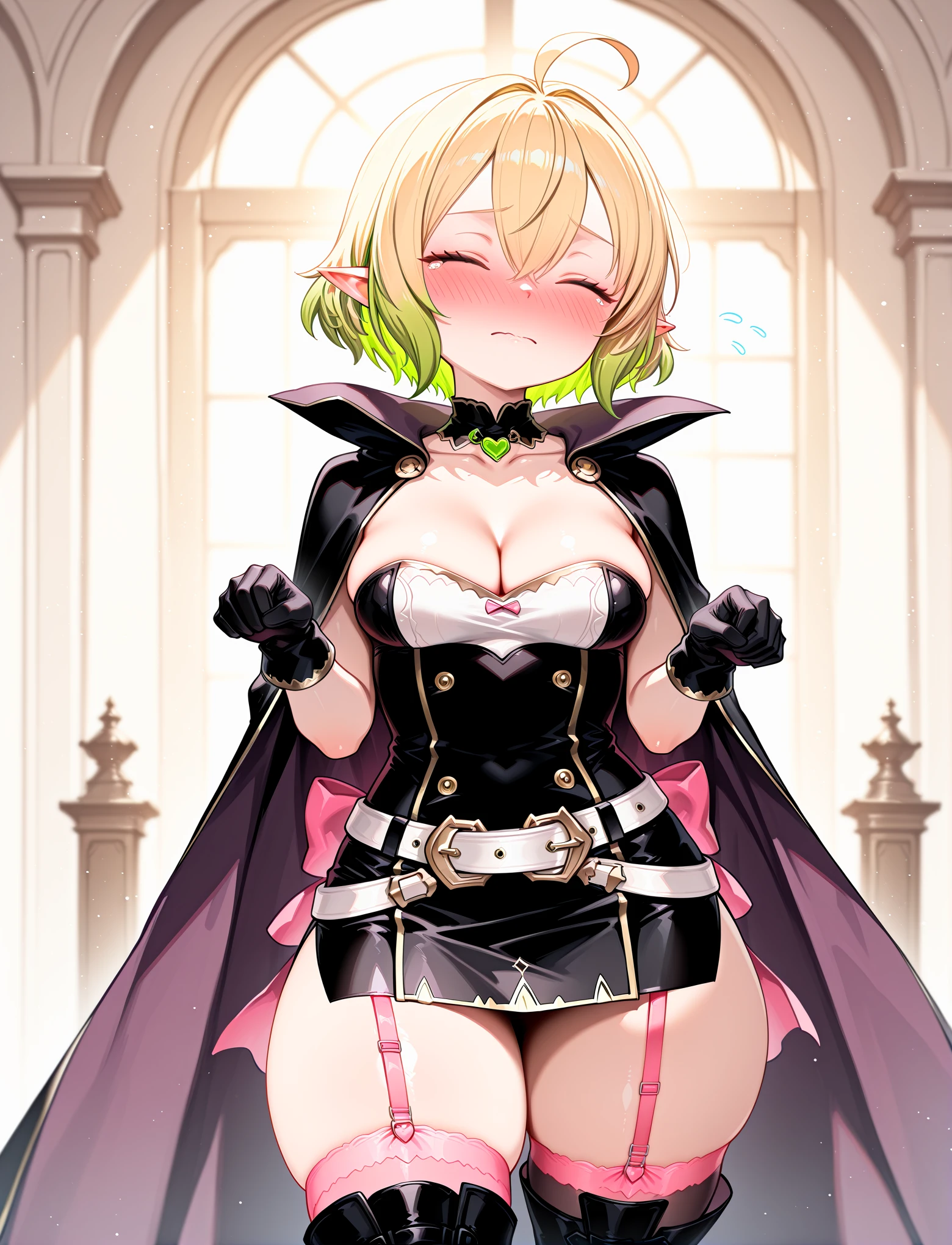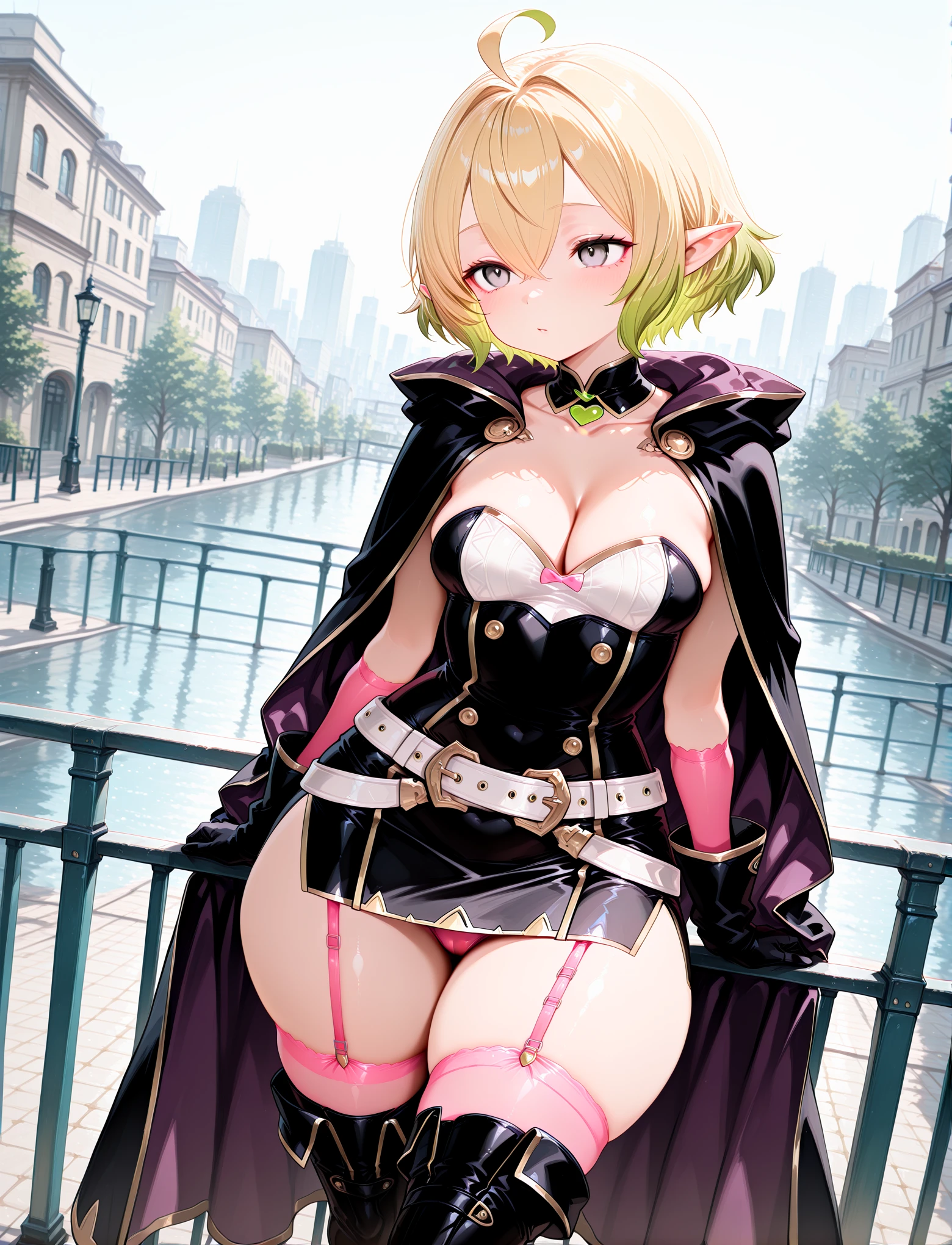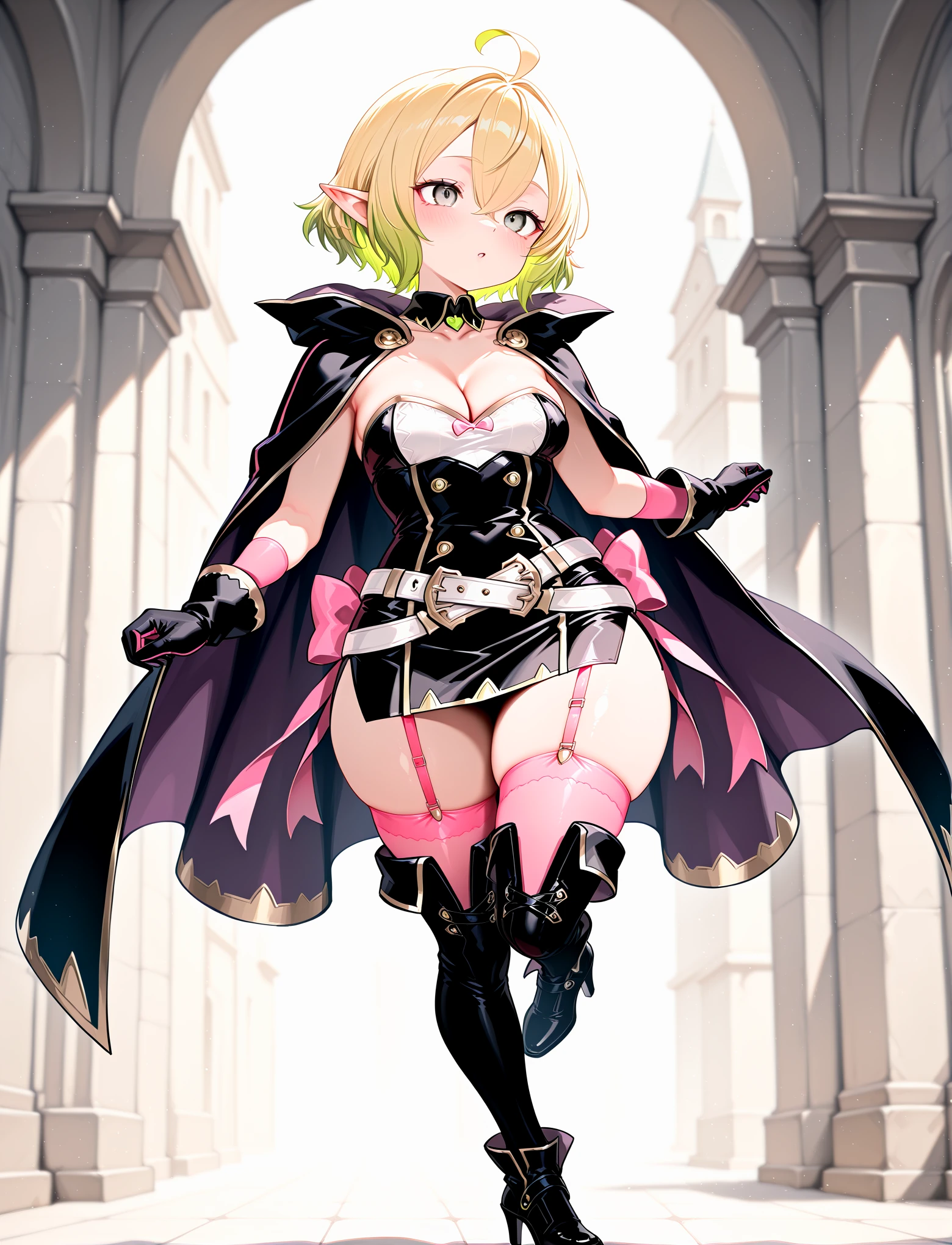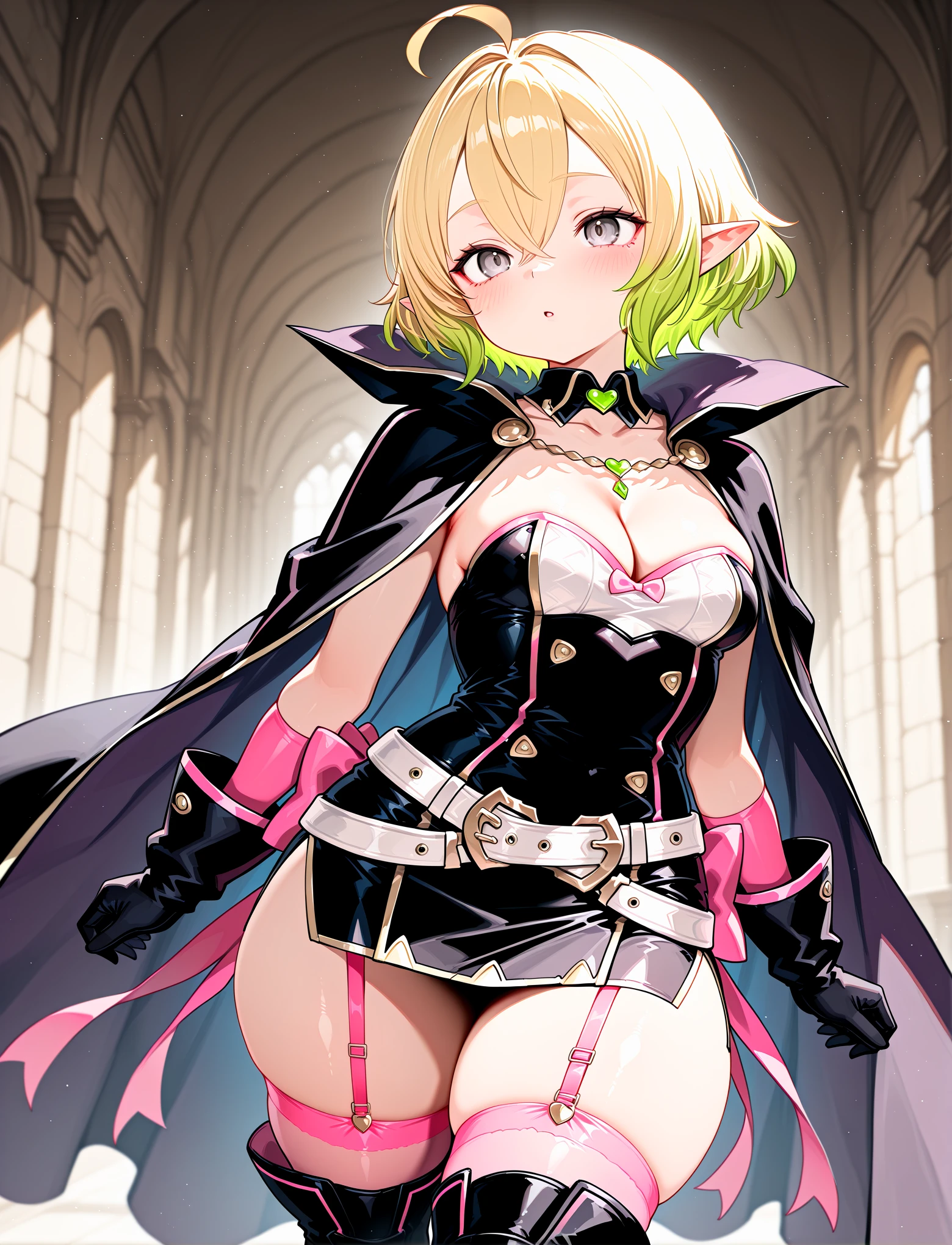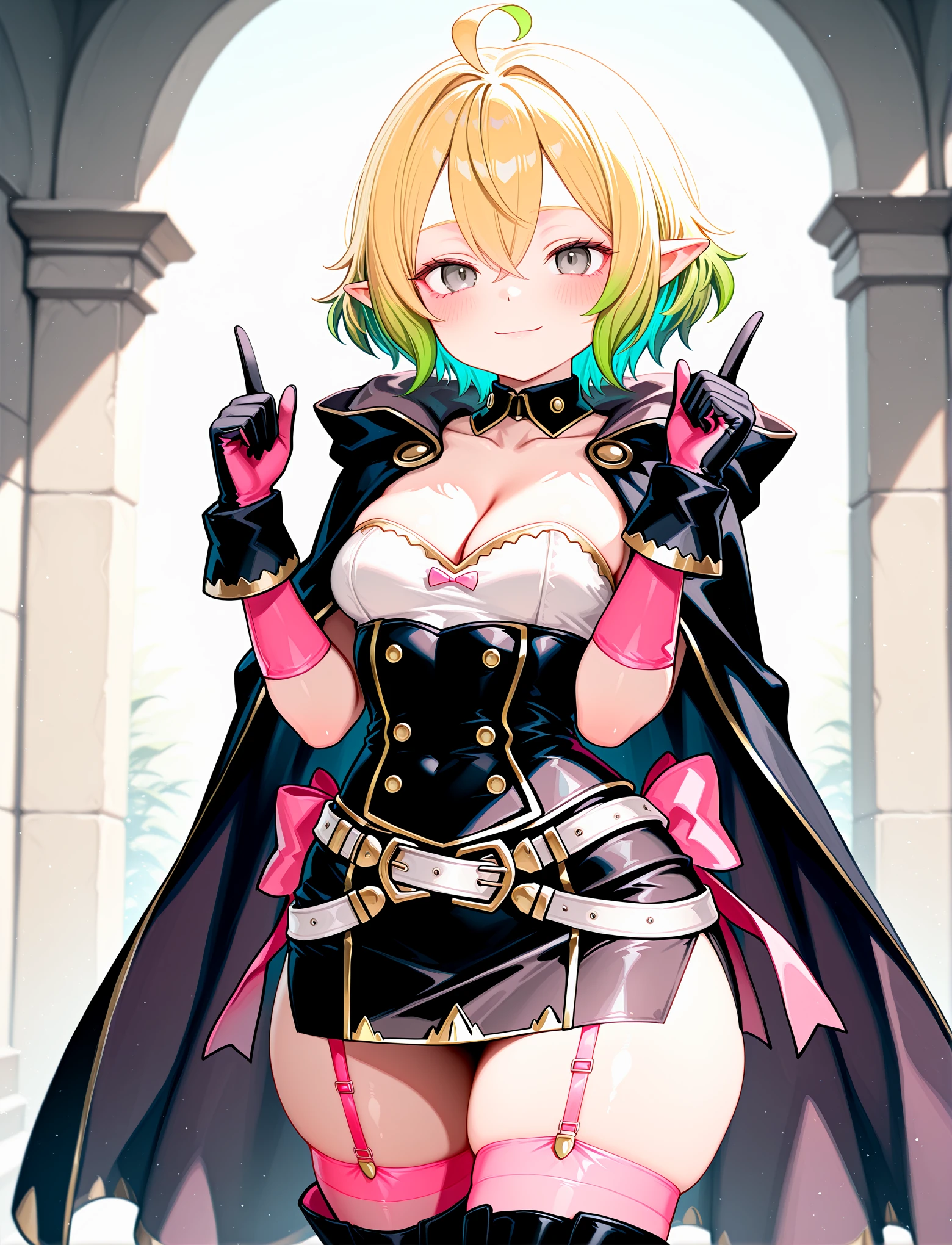 ManaMorgan, ahoge, blonde hair, green inner hair, green tips, short hair, hair between eyes, grey eyes, pointy ears, medium breasts, collarbone, cleavage, strapless, black detached collar, white top, sleeveless dress, white belts, miniskirt, garter straps, gold trim, black gloves, pink under gloves, pink thighhighs, black boots, high heel thigh boots, waist pink ribbons, cloak,