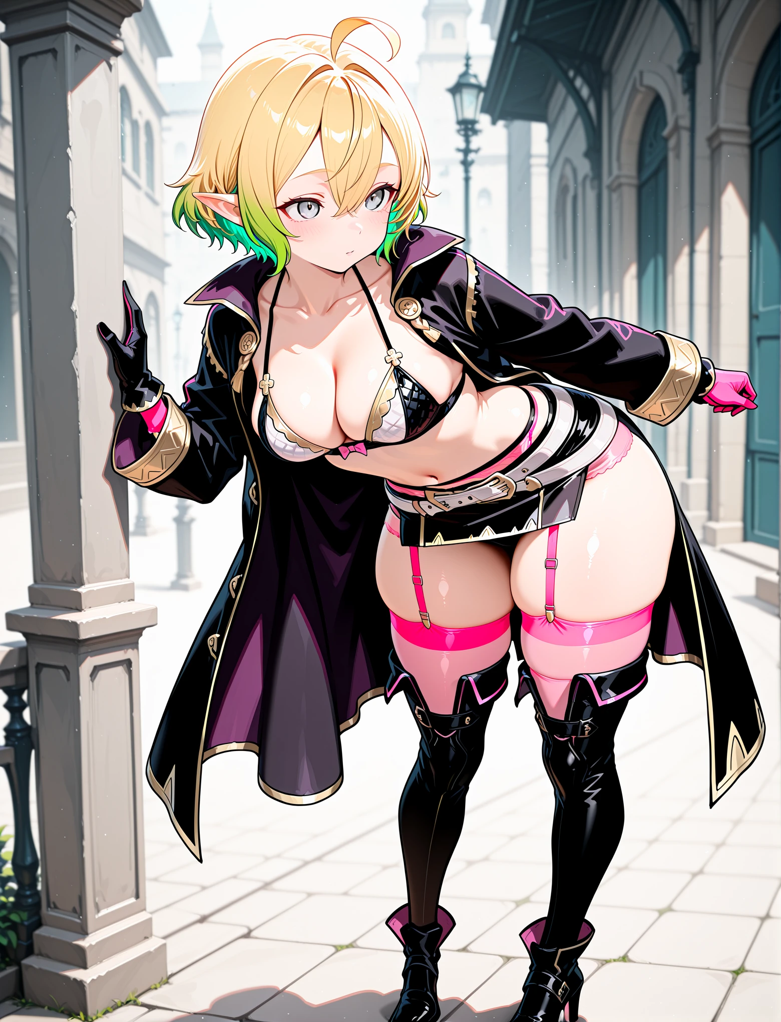ParOutfit, ahoge, blonde hair, green inner hair, green tips, short hair, hair between eyes, grey eyes, pointy ears, medium breasts, collarbone, gold trim, black and white top, scale bikini, midriff, navel, white belt, cross belts, multiple belts, black skirt, black gloves, pink thighhighs, pink garter straps, black boots, high heel thigh boots, hood down, coat,