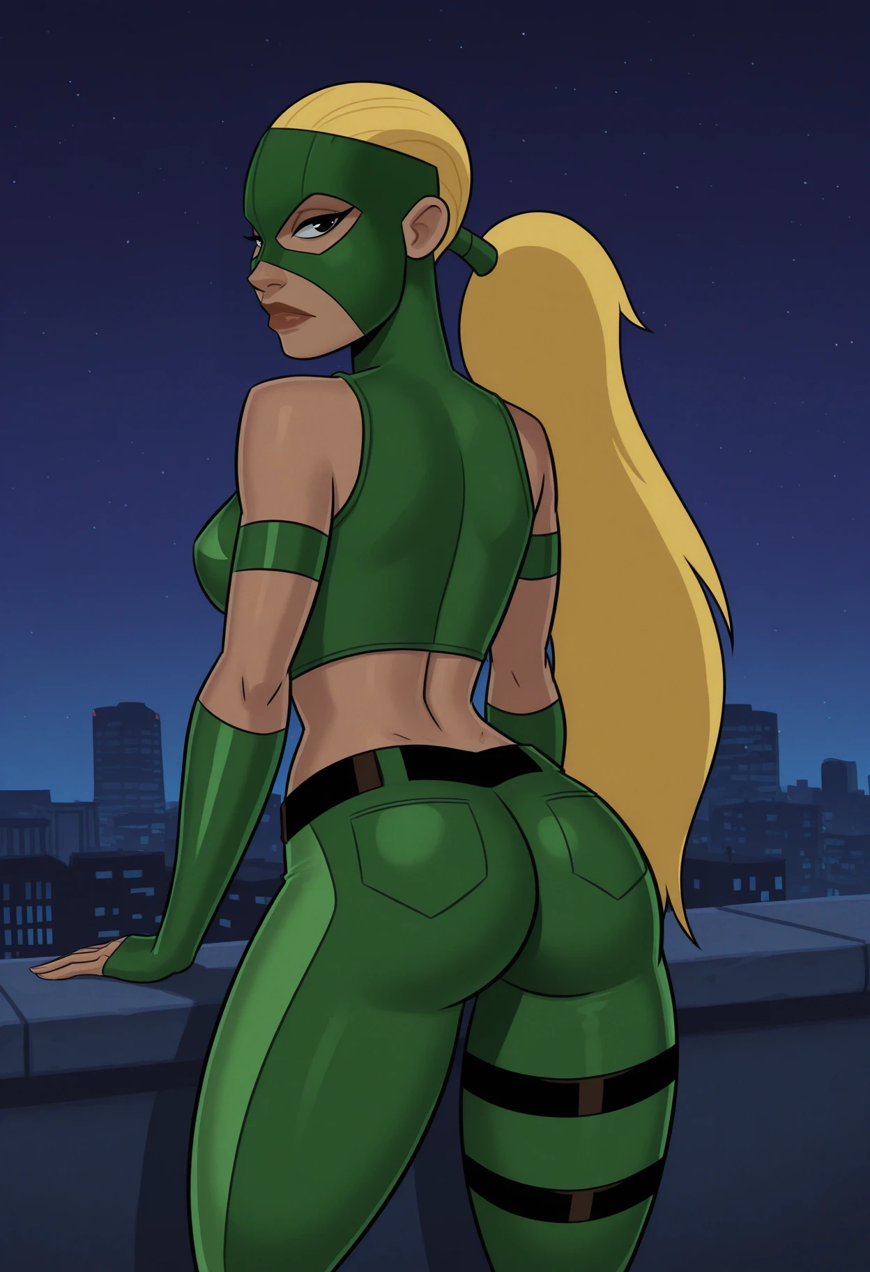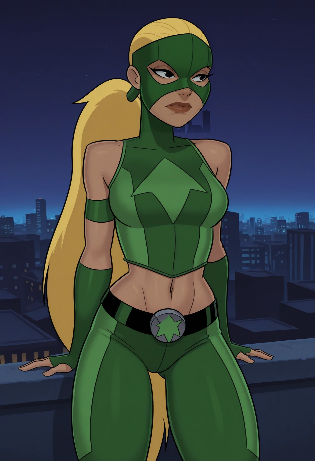 artemis_hero_outfit, superhero, mask, bare shoulders, crop top, sleeveless, midriff, navel, belt, pants, green pants,Tigress superhero outfit tags: