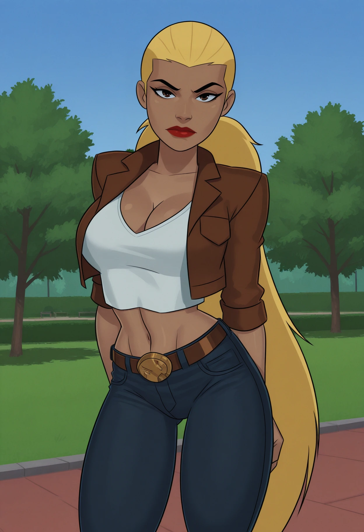 1girl, solo, black eyes, brown eyes, blonde hair, very long hair, ponytail, breasts, large breasts, lipstick,