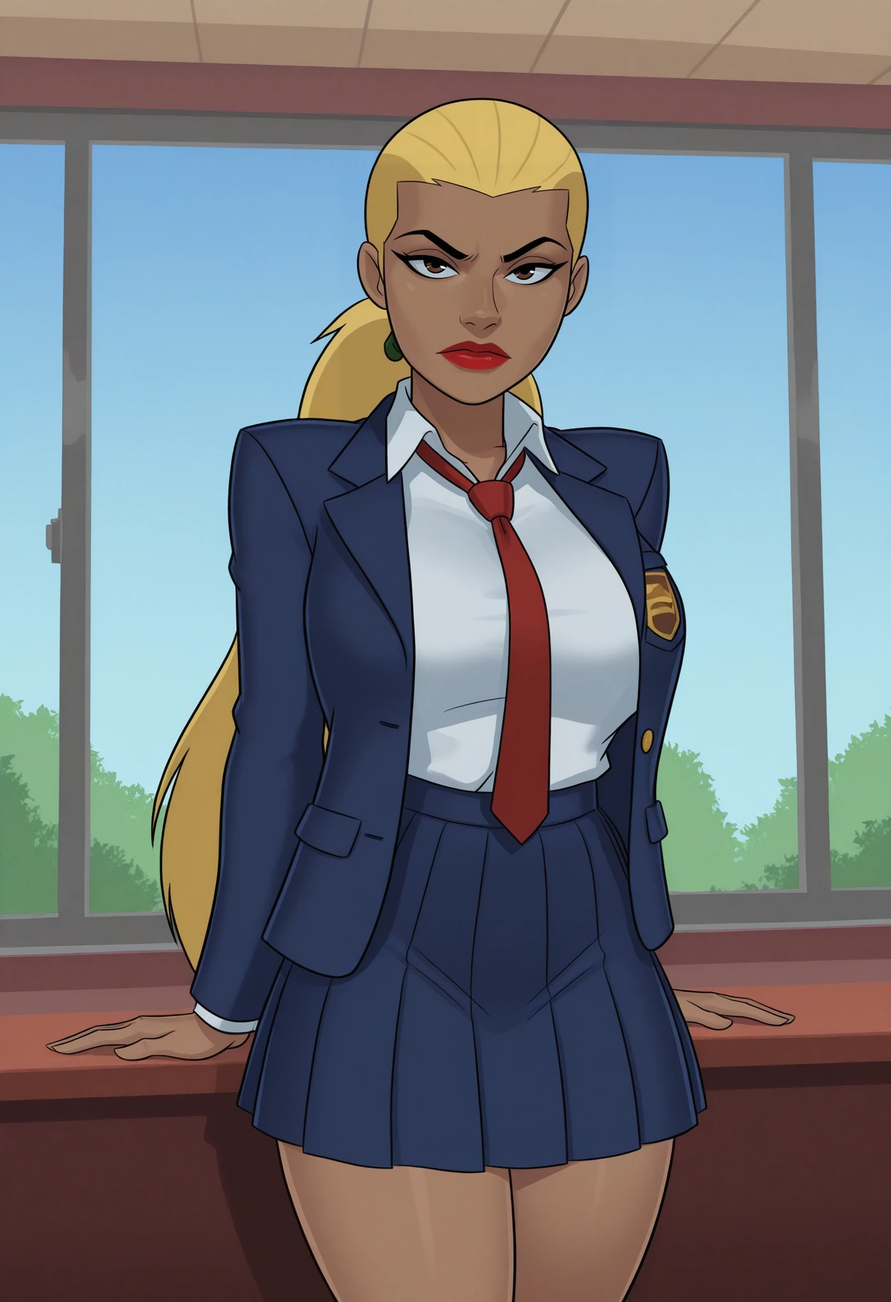 artemis_sch_outfit, school uniform, necktie, red necktie, jacket, open jacket, blazer, shirt, white shirt, collared shirt, skirt, pleated skirt, blue skirt, thighs, socks, white socks, slut outfit tags: