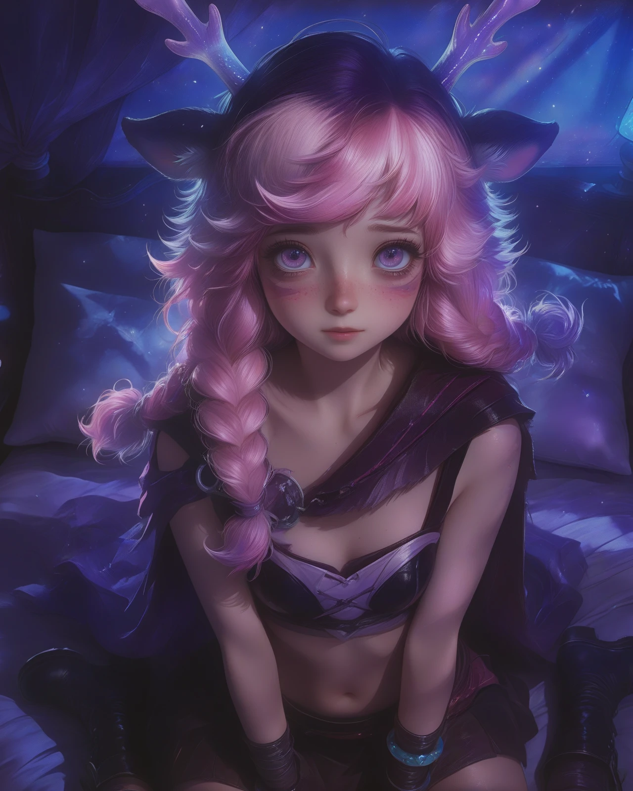 提示词: yaowzry, animal ears, antlers, braid, pink hair, horns, twin braids, multicolored hair, purple eyes, deer ears, (freckles:1.3), facial mark,portrait,big eyes,