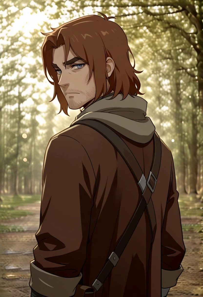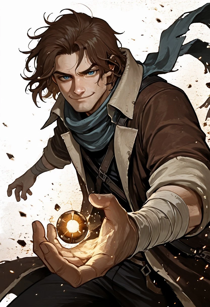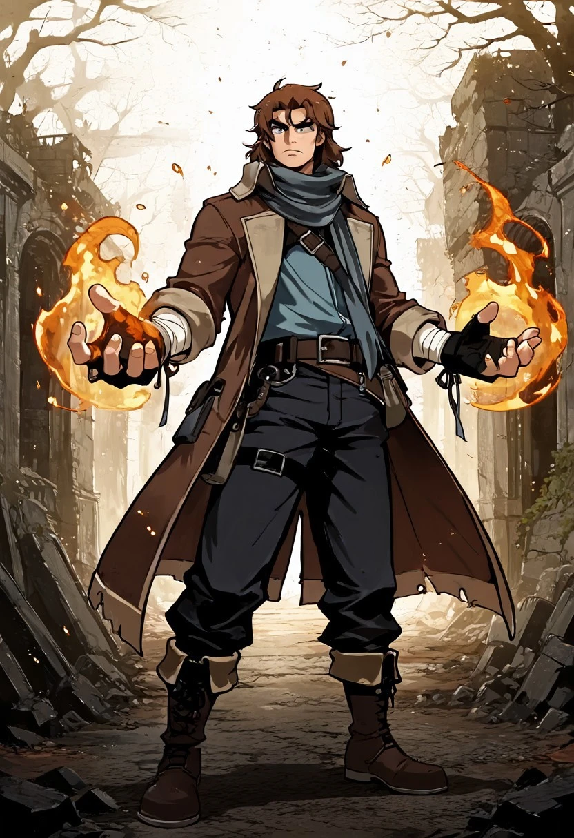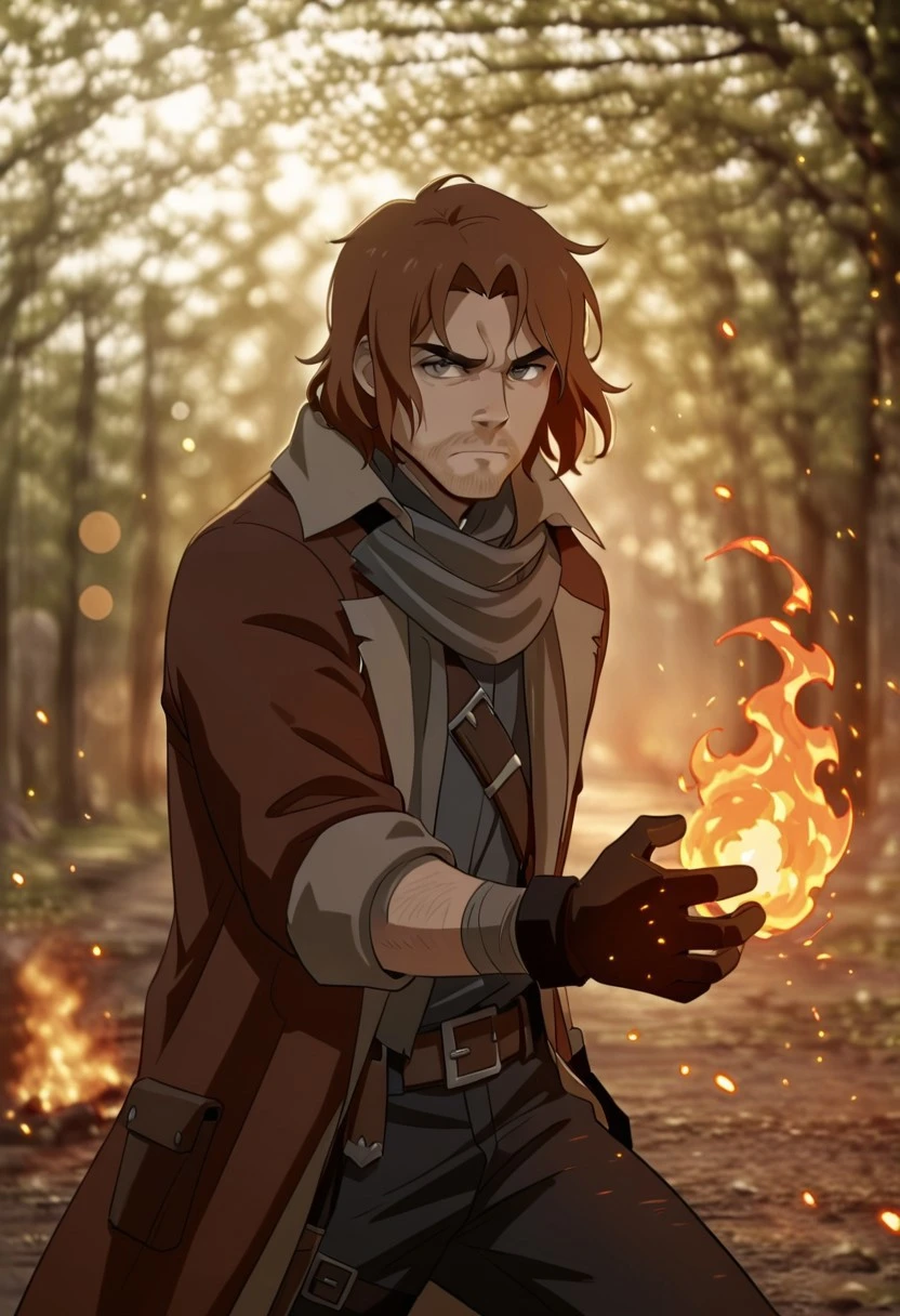 caleb widogast, male, critical role, 1boy, solo, male focus, brown hair, blue eyes, unshaved, thick eyebrows, scarf, gloves, fingerless gloves, coat, belt, boots, bag, bandages, fire, embers,