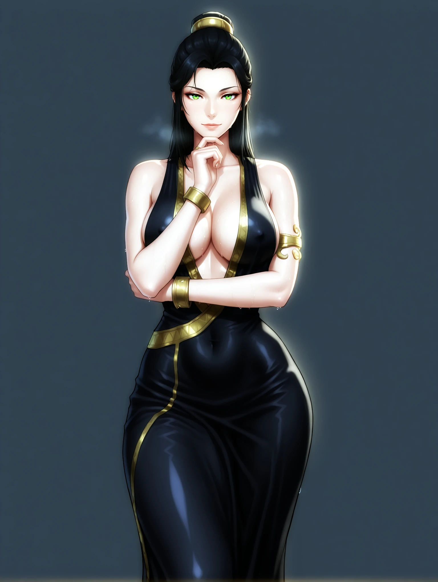Persephone Prompts : 1girl, long hair, black hair, green eyes, hair bun, wide ????, large ??????, thick thighs