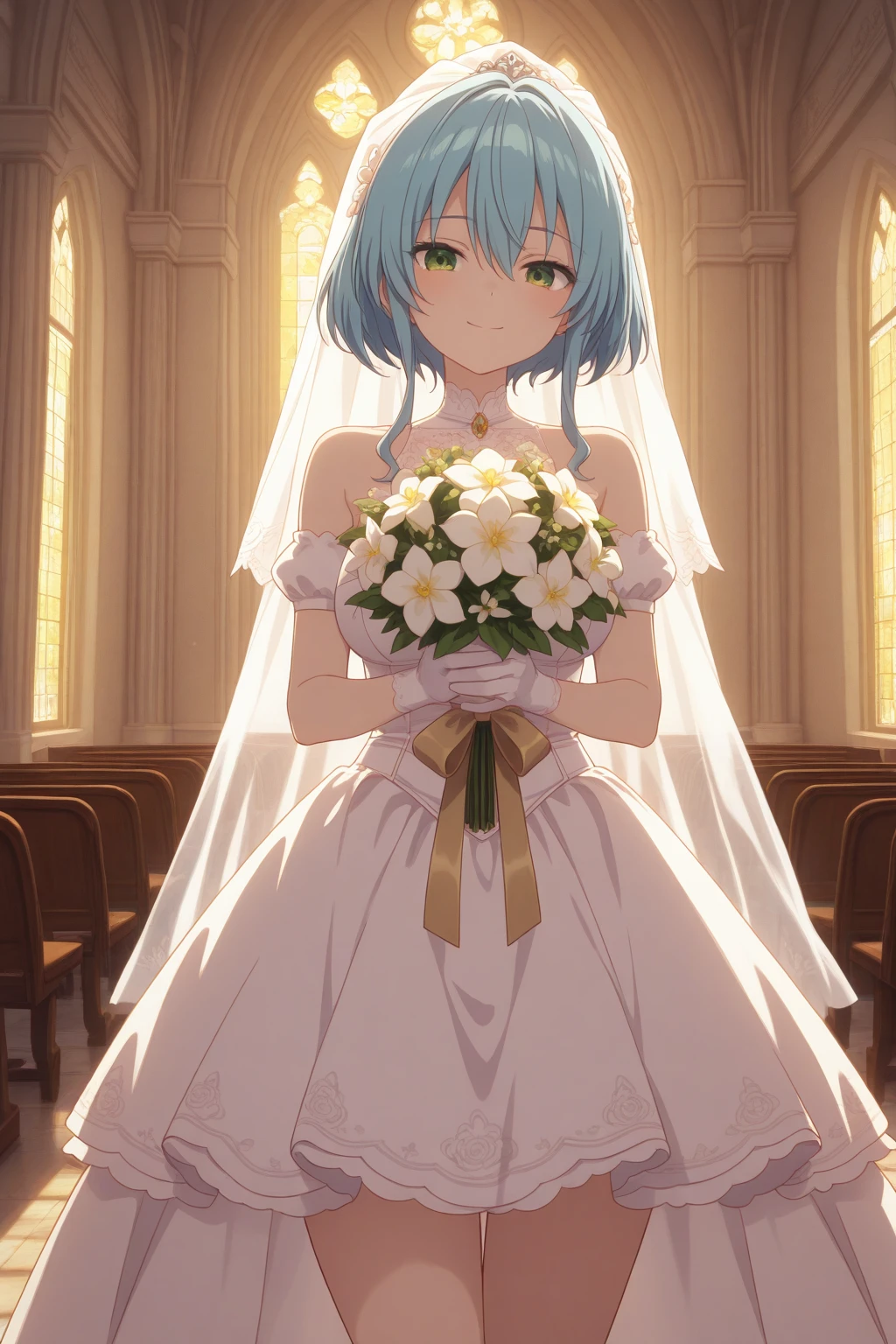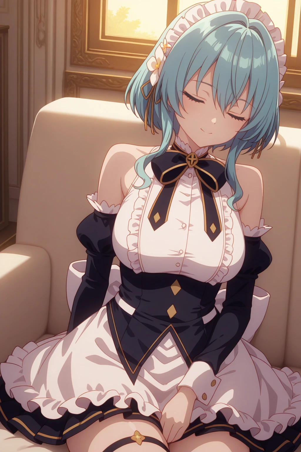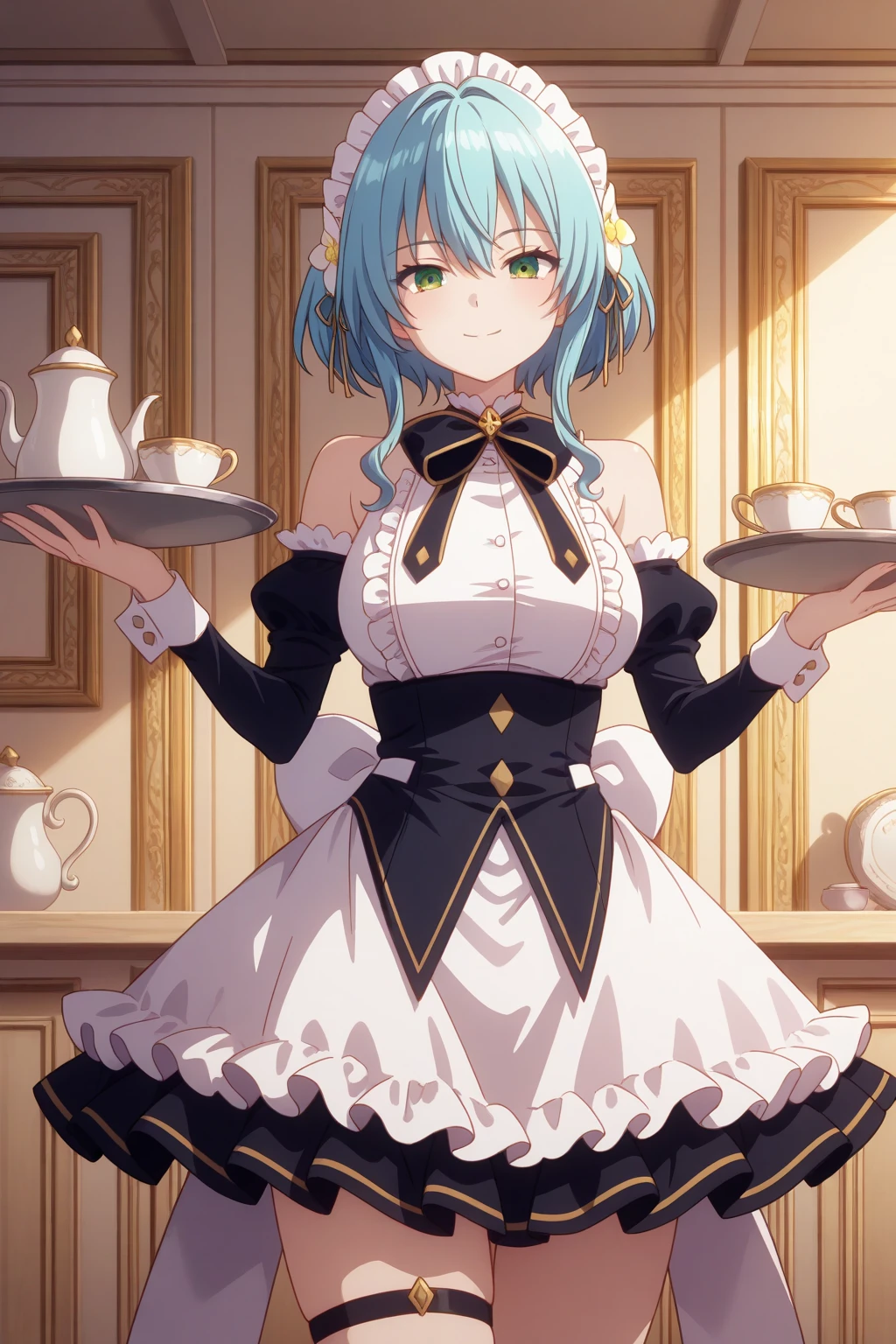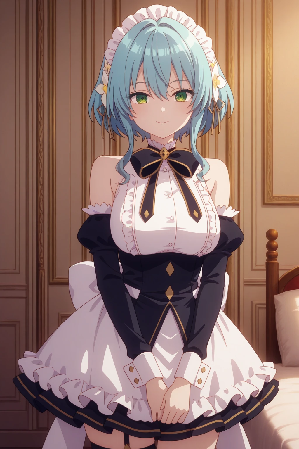 aavillhaze, green eyes, blue hair, villmaid, maid headdress, hair flower, black bowtie, dress, underbust corset, maid apron, detached sleeves, black sleeves, puffy sleeves, back bow, white bow, thigh strap, frills,Swimsuit (not perfect):