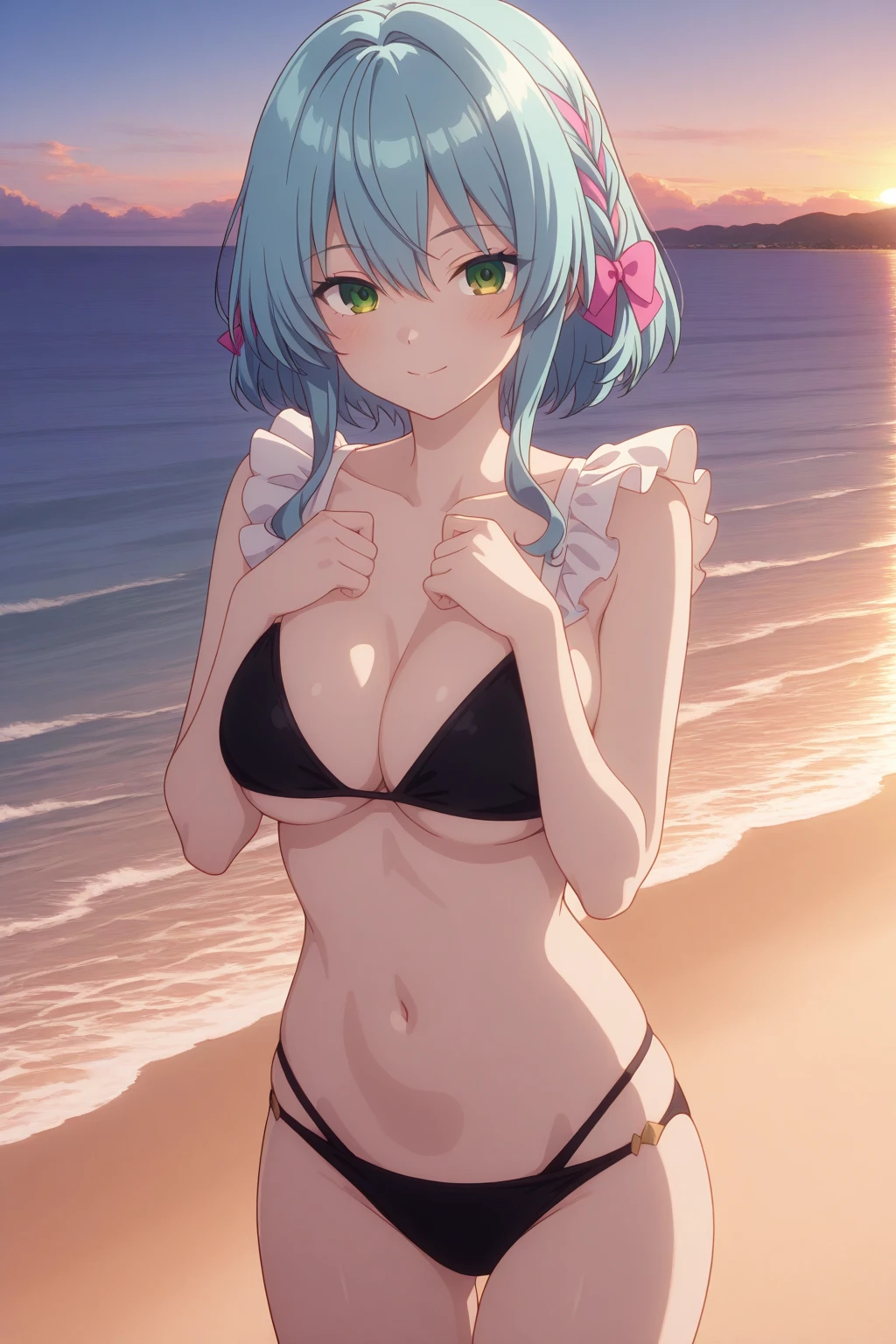 aavillhaze, green eyes, blue hair, villswim, hair bow, pink bow, side braid, swimsuit, black bikini, underboob, navel, multi-strapped bikini bottom, frills,Description