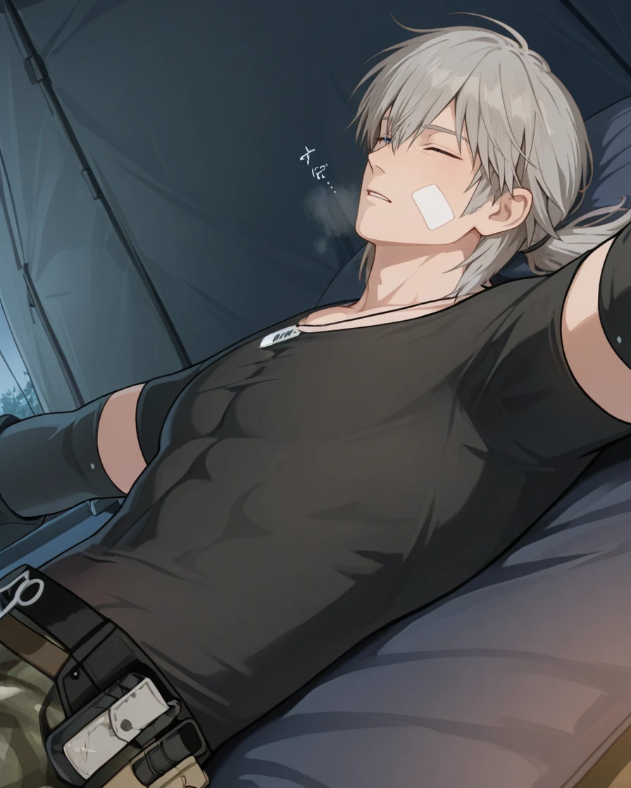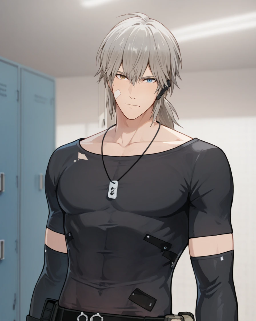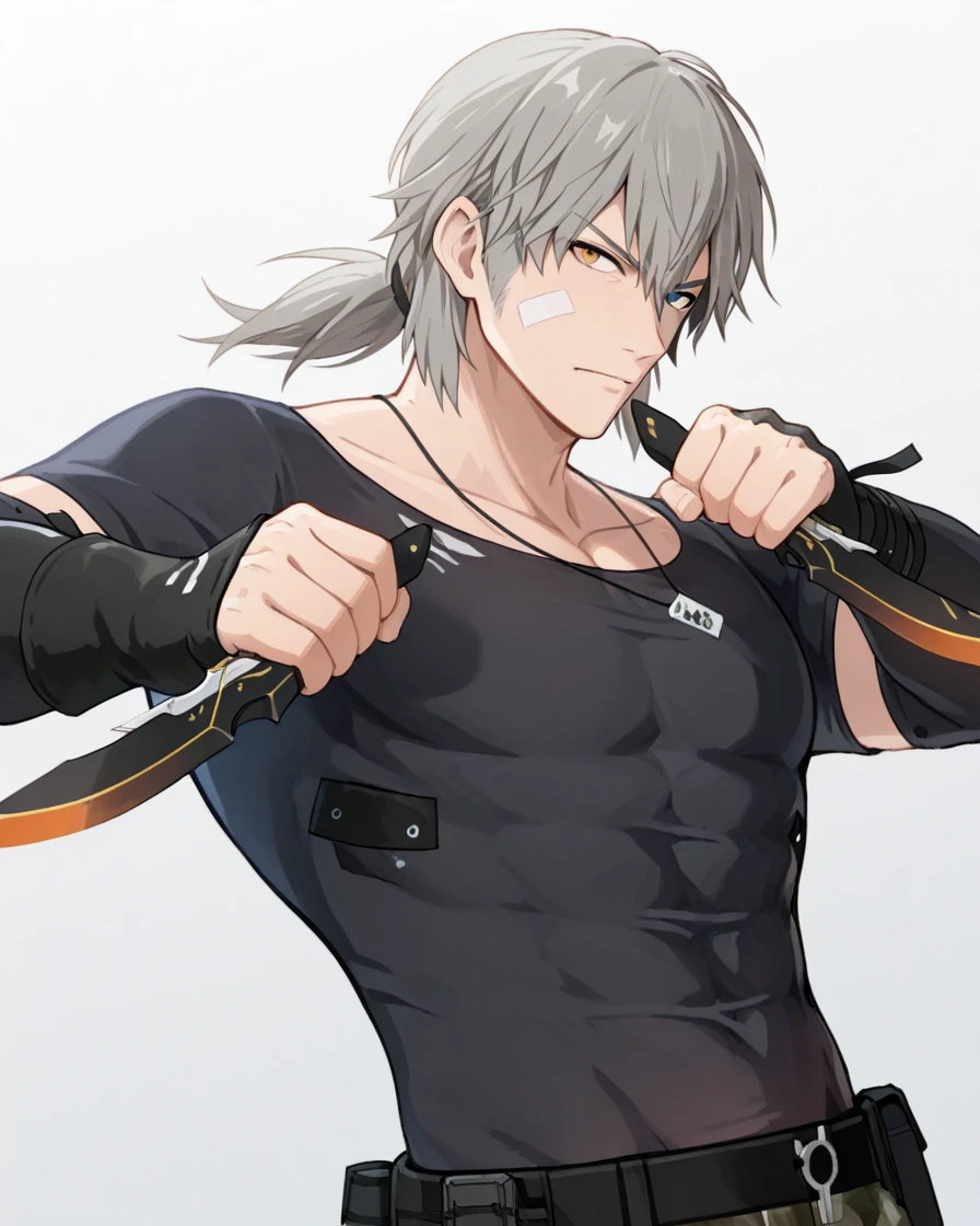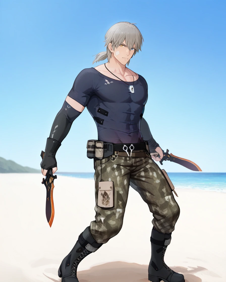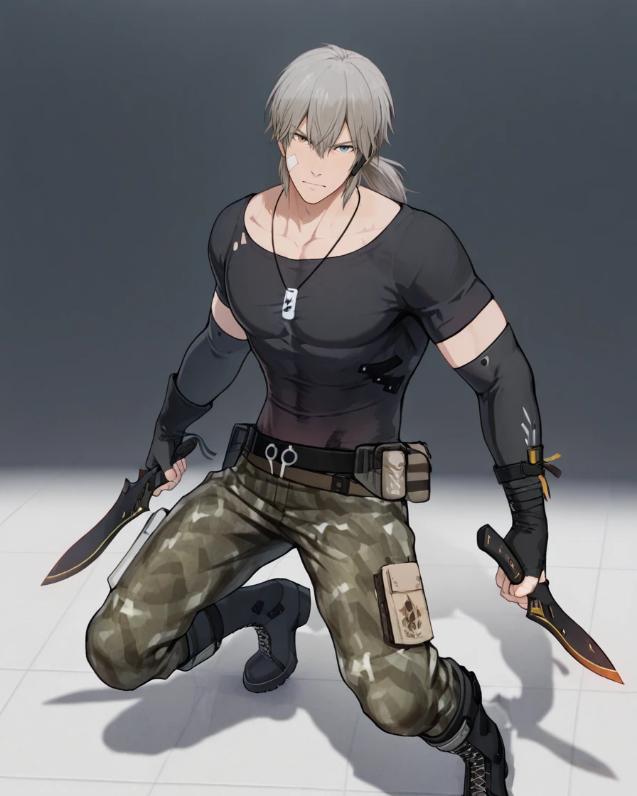 grey hair, ponytail, heterochromia, bandaid, bandages, dog tags, black shirt, short sleeves, detached sleeves, elbow gloves, fingerless gloves, camouflage pants, belt, pouch, boots, earpiece.