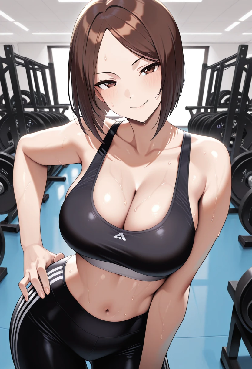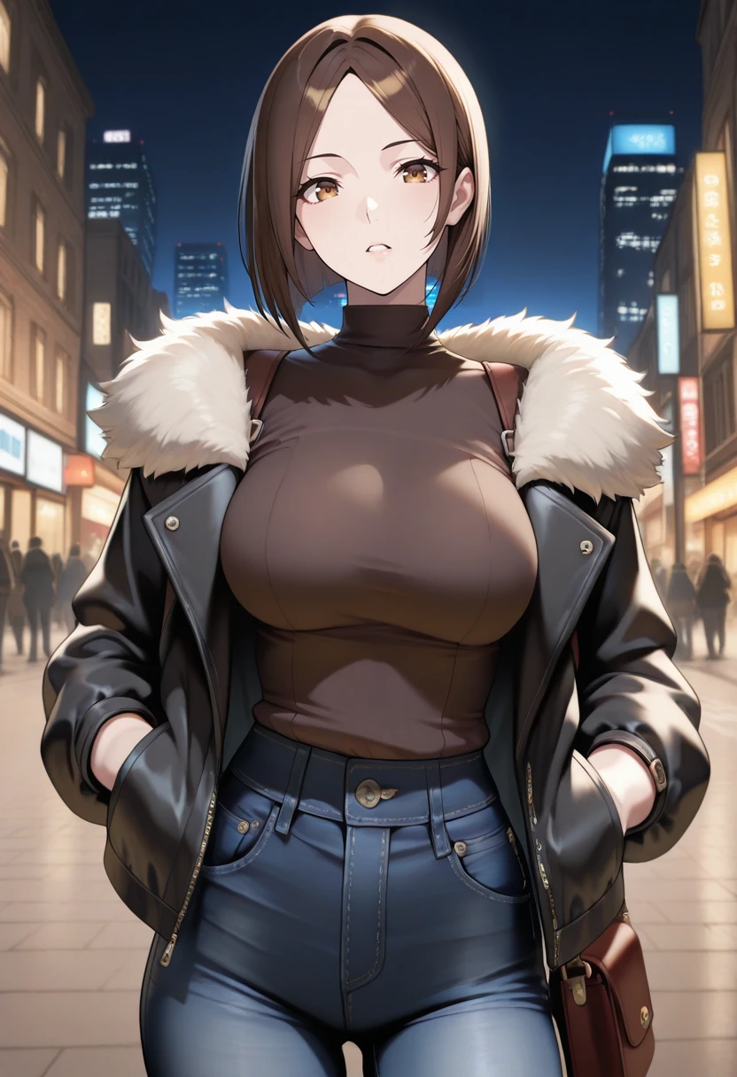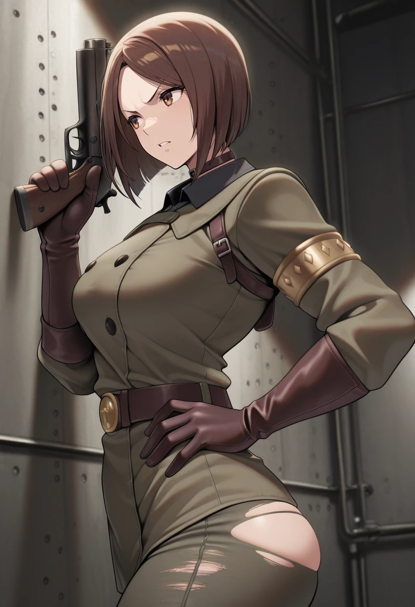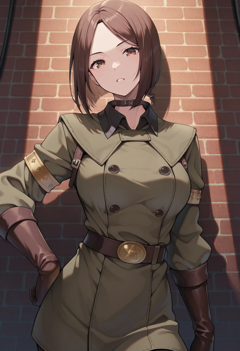 "KOFWHP, brown hair, short hair, parted hair, bob cut, brown eyes, choker, military jacket,belt buckle, collared jacket, armlet, long sleeves, brown gloves, pants, thighlet"