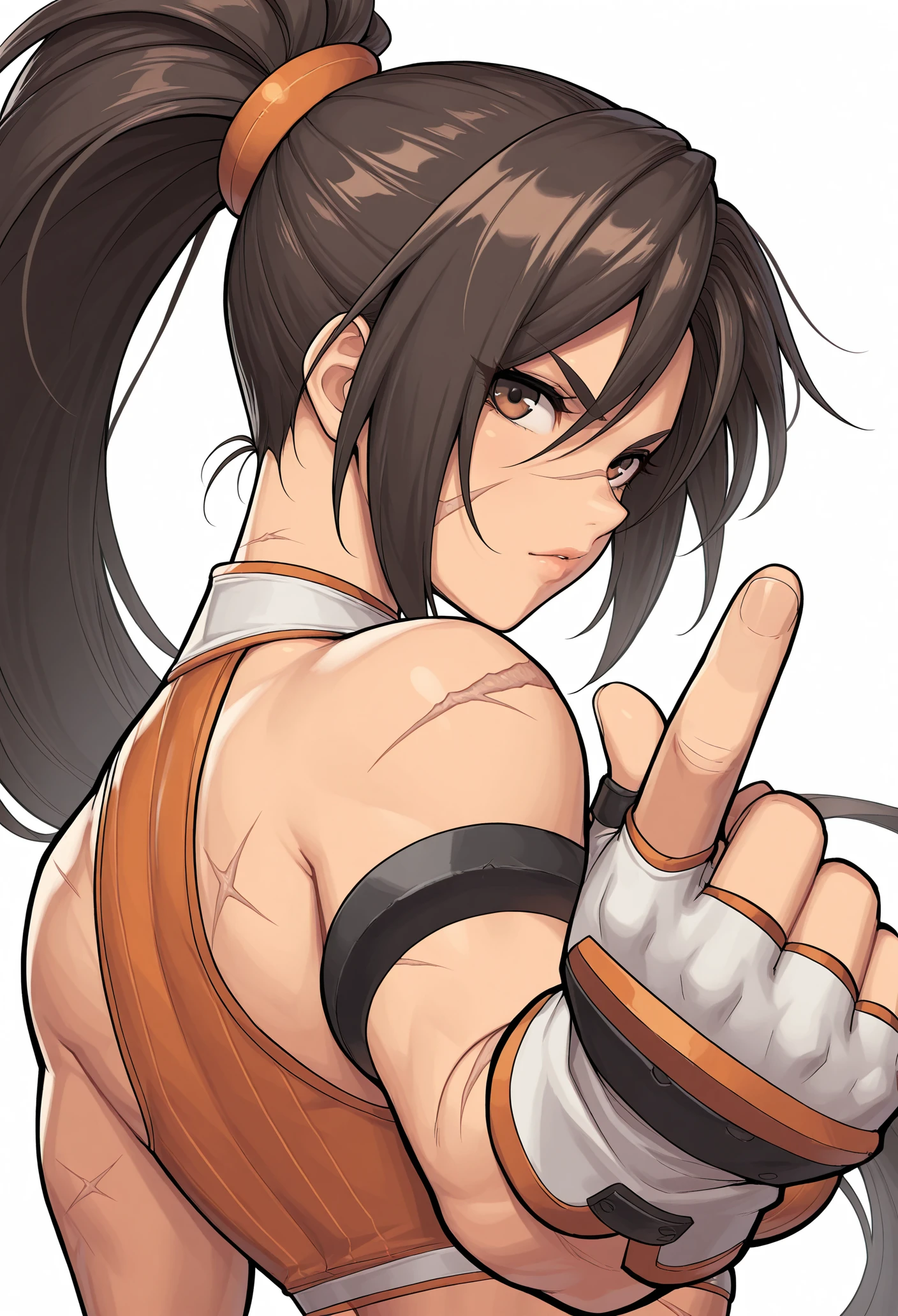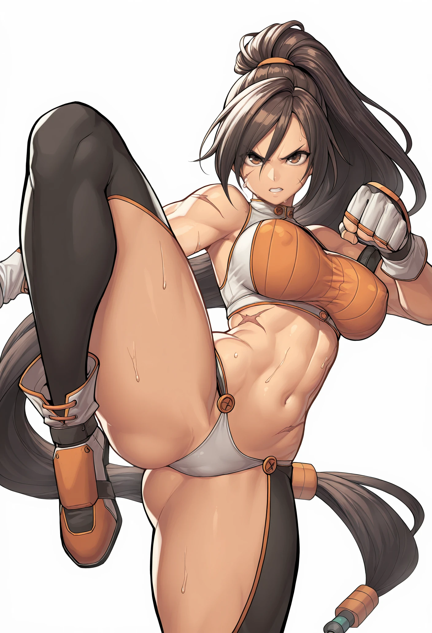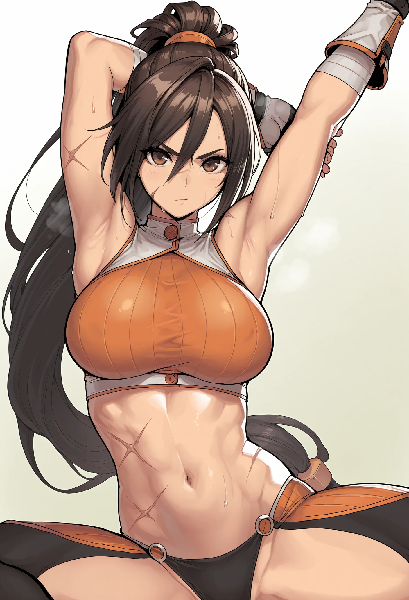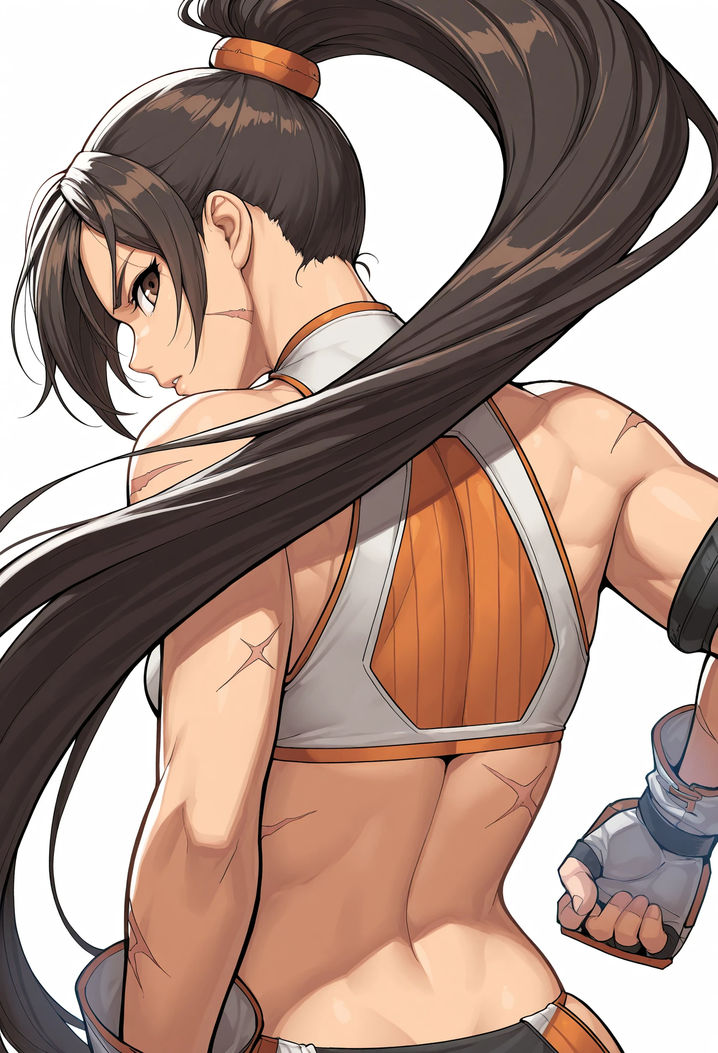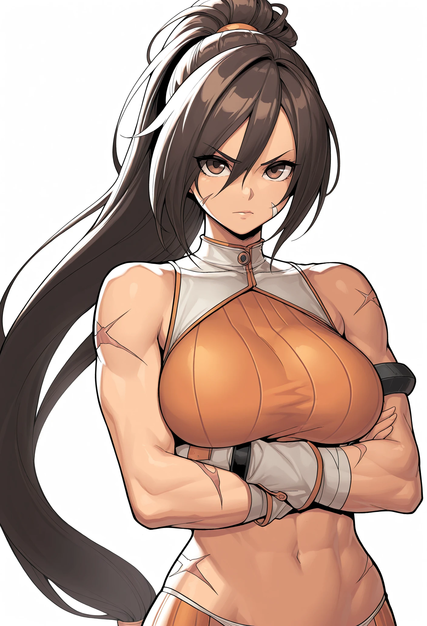 dnf fighter, 1girl, BROWN HAIR, brown eyes, ponytail, very long hair, SCAR, CROP TOP