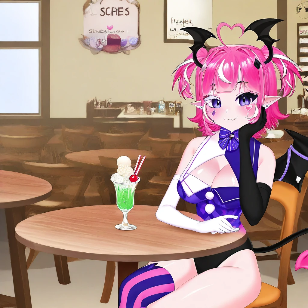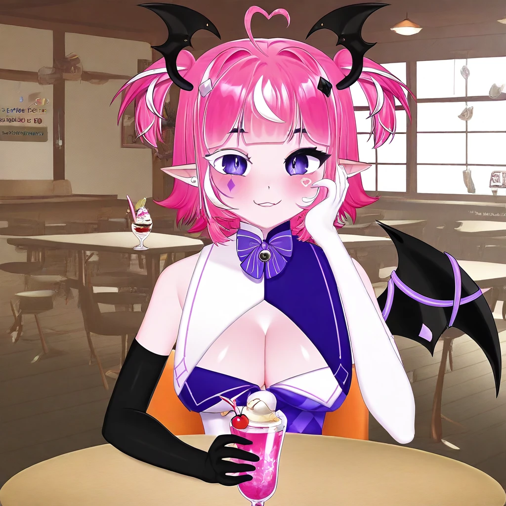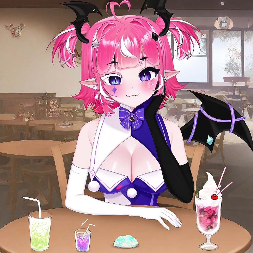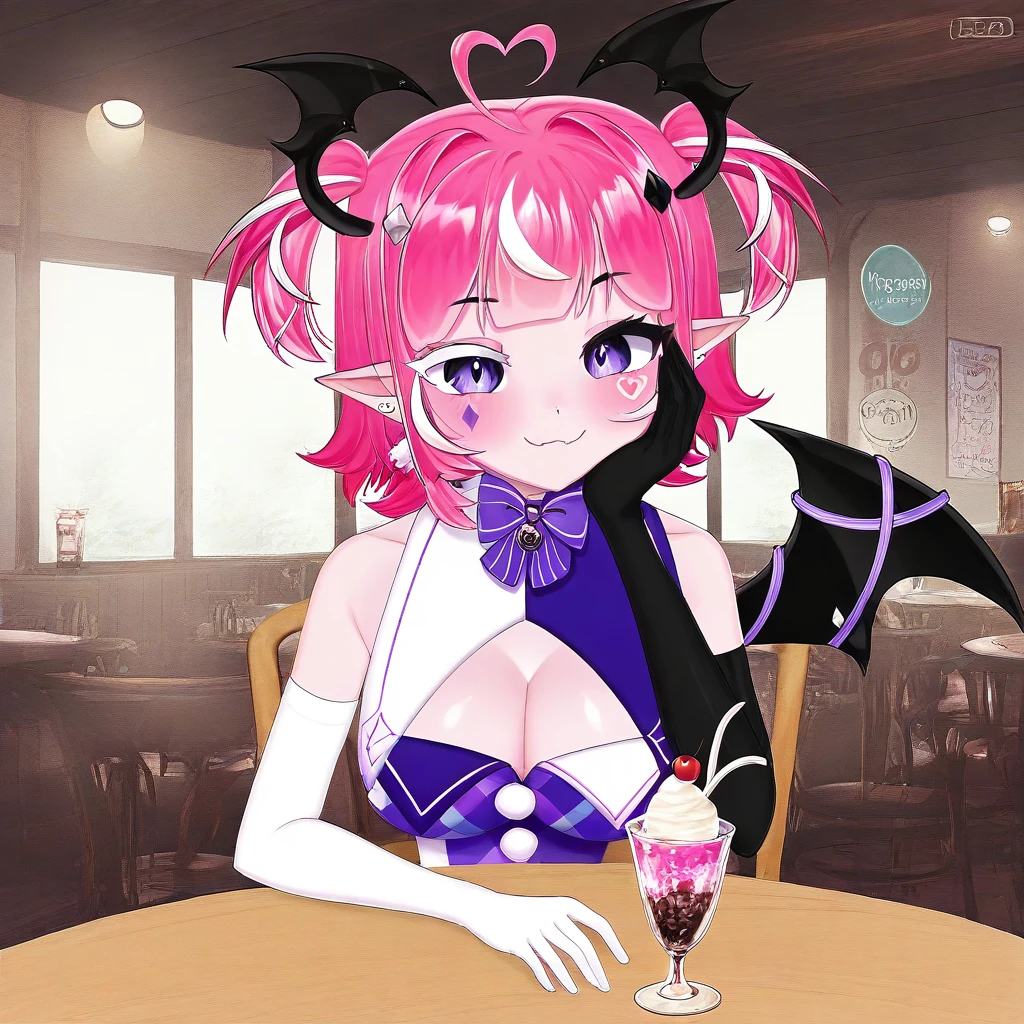 Camilavt, virtual youtuber, purple eyes, different color eyelashes, pink hair, multicolored hair, ahoge, pointy ears, short hair, large , score_9, score_8_up, score_7_up, smile at viewer, choker, head wings, hair ornament, , single wing, tail, cleavage, face marks, cleavage cutout, earrings, bow, ribbon, elbow gloves, black gloves, white gloves, head wings, leotard, mismatched legwear, asymmetrical legwear, diamond shaped facemarks left, heart shaped facemarks right
