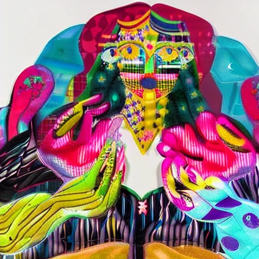 Photograph of a three-dimensional pop sculpture of one or more women made with Vairi haberdashery materials such as colored patchwork fabrics, foam rubber, stitching, thread and strings