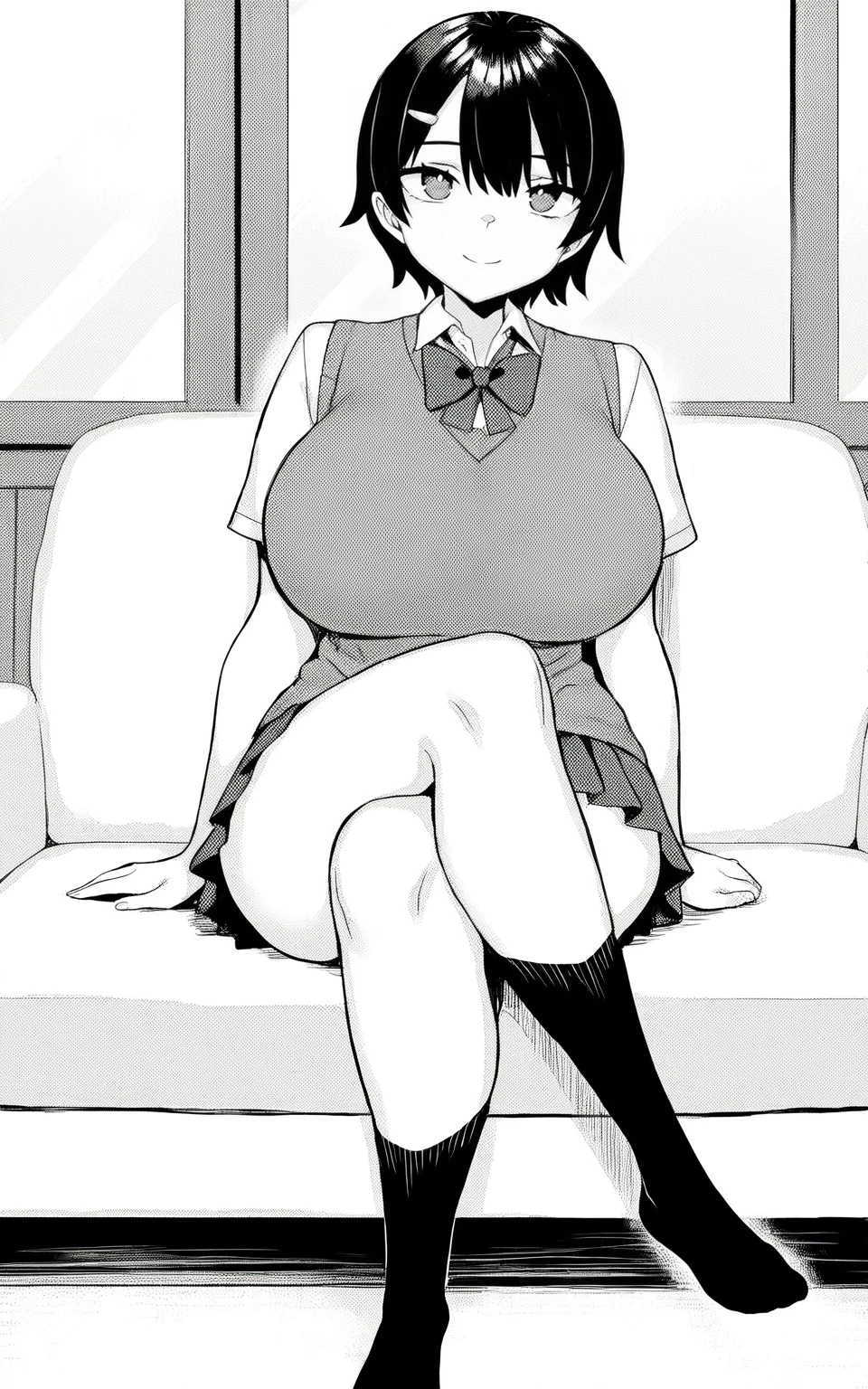 hhsukuru outfit, breasts, short hair, bangs, blue eyes, huge breasts, skirt, shirt, black hair, bowtie, school uniform, short sleeves, pleated skirt, hairclip, collared shirt, miniskirt, red bow, blue skirt, sweater vest, yellow sweater, socks, black socks, uwabaki