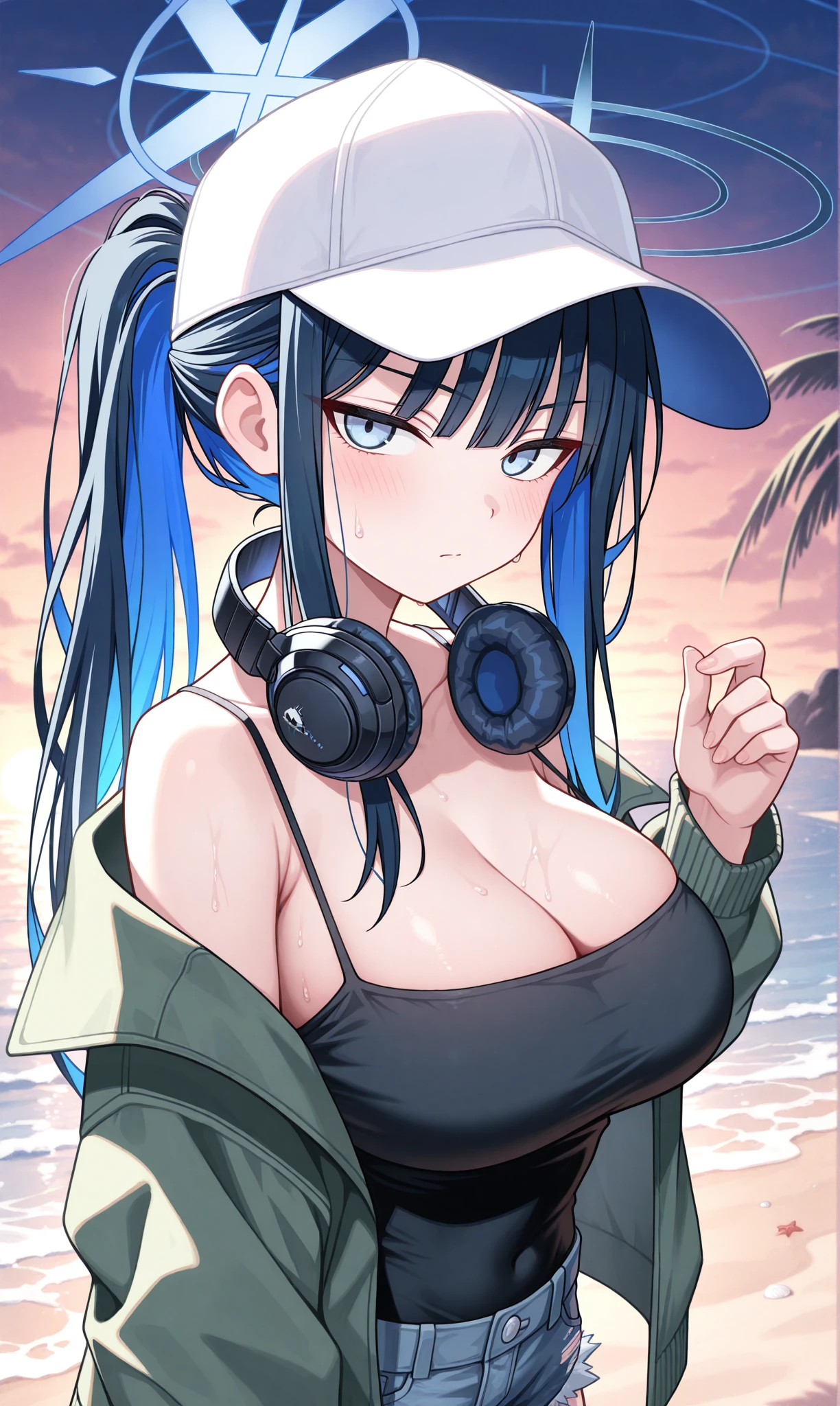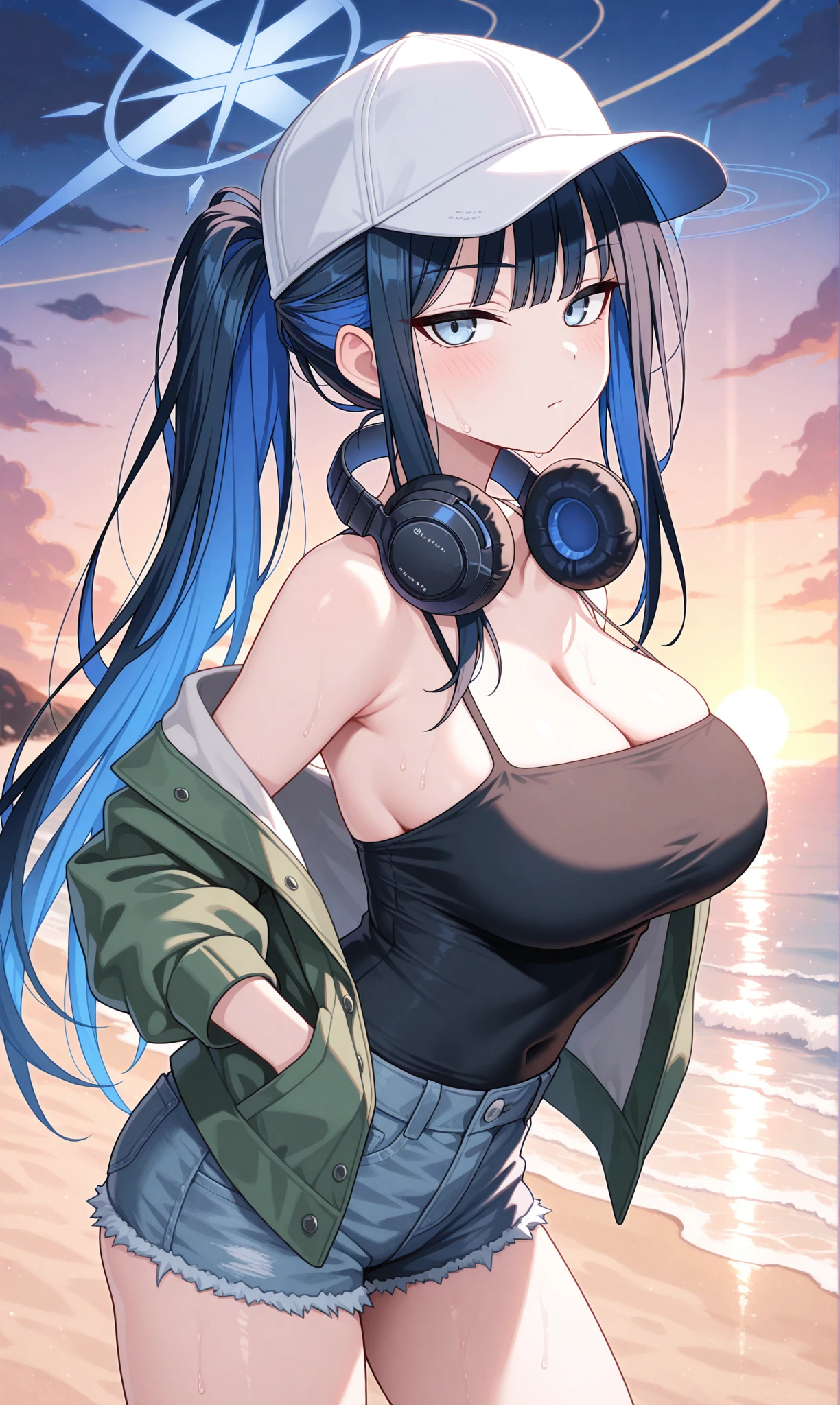 saori (blue archive), blue eyes, halo, baseball cap, multicolored hair, blue halo, long hair, colored inner hair, ponytail, white cap, black shirt, spaghetti strap, green jacket, open jacket, headphones around neck, denim shorts