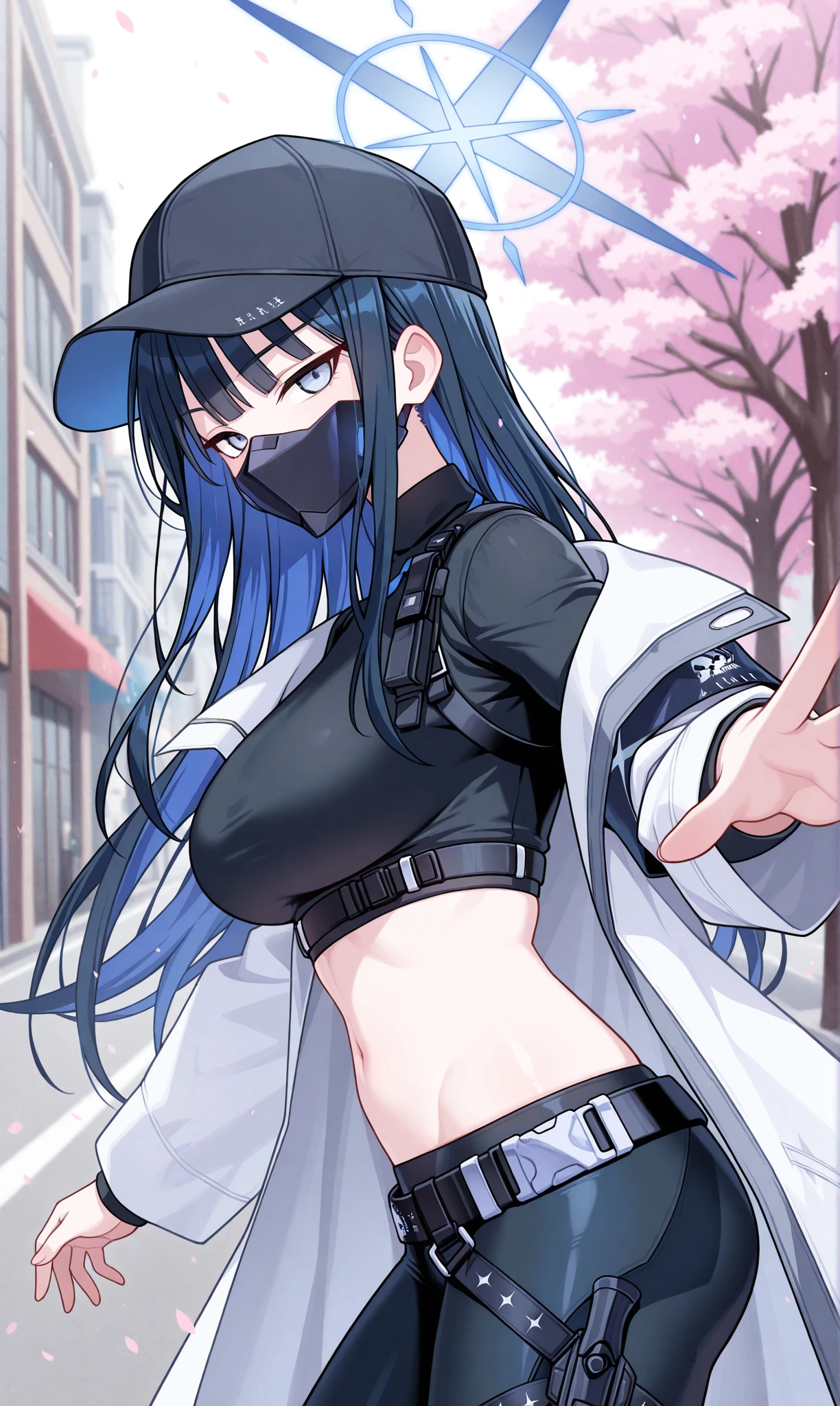 baseball cap, black cap, mouth mask, mask, black crop top, black pants, tight pants, belt, white coat, open clothes, long sleeves, armband
