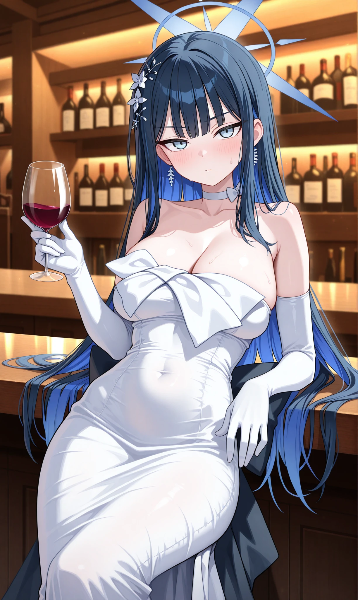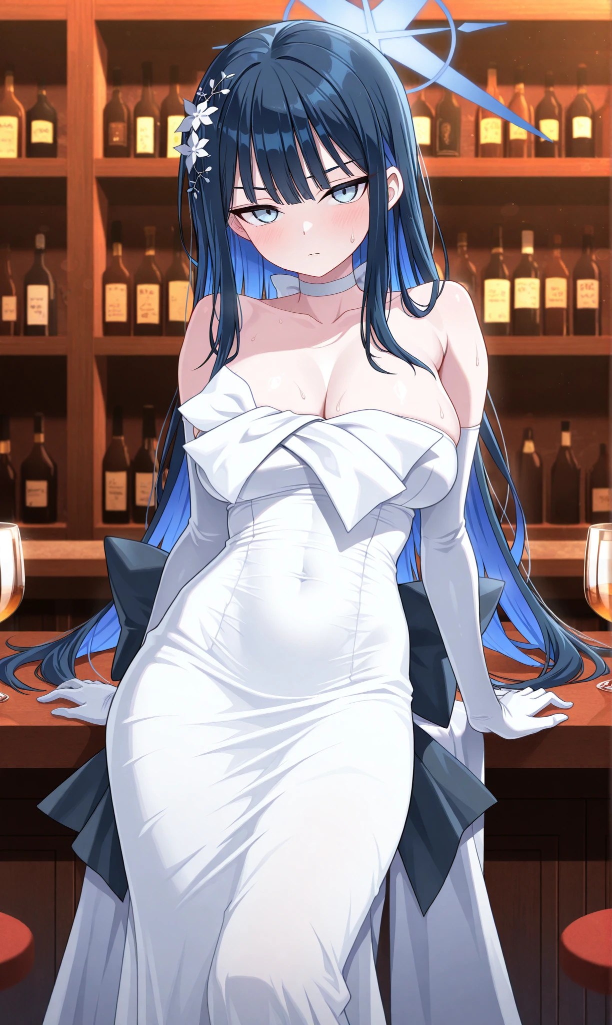 saori (blue archive), blue eyes, halo, multicolored hair, blue halo, long hair, colored inner hair, white dress, strapless dress, elbow gloves, white gloves, black bow, long dress, hair ornament, white choker