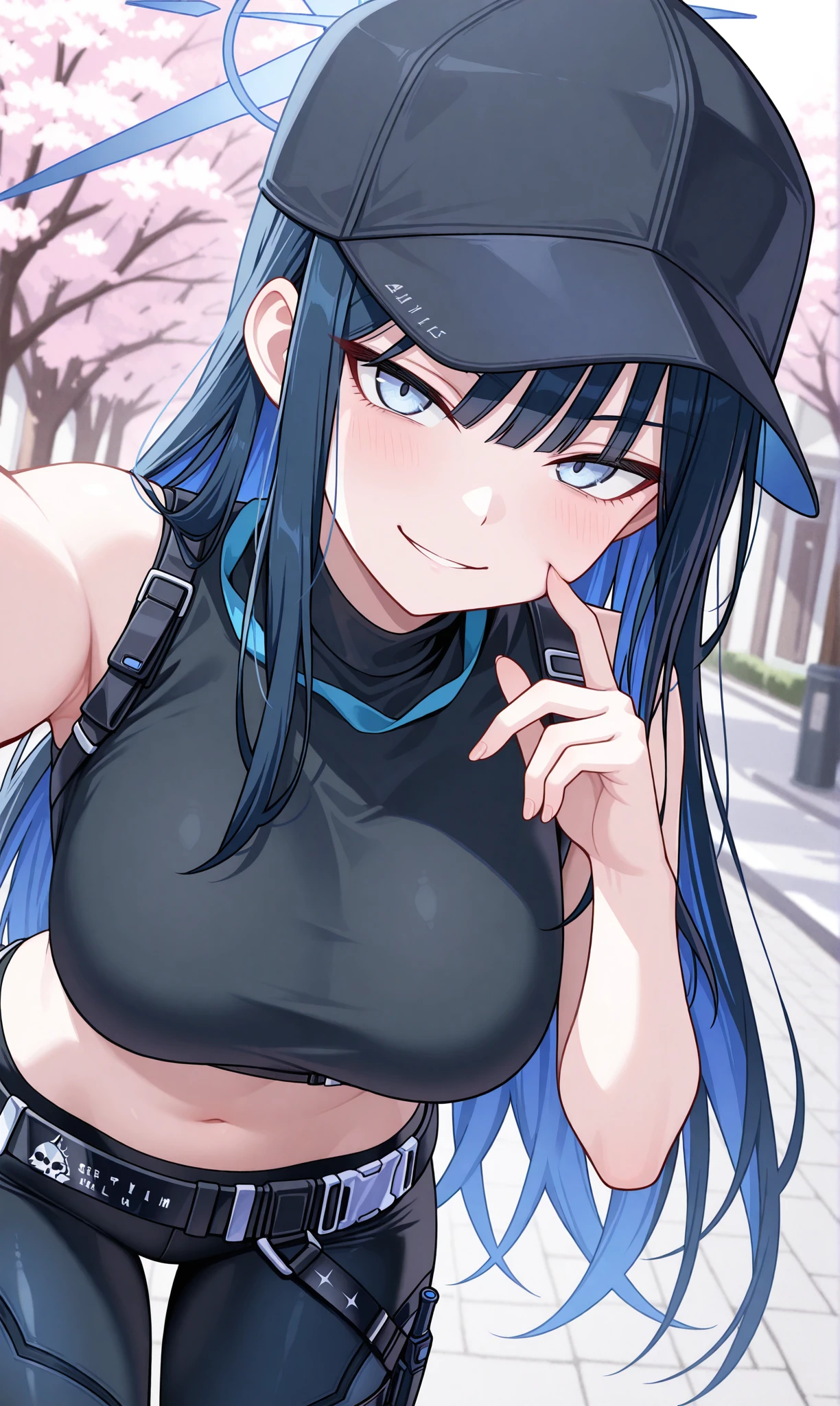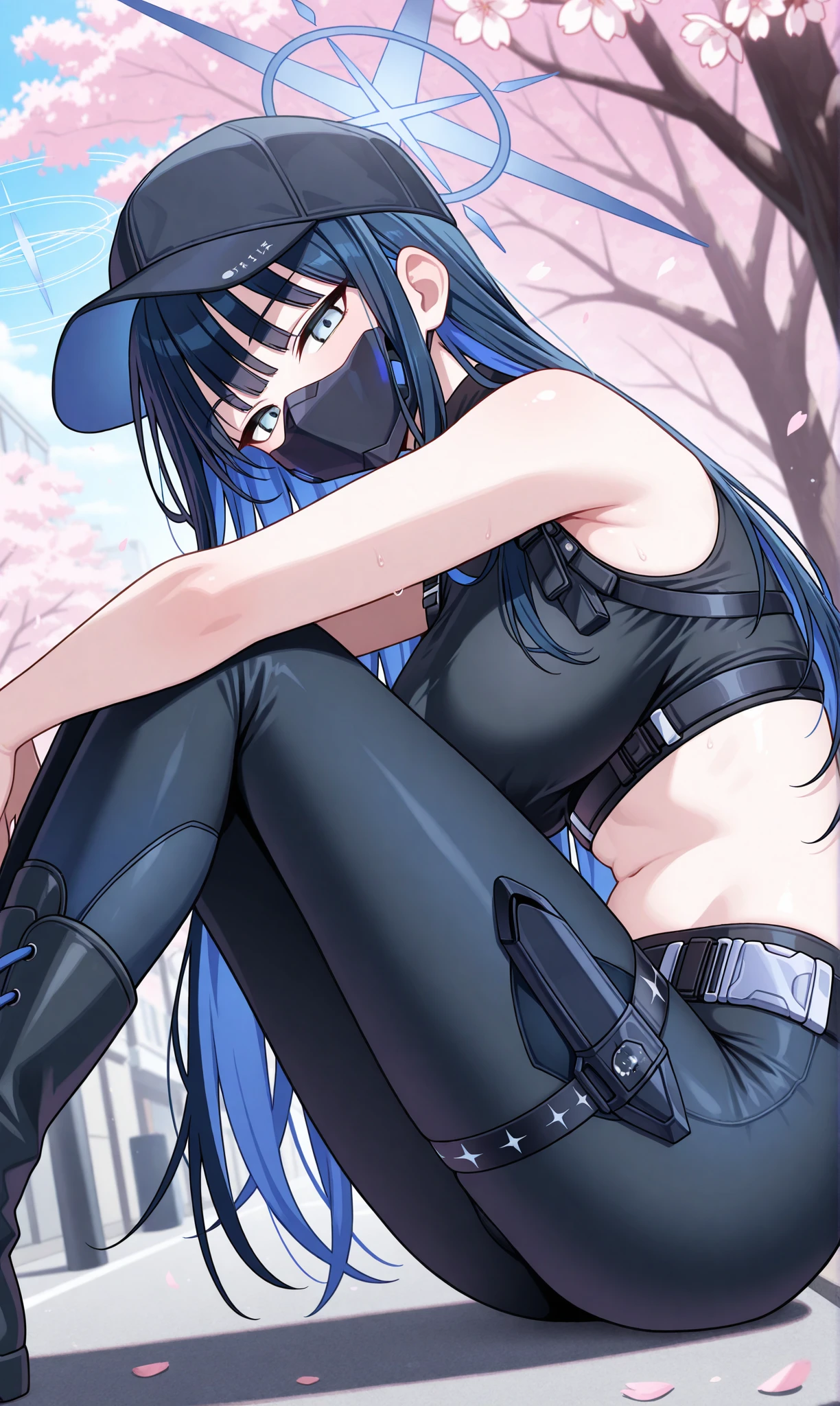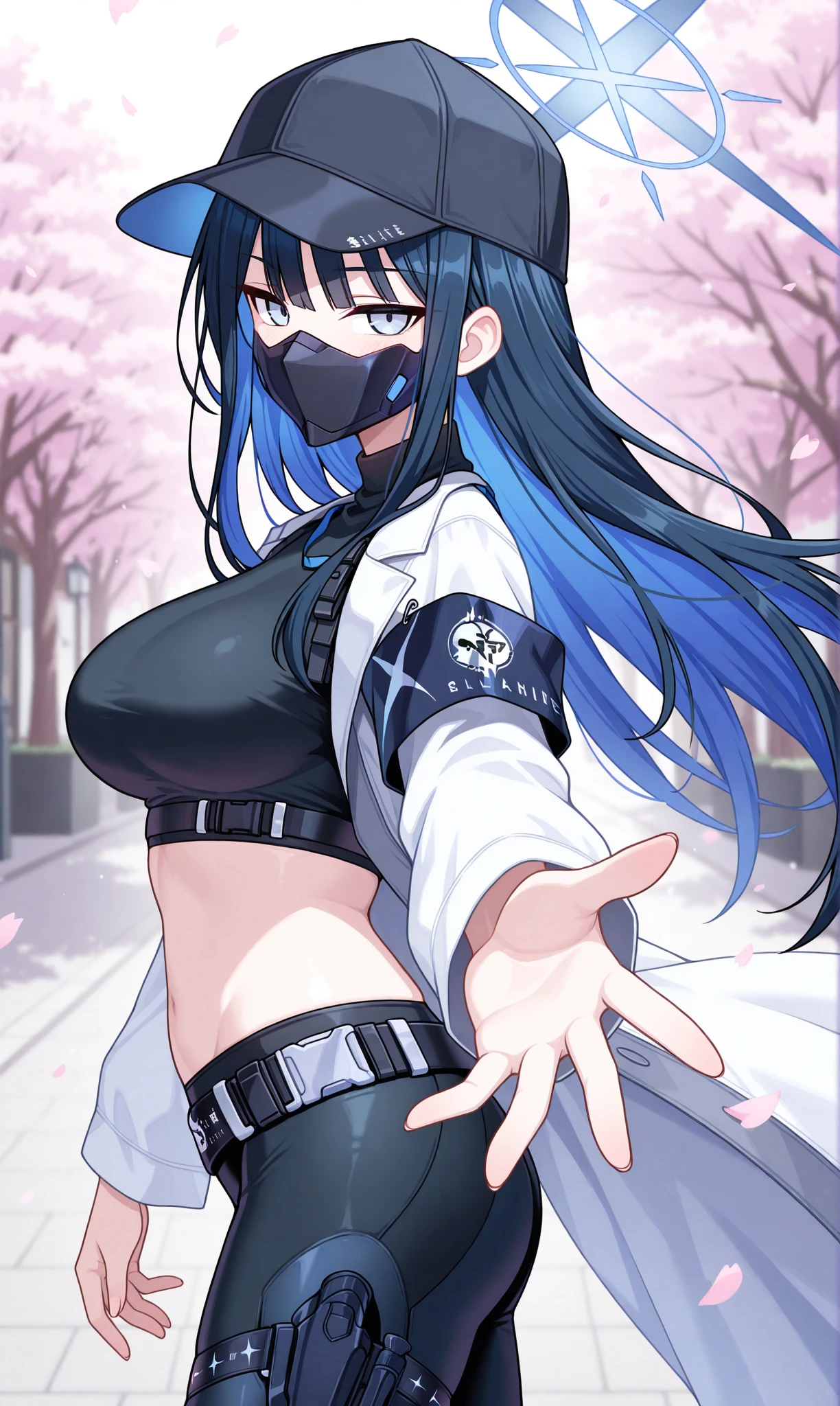 baseball cap, black cap, mouth mask, mask, black crop top, black pants, tight pants, belt, white coat, open clothes, long sleeves, armband saori (blue archive), blue eyes, halo, baseball cap, multicolored hair, blue halo, long hair, colored inner hair, ponytail, white cap, black shirt, spaghetti strap, green jacket, open jacket, headphones around neck, denim shortssaori (blue archive), blue eyes, halo, multicolored hair, blue halo, long hair, colored inner hair, white dress, strapless dress, elbow gloves, white gloves, black bow, long dress, hair ornament, white chokerDescription