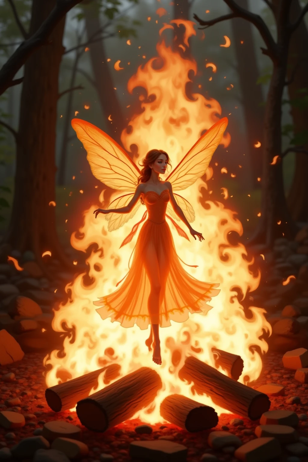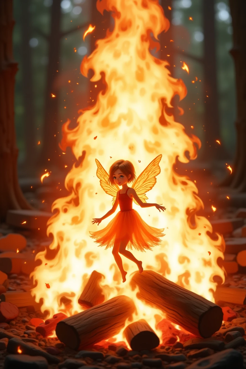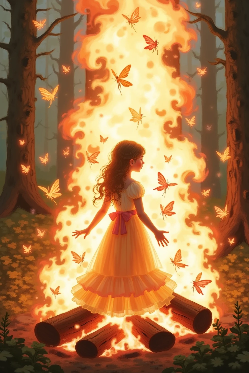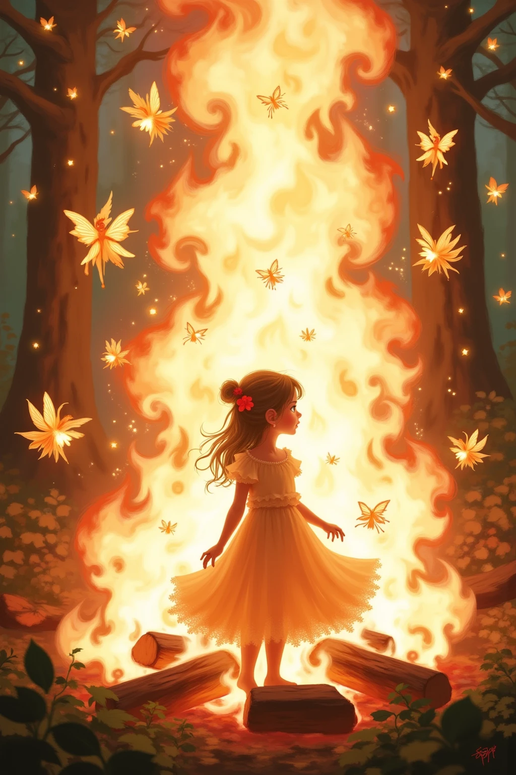 焚火の中の小さな妖精たち、火が明るく燃え、炎は天井まで届き、暖かいオレンジ色の輝きを周囲に投げかけています。赤いドレスを着た子供と暗い色の服を着た子供の2つのシルエットが、山の丸太の上に立っており、そのシルエットは炎に照らされています。背景は濃い赤で、炎の明るいオレンジ色と対照的で、奥行きと神秘的な感覚を生み出しています。画像のスタイルは絵画を彷彿とさせ、子供と火に焦点を当てています。