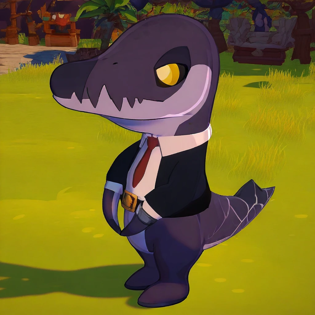 Malik, male, Kronosaurus, reptile, violet skin, yellow eyes, flippers, watch, white shirt, blazer, red tie, belt,