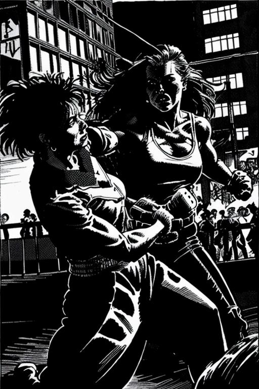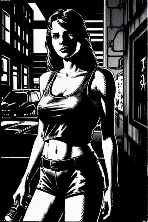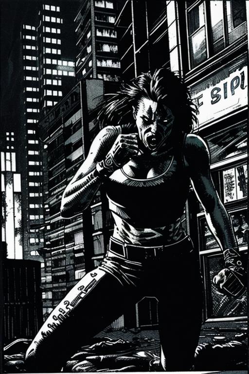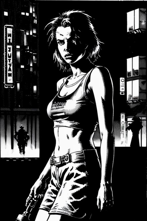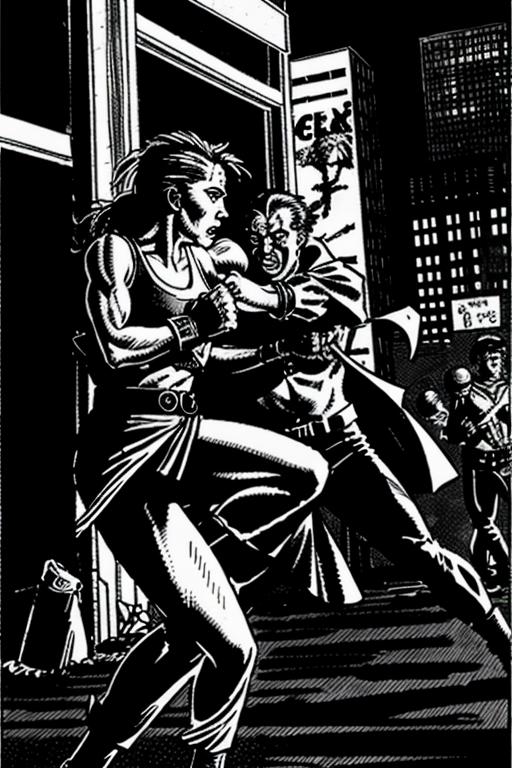 Envisioning a dystopian cyberpunk future ruled by a fusion of man and machine, dreaming up how such a world would look and feel. Back in the late 1980s and early 90s, an exciting new world opened up with RPG's like Shadowrun. Those books' imagery took the reader into a dystopian future by illustrating the cyberpunk world with high contrast, messy and partially disturbing black-and-white ink images. This unique style was used by various artists during that time, just before the advent of computer-aided drawing tools. This model is trained on imagery and drawing techniques employed during that period.