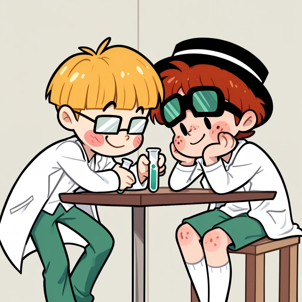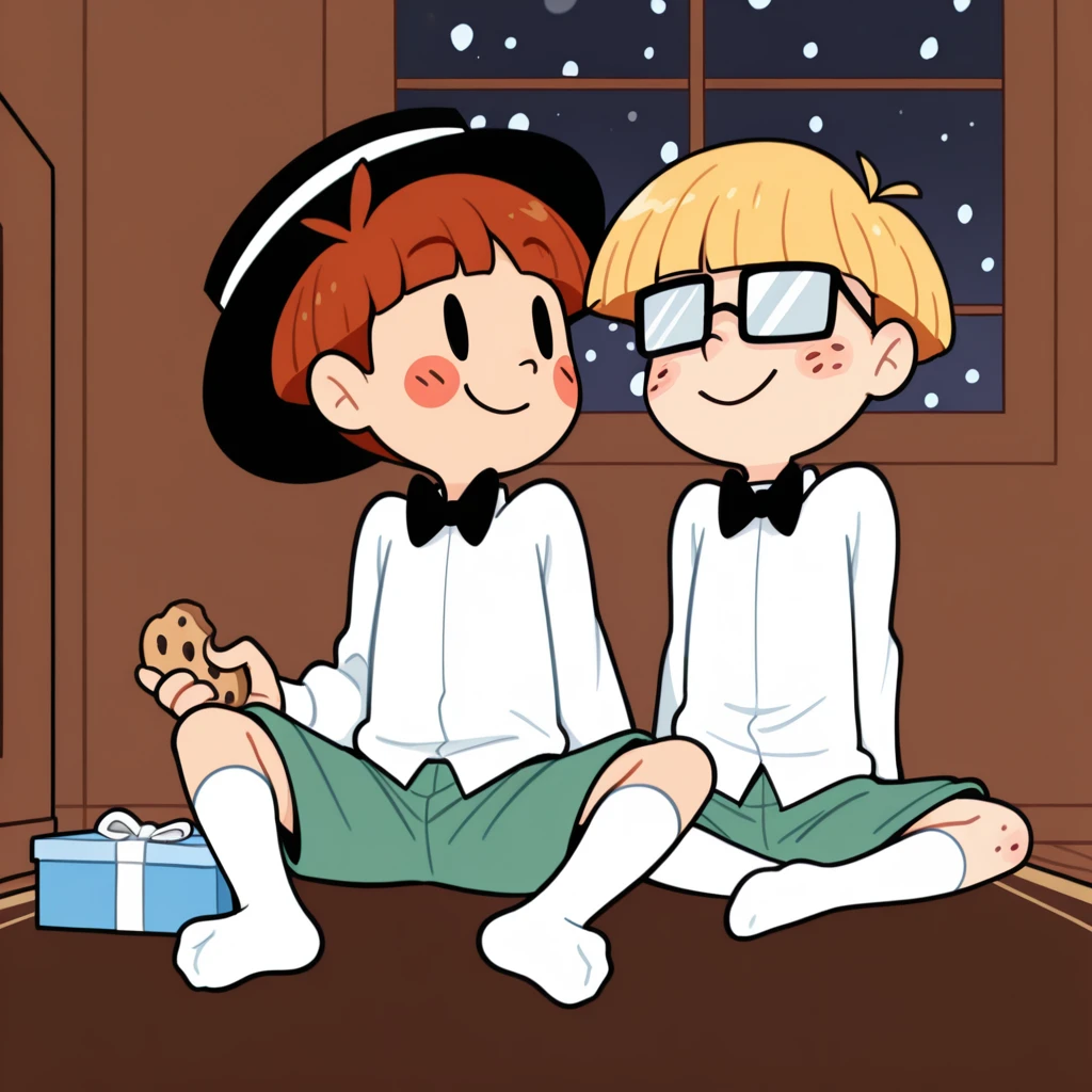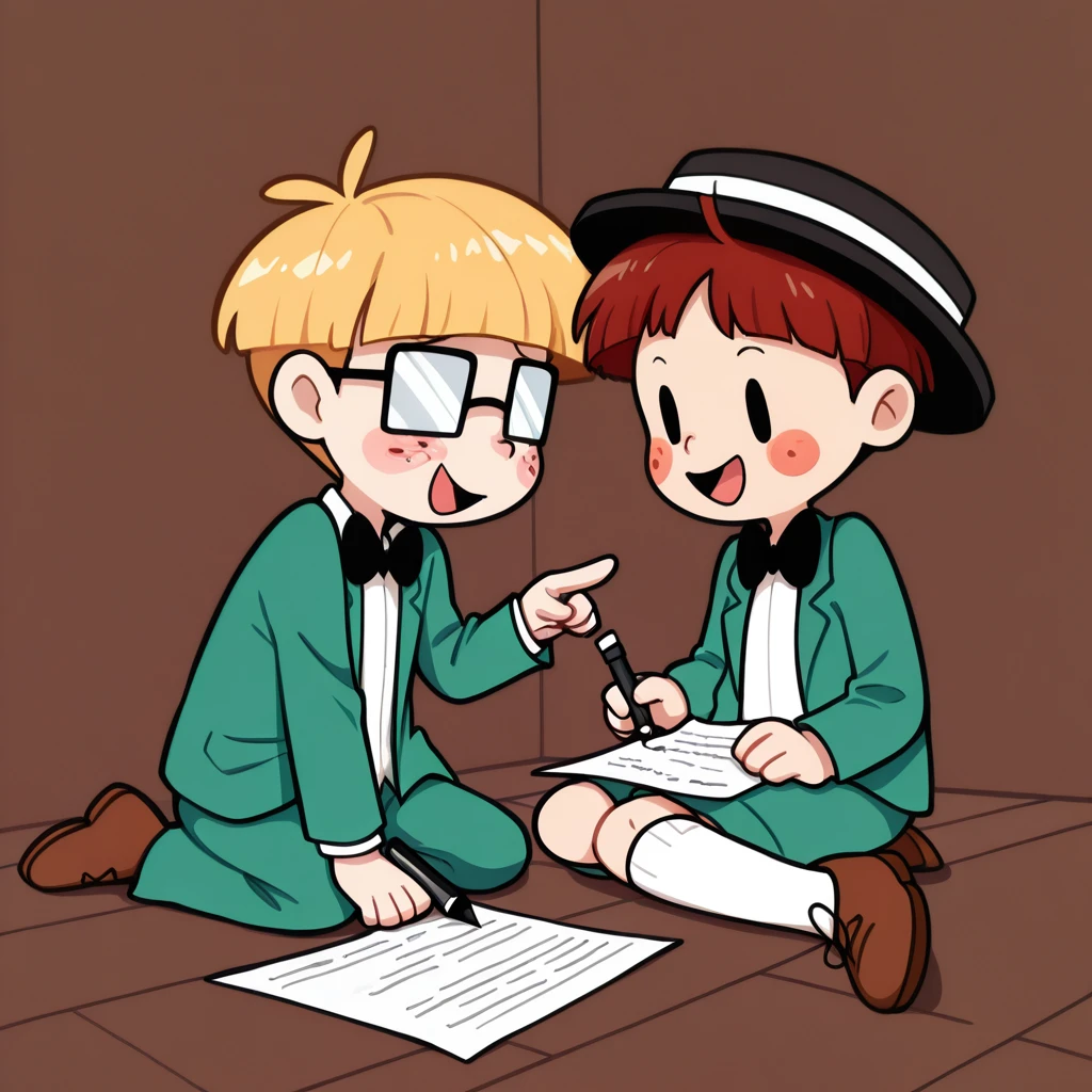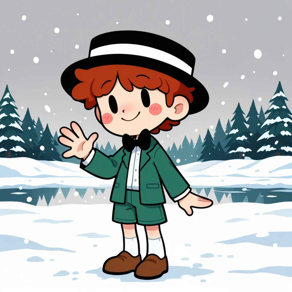 black boater hat,white ribbon on hat,black bowtie,white shirt,green jacket,green shorts,white kneehighs,brown shoes