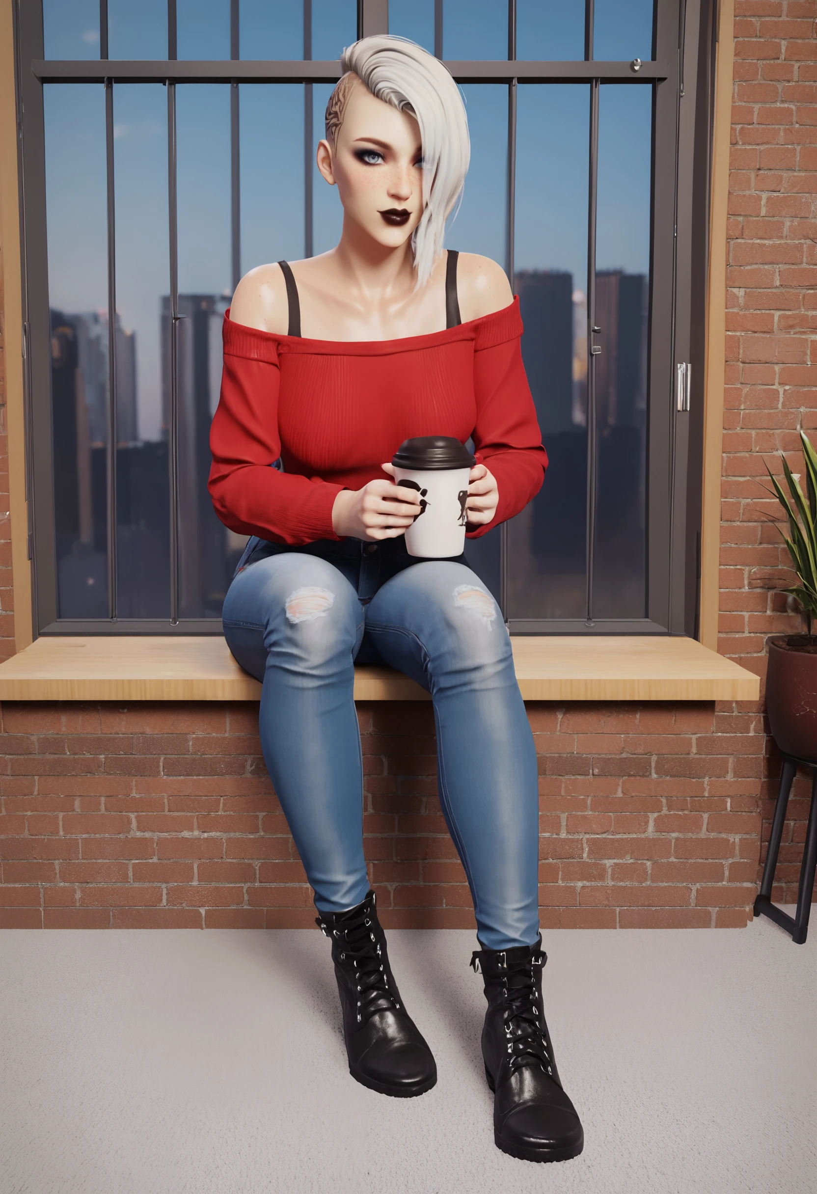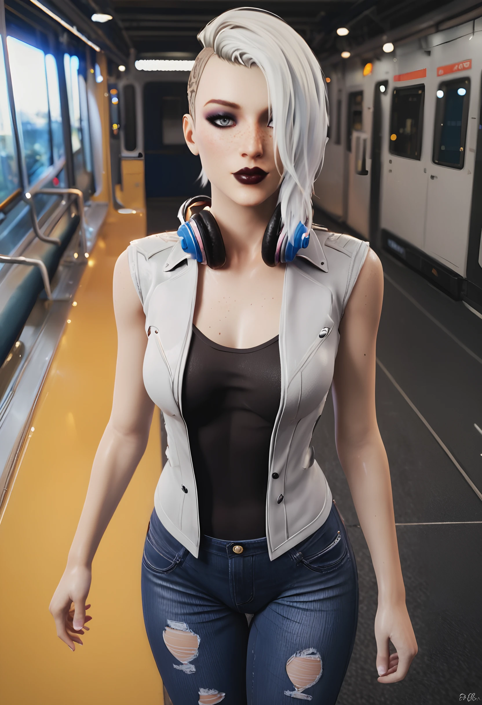 identity: "short hair, white hair, asymmetrical hair, hair over one eye, shaved head, head tattoo, grey eyes, eyeshadow, eyeliner, dark lipstick, freckles, pale skin"