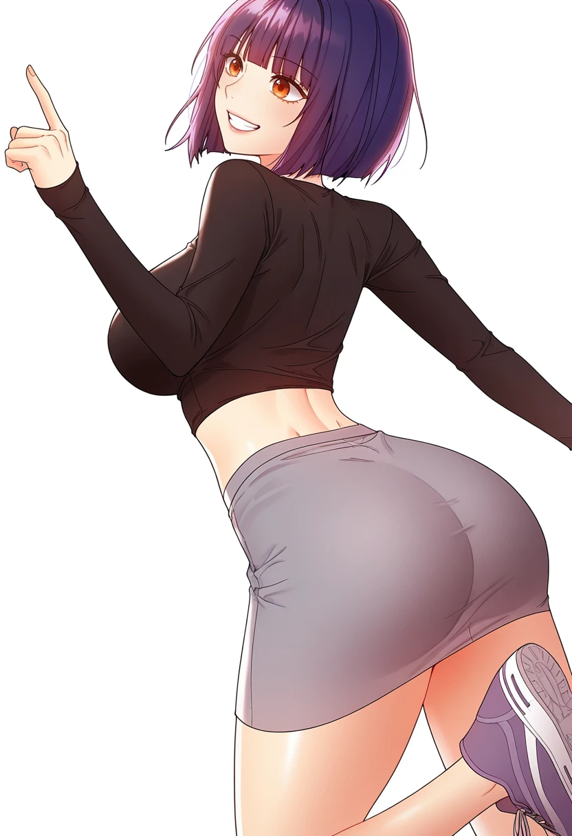 black shirt, midriff,long sleeves, grey skirt, sneakers,