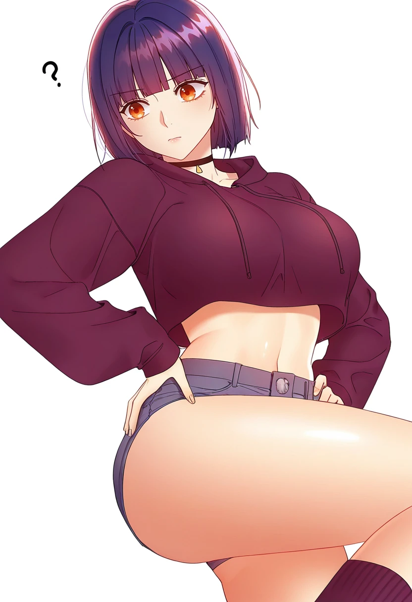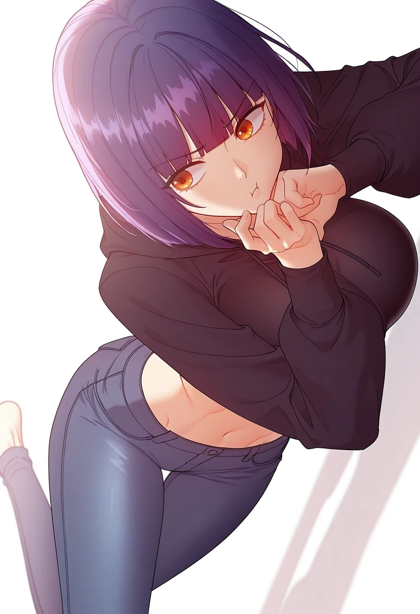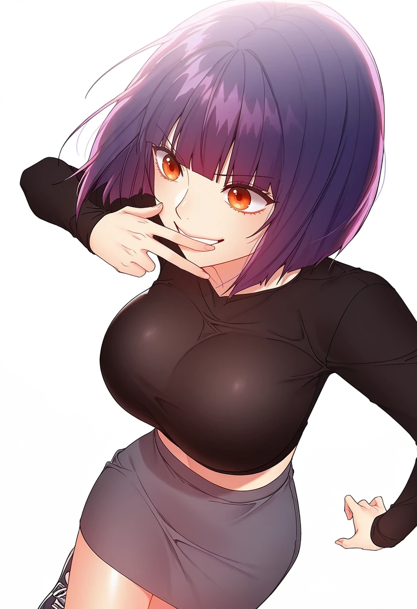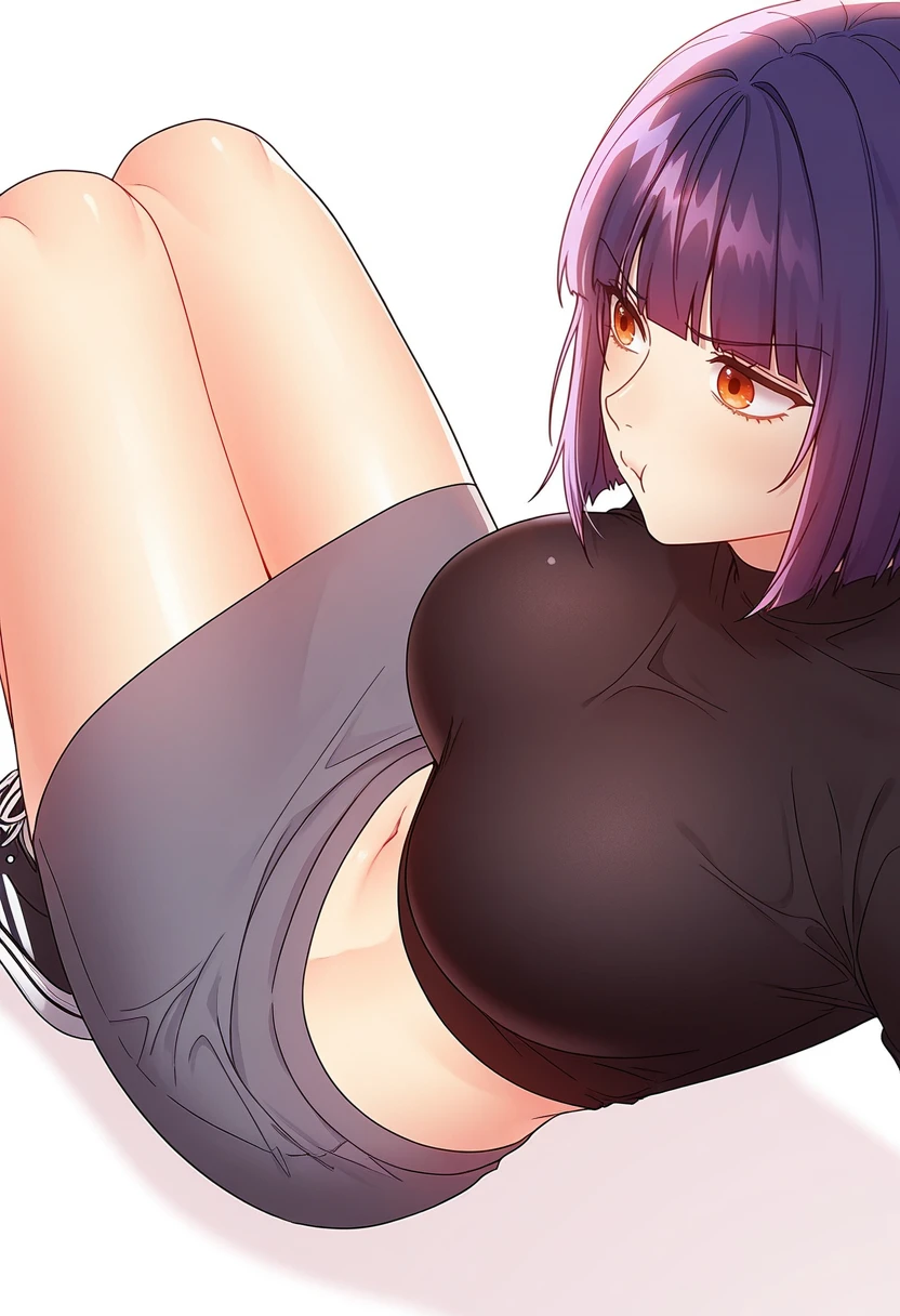 yuna_cnr, 1girl,short hair, purple hair, large breasts, orange eyes, bob cut, blunt bangs,