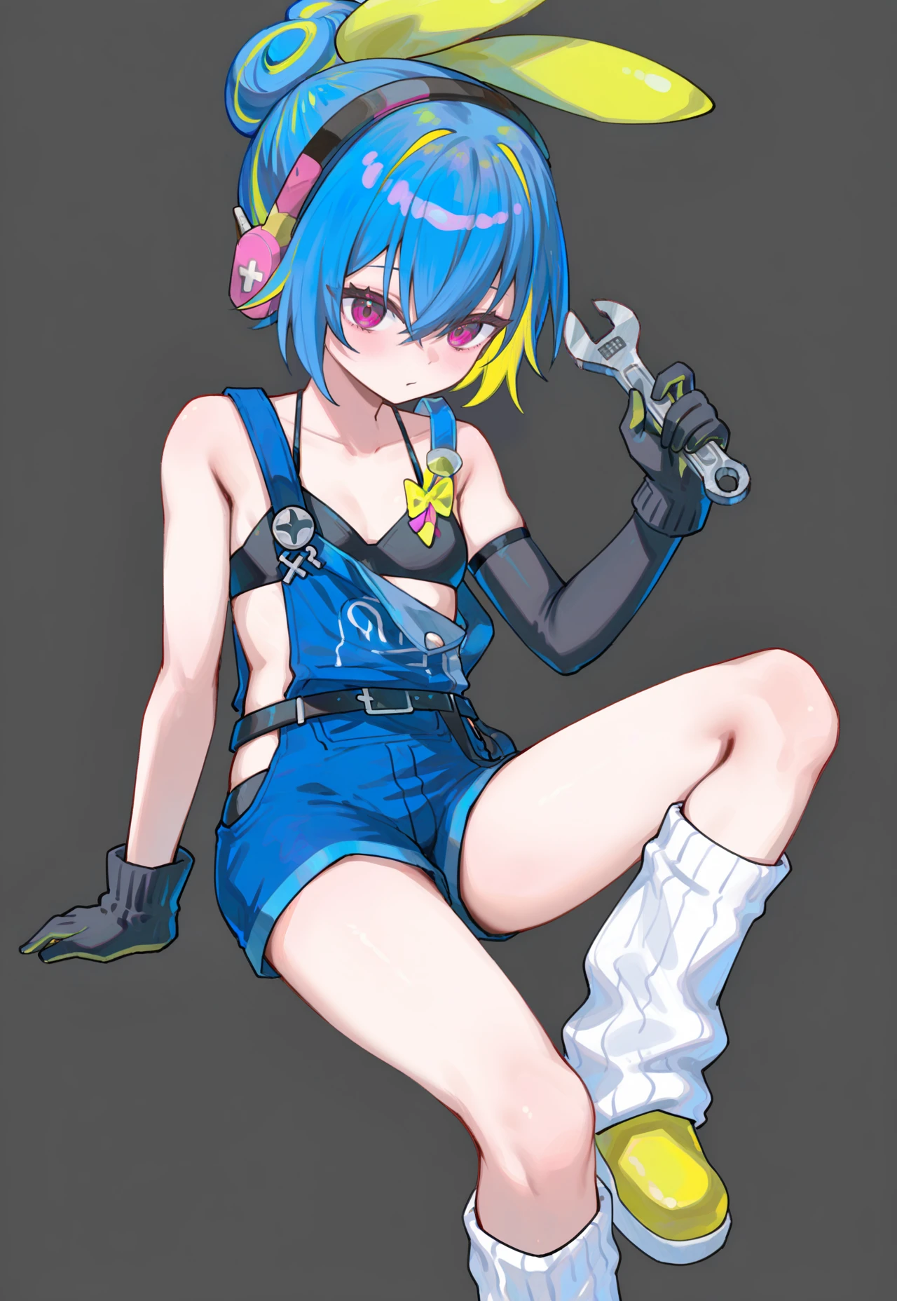 megasastralparty,megasastralpartywed,blue hair,hair between eyes,single hair bun,short hair,colored inner hair,pink eyes,headphones,yellow bow hairband婚皮 服装tag(负面请添加white socks)