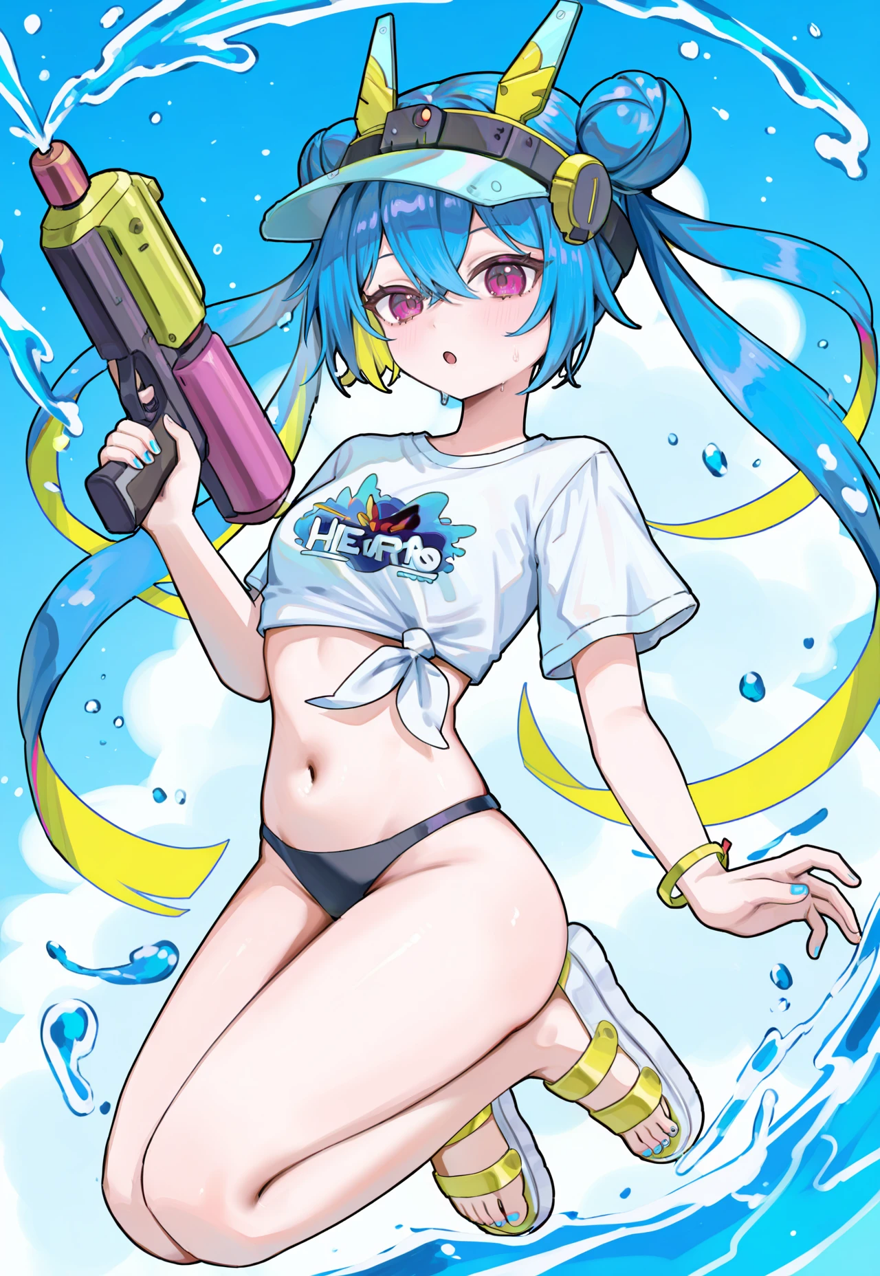 megasastralparty,megasastralpartyswim,blue hair,hair between eyes,double bun,long hair,twintails,colored inner hair,pink eyes,visor cap,blue nails泳装 服装tag