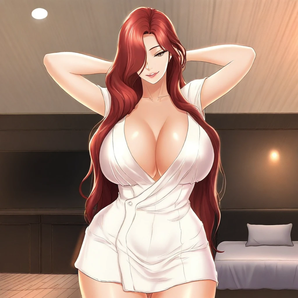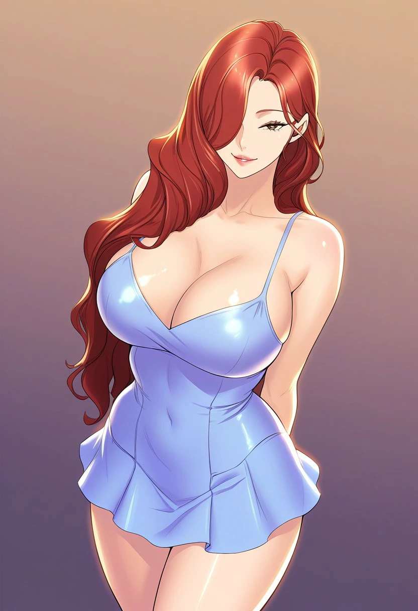 (( <lora:chae-hee:1> , chae-hee, thin waist, wide hips, beautiful skin, piercing brown eyes, clear eyes, bright pupils, beautiful eyes, beautiful redhair, beautiful long hair, hair over one eyes, huge and shaggy breasts, natural beauty, extraordinary beautiful woman, attractive woman, super sexy woman, lustful body, sexy woman with seductive obscene body, sensual body, voluptuous body, sexy beauty, no piercings, no piercing, ))