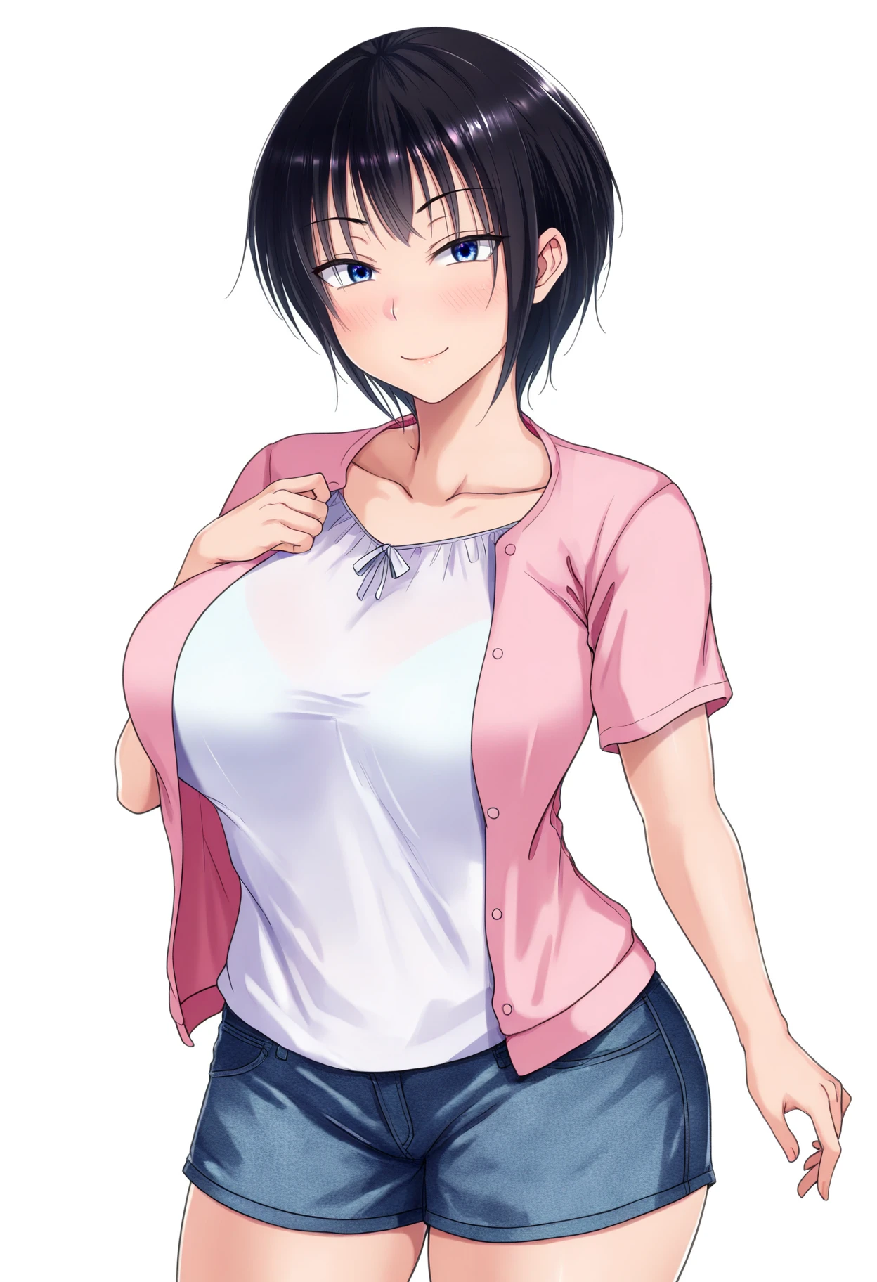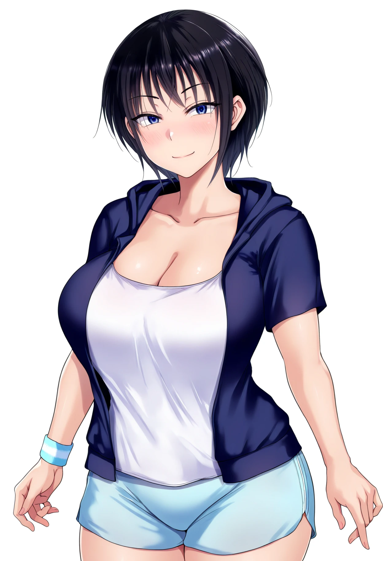 Casual outfit prompts : cleavage, collarbone, white shirt, blue hooded jacket, open jacket, short sleeves, blue short shorts